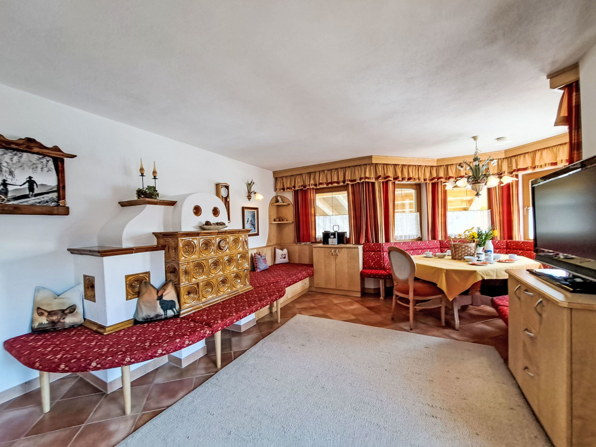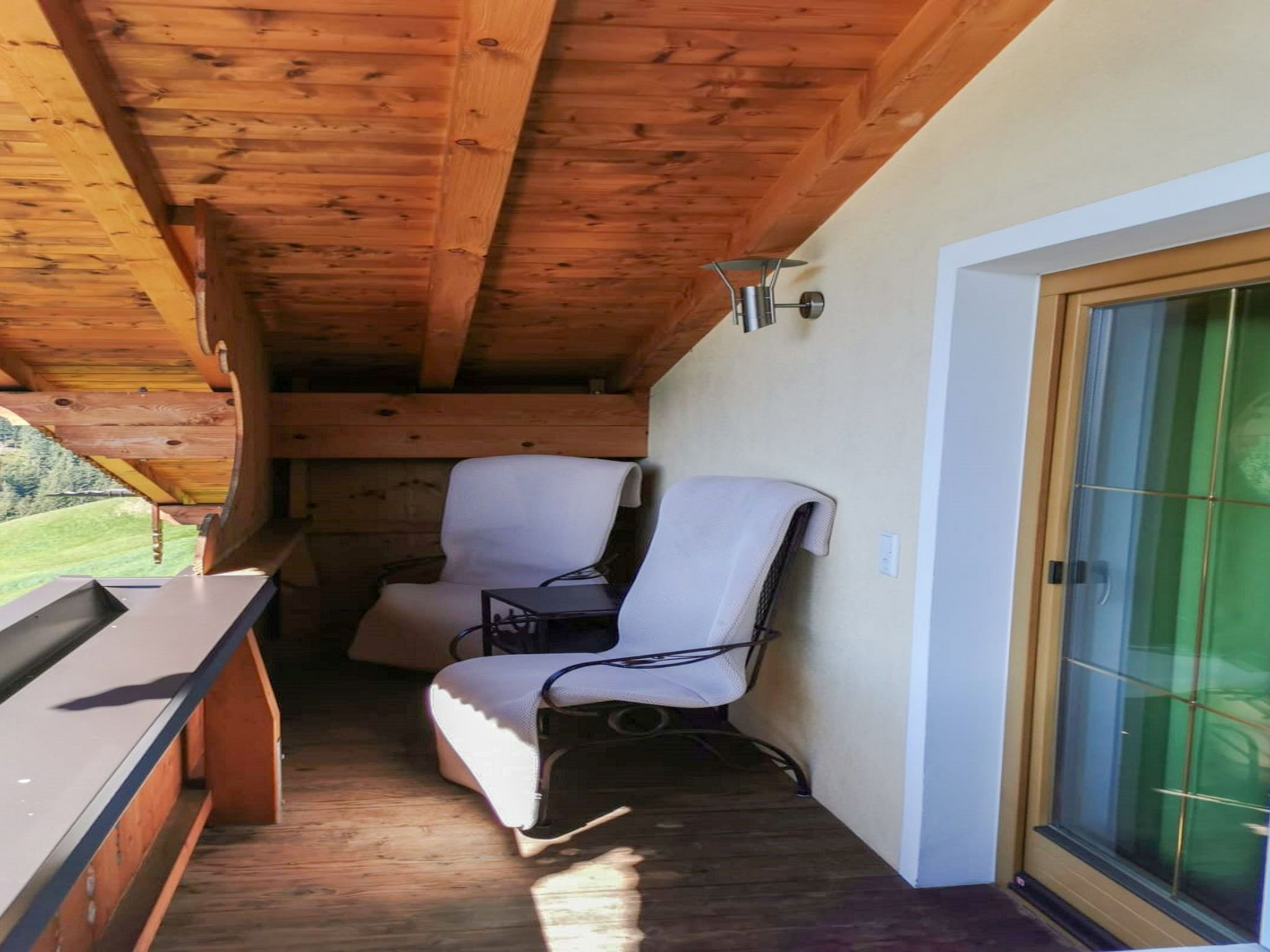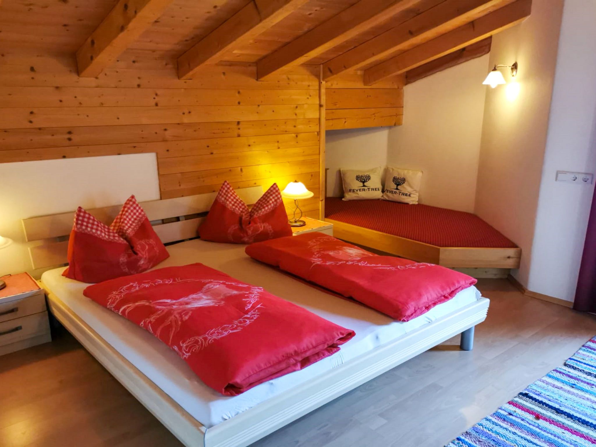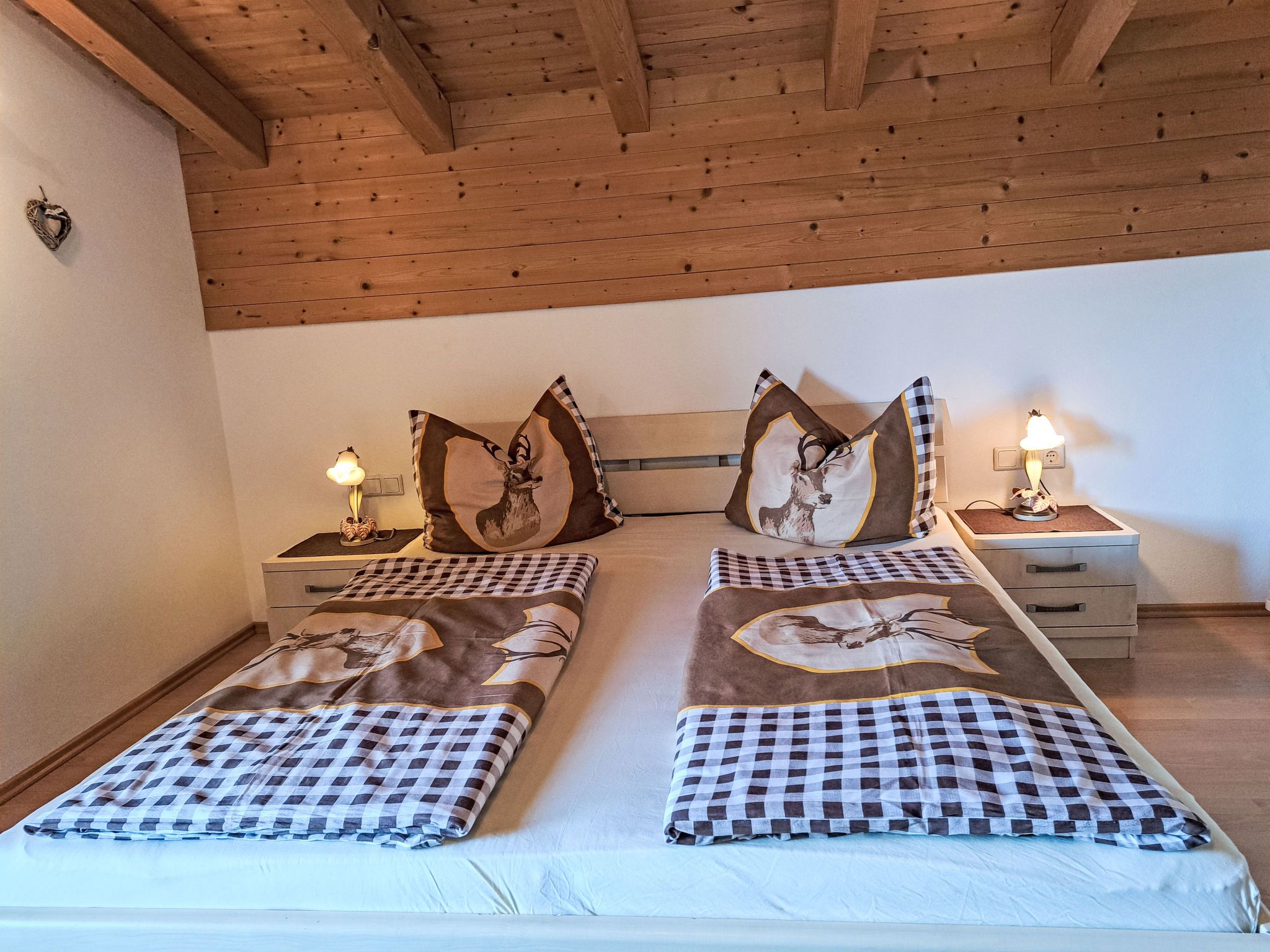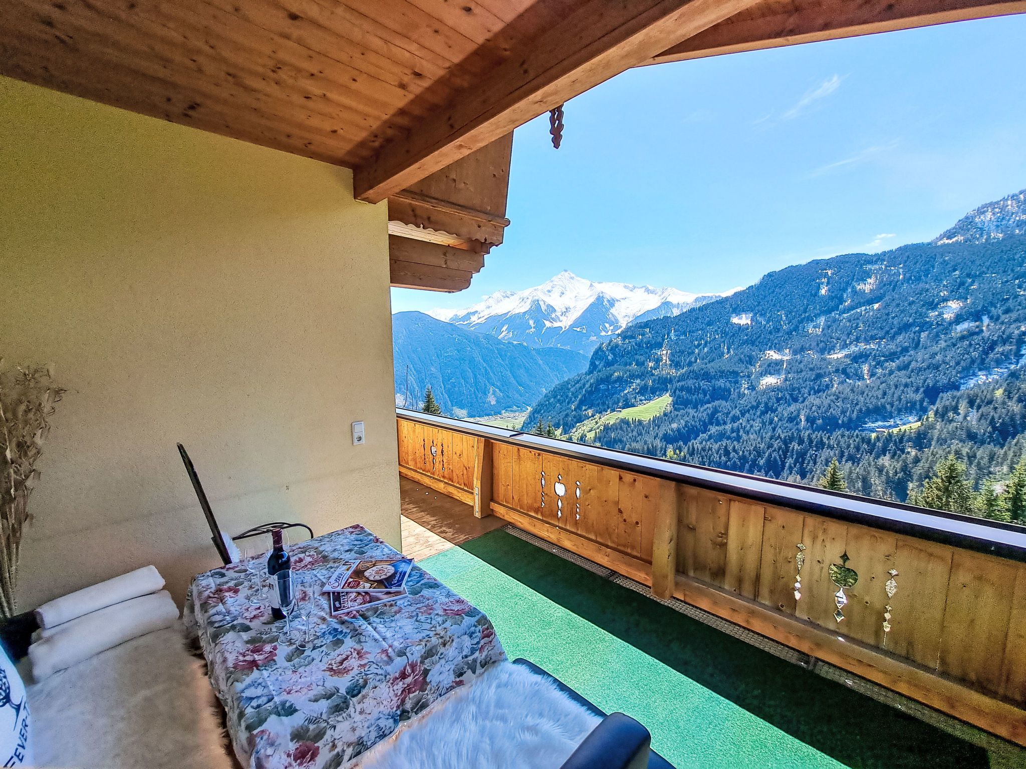 Reichegger, 3-Zimmer-Haus. Wohn-/Esszimmer mit Essecke, Sat-TV und Radio. Ausgang zum Balkon, zur Terrasse. Offene Küche (Backofen, Geschirrspüler, 4 Glaskeramikplatten, Toaster, Wasserkocher, Mikrowelle, Tiefkühler, elektrische Kaffeemaschine). Sep. WC. Fussbodenheizung. Obergeschoss: 1 Zimmer mit 1 Bett (97 cm, Länge 195 cm), 1 Doppelbett. Ausgang zum Balkon. 1 Doppelzimmer. Ausgang zum Balkon. Dusche/WC. Ölheizung, Fussbodenheizung. Balkon 15 m2, Terrasse. Terrassenmöbel, Balkonmöbel. Herrliche Panoramasicht. Zur Verfügung: Sauna (extra). Internet (WLAN, gratis). Bitte beachten: Nichtraucher-Haus. Rauchmelder, Feuerlöscher. Beide Zimmer im Obergeschoss haben eine Dachschräge mit sichtbaren Holzdachstuhl für Wohlfühlatmosphäre! Die Kaution ist in Bar am Anreisetag zu begleichen!