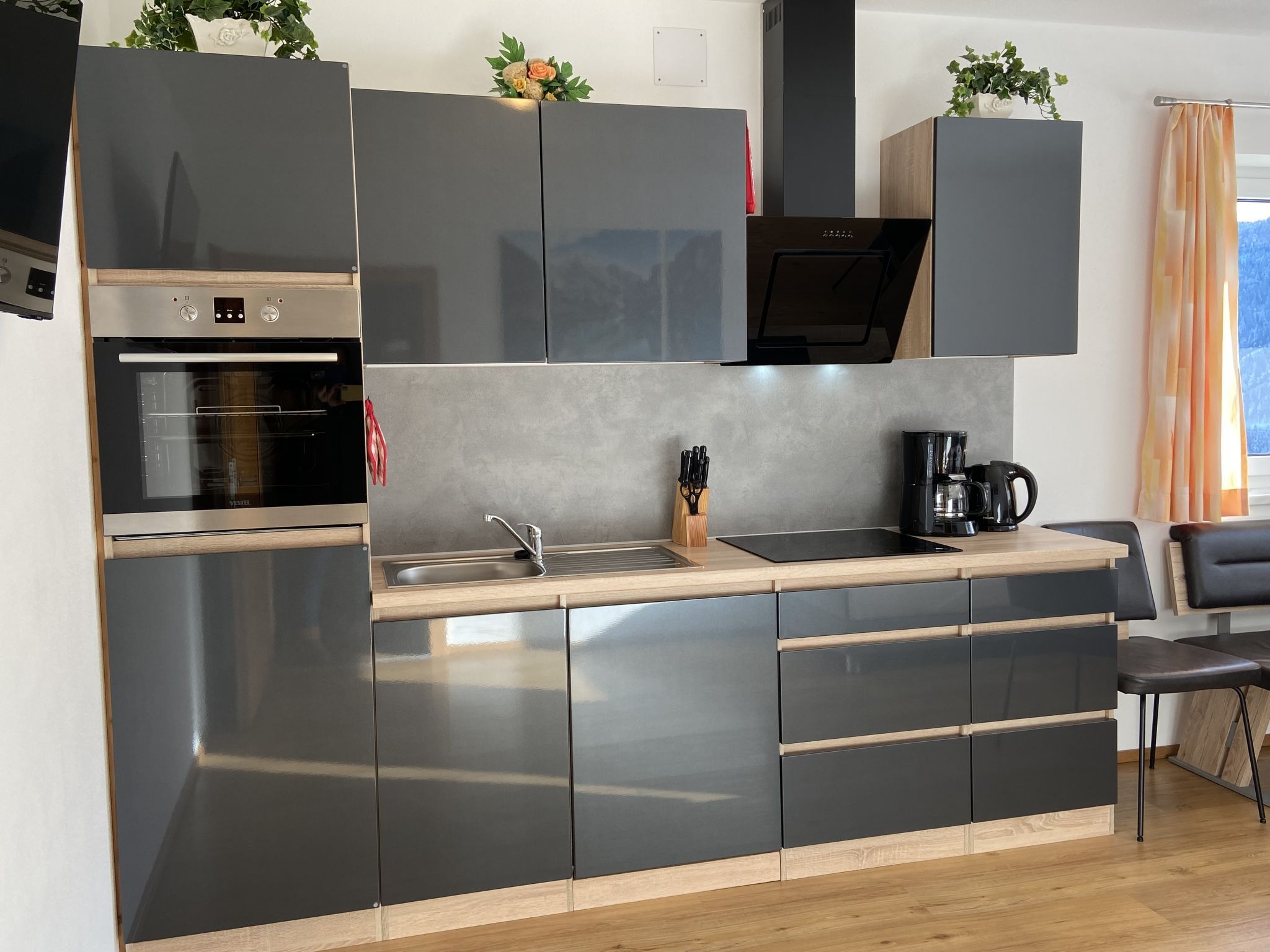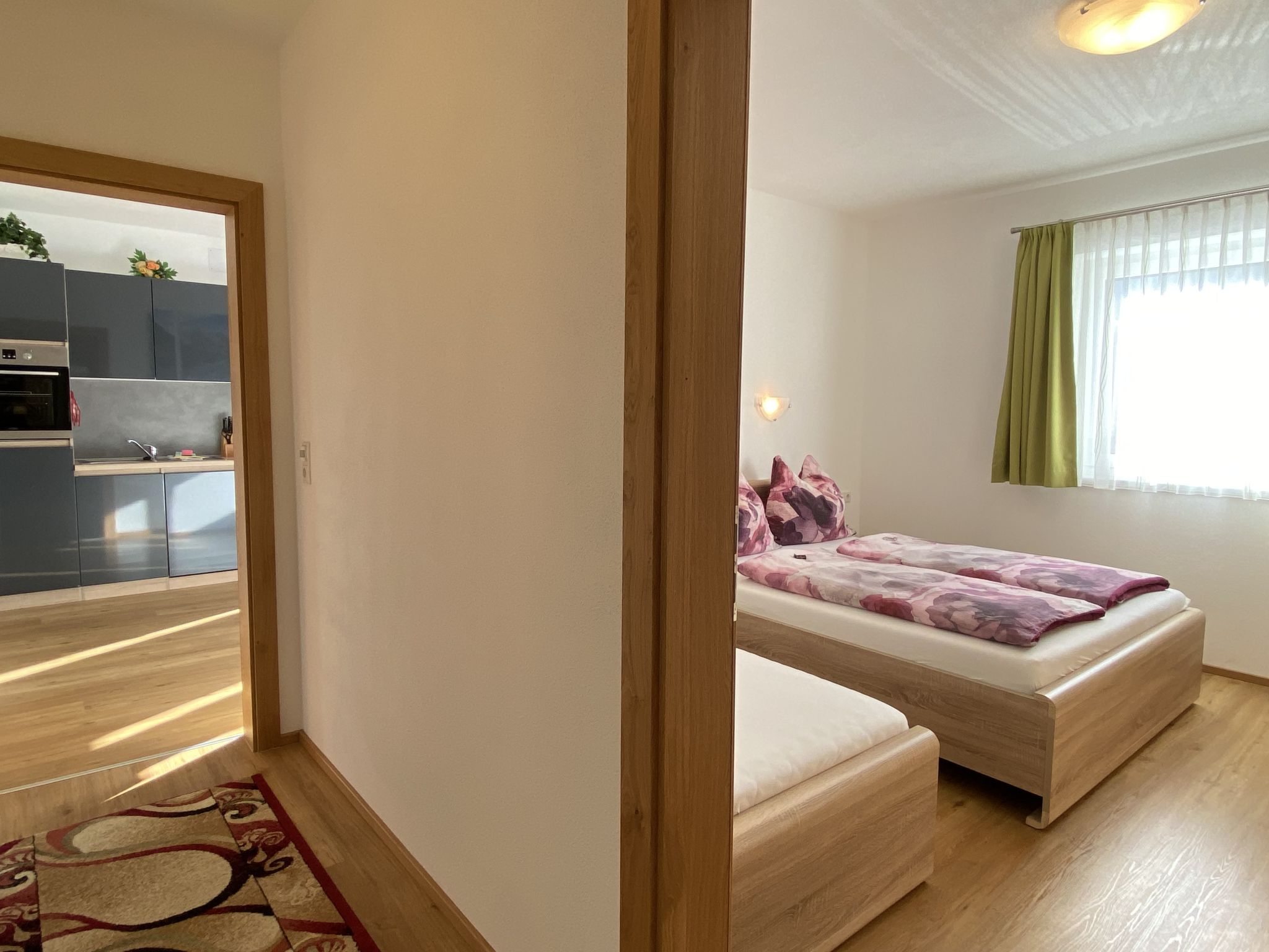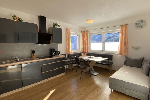 Schöser, 2-Zimmer-Wohnung 45 m2, im Erdgeschoss. Schön eingerichtet: 1 Zimmer mit 1 Bett, 1 Doppelbett, Dusche/WC und Sat-TV. Wohnküche (Backofen, Geschirrspüler, 4 Glaskeramikplatten, Toaster, Wasserkocher, Tiefkühler, elektrische Kaffeemaschine) mit Essecke, Sat-TV und Flachbildschirm. Fussbodenheizung. Gartensitzplatz, Garten 100 m2. Panoramasicht. Zur Verfügung: Internet (Wireless LAN, gratis). Bitte beachten: Nichtraucher-Unterkunft. Rauchmelder.
