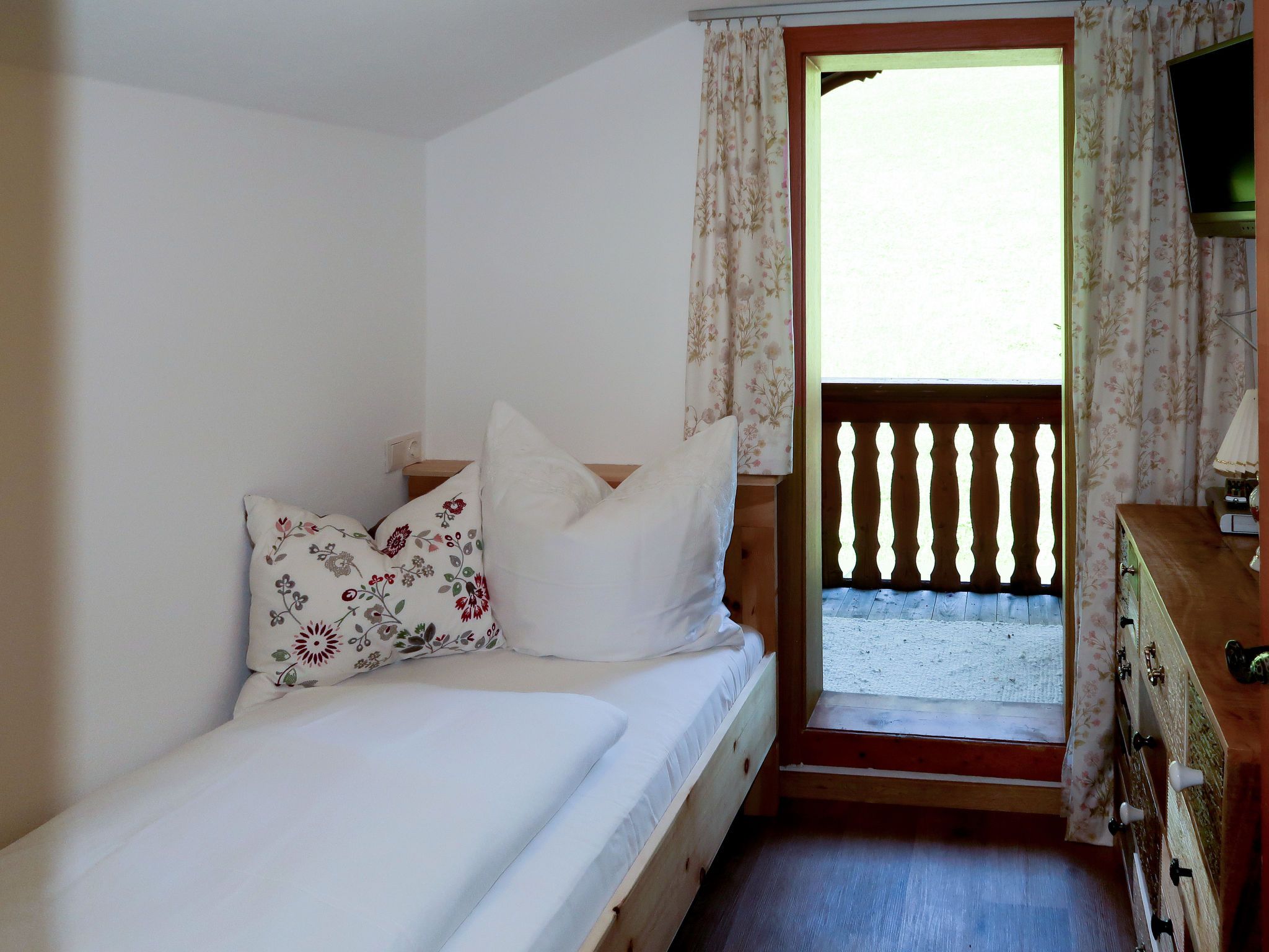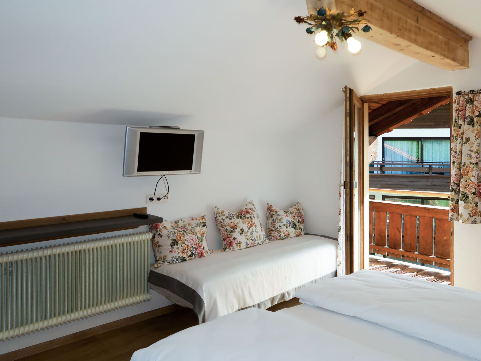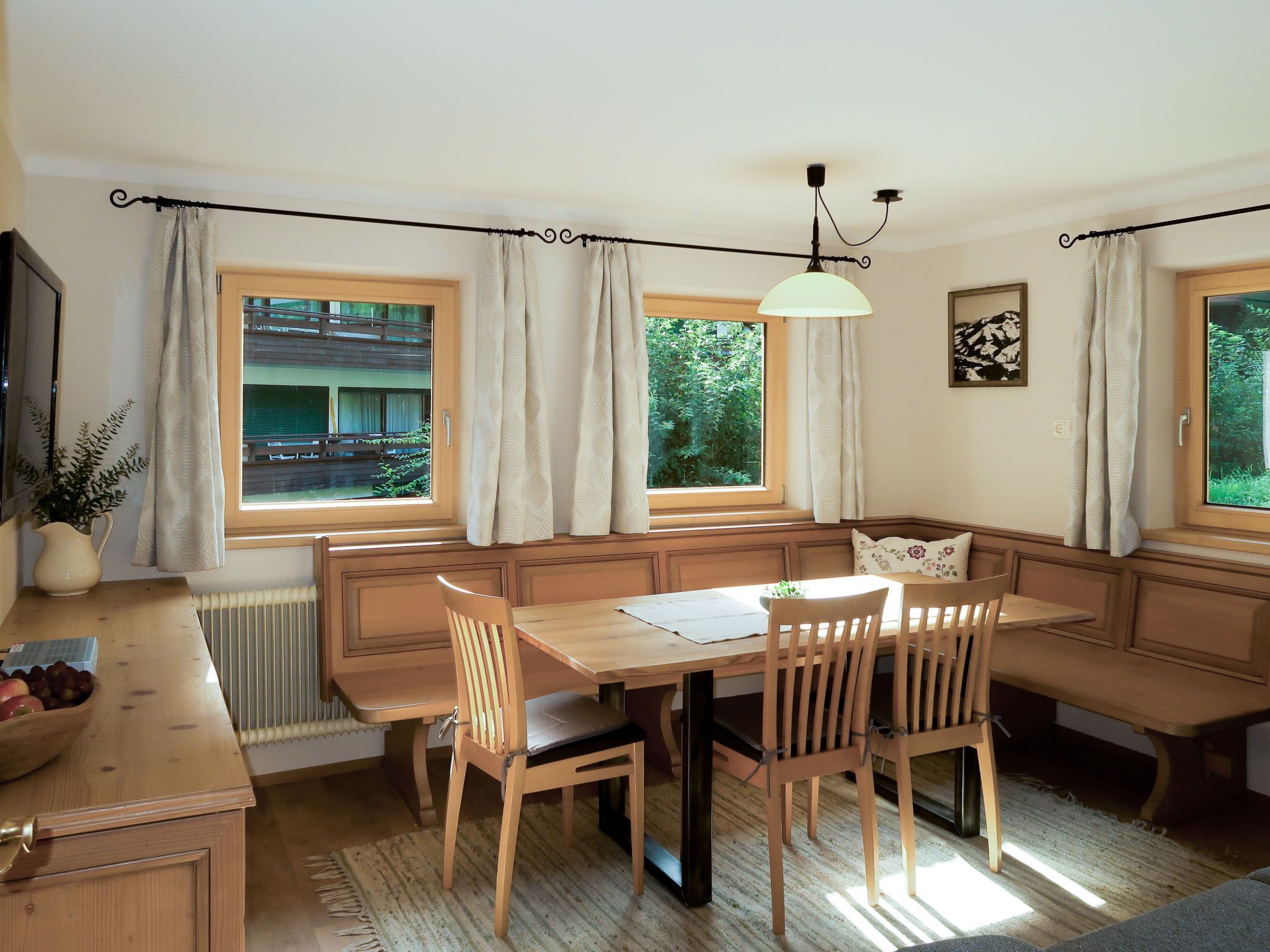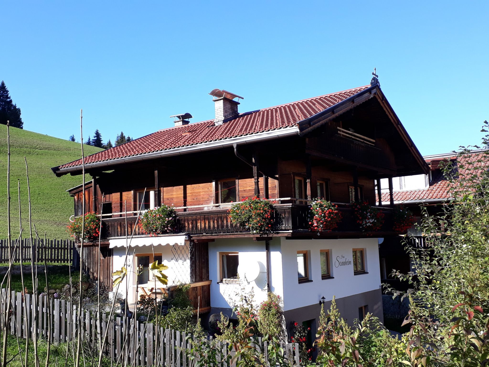Sonnheim, 6-Zimmer-Haus 140 m2 auf 3 Stockwerken. Geräumig und hell, geschmackvoll und gemütlich eingerichtet: Wohn-/Esszimmer mit Essecke und Sat-TV (Flachbildschirm). 1 Doppelzimmer mit Waschbecken und Sat-TV (Flachbildschirm). Wohnküche (Backofen, Geschirrspüler, 4 Glaskeramikplatten, Toaster, Wasserkocher, Mikrowelle, elektrische Kaffeemaschine) mit Essecke. Ausgang zur Terrasse. Sep. WC. Obergeschoss: 1 Doppelzimmer mit Sat-TV. Ausgang zum Balkon. 1 Doppelzimmer mit Sat-TV. 2 Duschen, sep. WC, Doppelwaschbecken. 2. Obergeschoss: 1 abgeschrägtes Zimmer mit 1 Bett, 1 Doppelbett und Sat-TV. Ausgang zum Balkon. 1 abgeschrägtes kleines Zimmer mit 1 Bett. Ausgang zum Balkon. Ölheizung. 2 Balkone, grosse Terrasse teilweise überdacht. Terrassenmöbel, Balkonmöbel, Elektrogrill, Liegestühle (2), Abstellkammer. Sicht auf die Berge. Zur Verfügung: Babybett, Haartrockner. Internet (Wireless LAN, gratis). Bitte beachten: Nichtraucher-Haus. Feuerlöscher. Bei Belegung mit weniger Personen als der maximalen Personenzahl stehen nicht alle Wohneinheiten zur Verfügung.