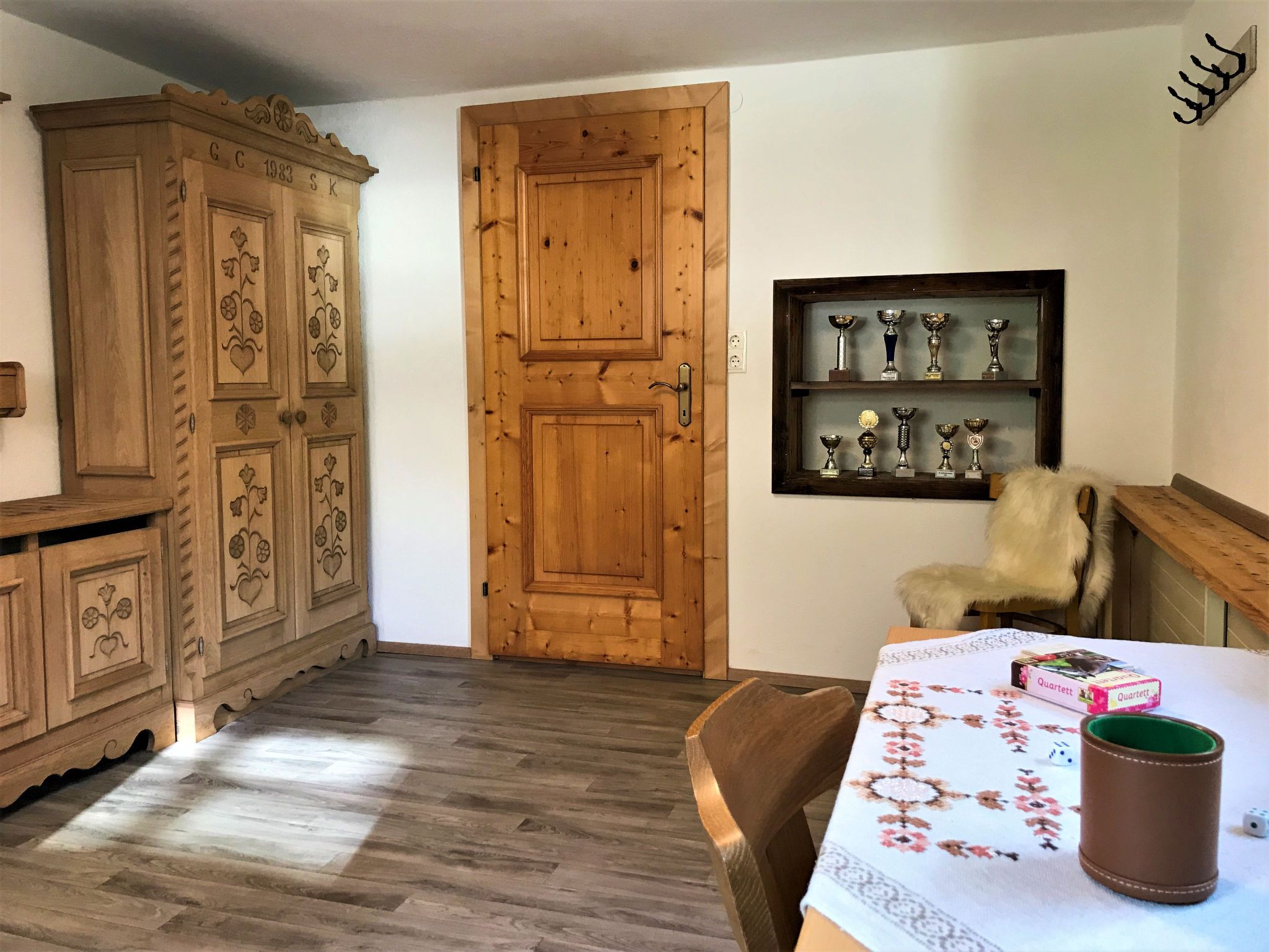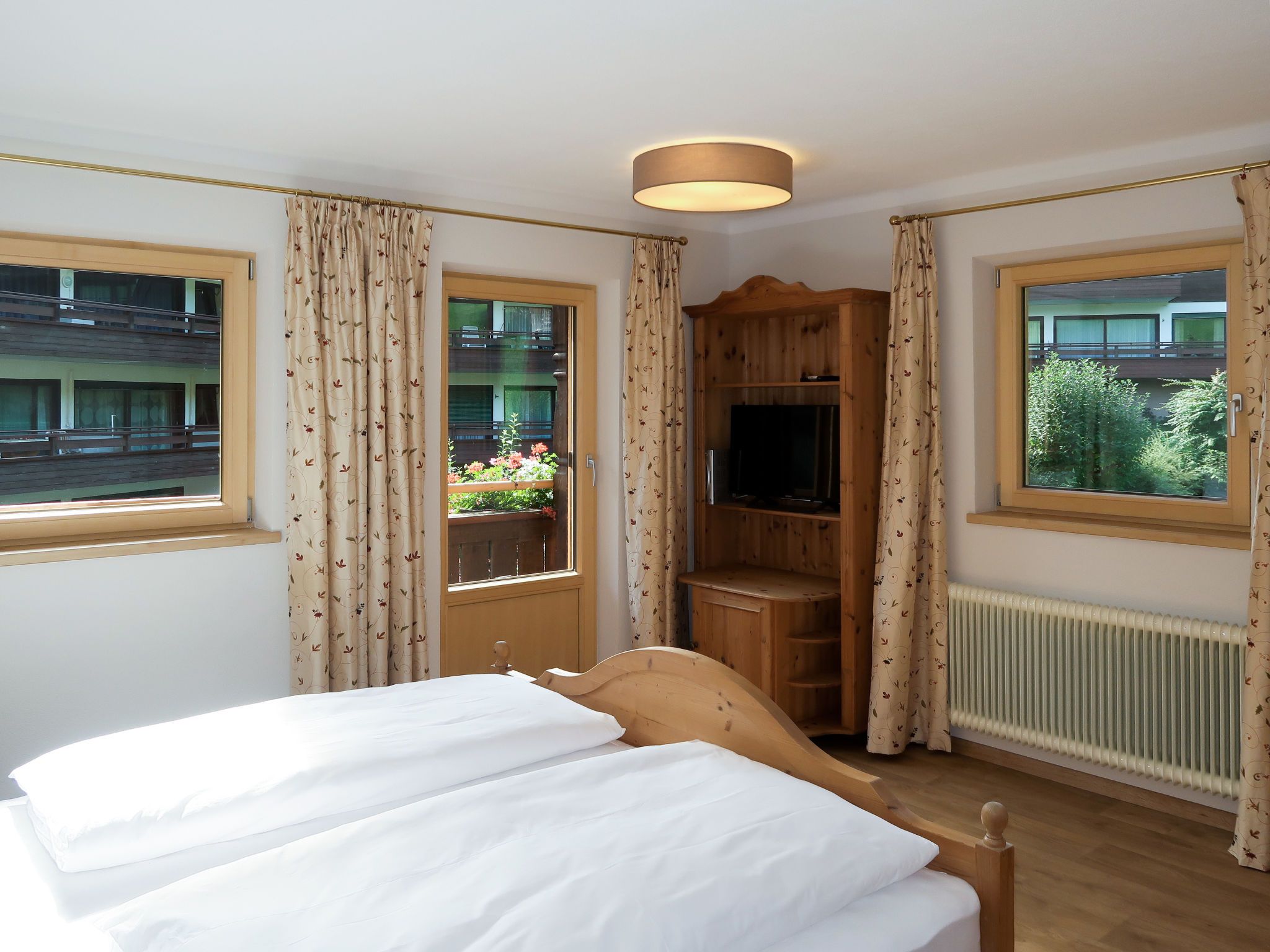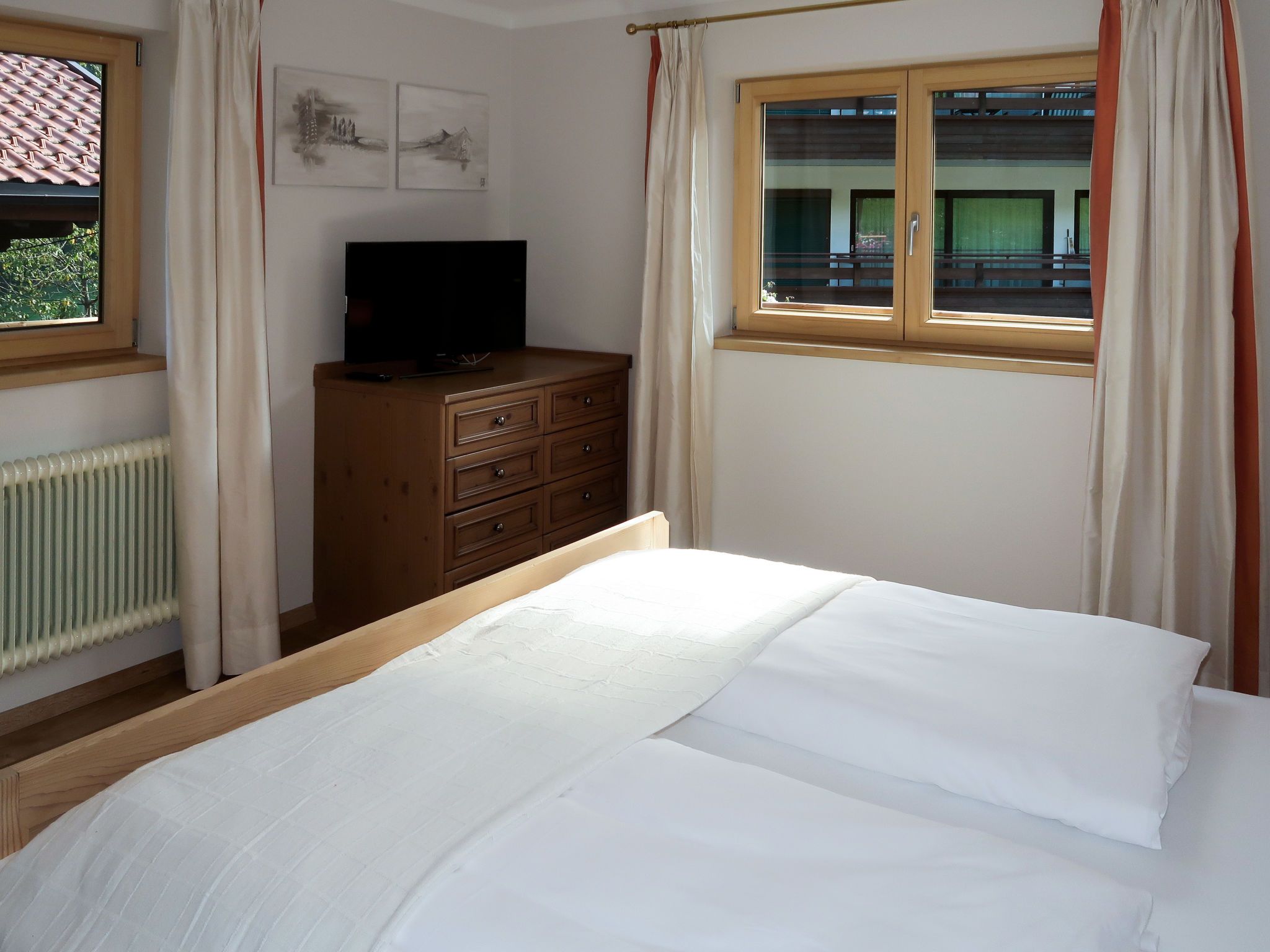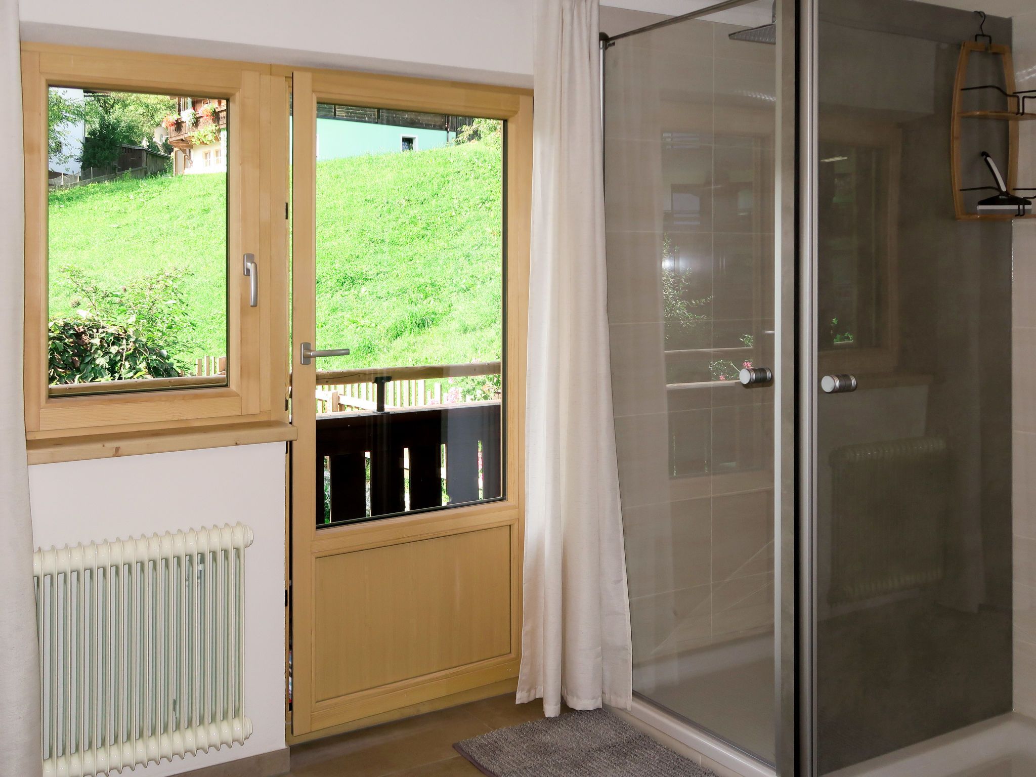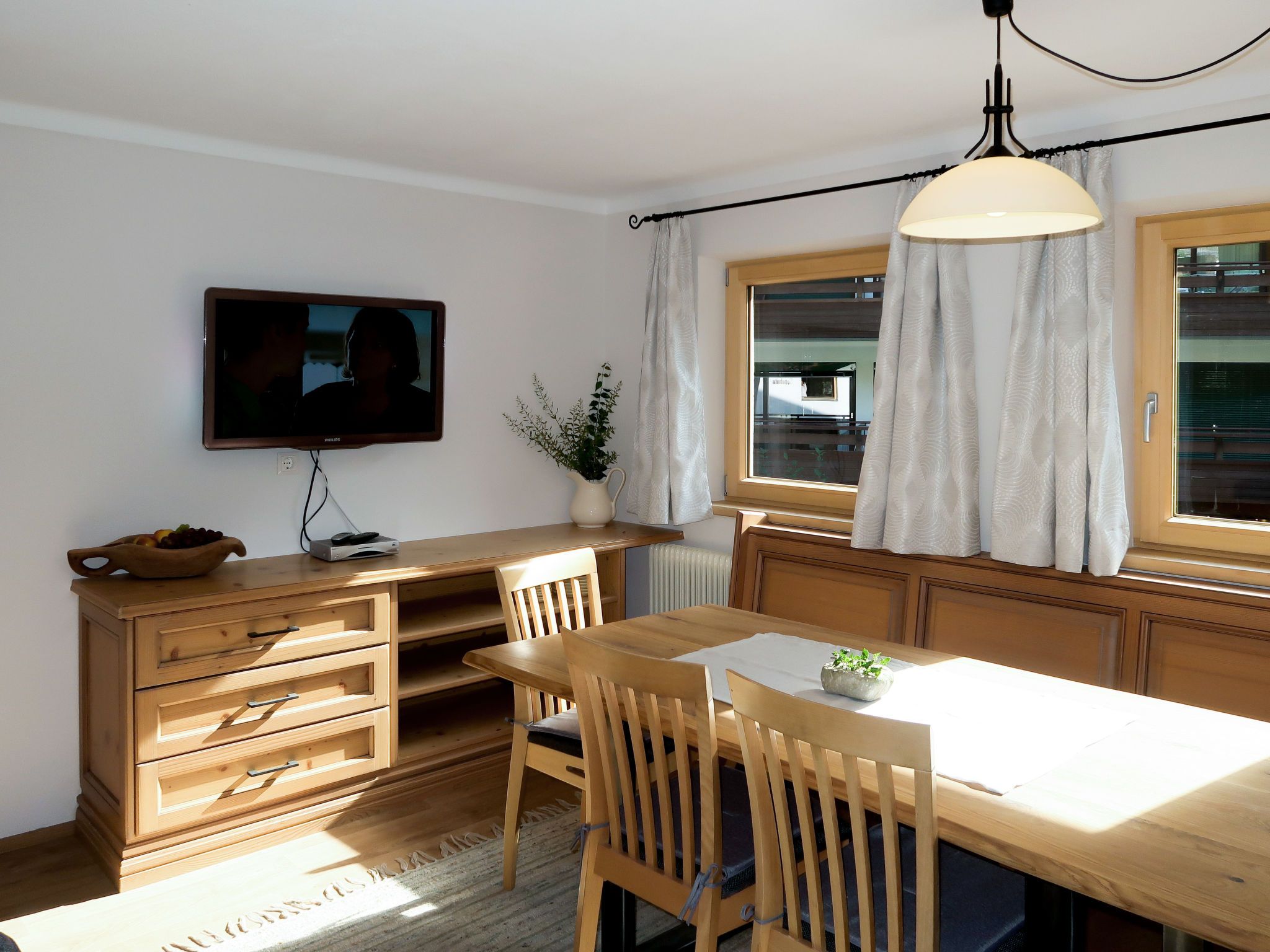 Sonnheim, 6-Zimmer-Haus 140 m2 auf 3 Stockwerken. Geräumig und hell, geschmackvoll und gemütlich eingerichtet: Wohn-/Esszimmer mit Essecke und Sat-TV (Flachbildschirm). 1 Doppelzimmer mit Waschbecken und Sat-TV (Flachbildschirm). Wohnküche (Backofen, Geschirrspüler, 4 Glaskeramikplatten, Toaster, Wasserkocher, Mikrowelle, elektrische Kaffeemaschine) mit Essecke. Ausgang zur Terrasse. Sep. WC. Obergeschoss: 1 Doppelzimmer mit Sat-TV. Ausgang zum Balkon. 1 Doppelzimmer mit Sat-TV. 2 Duschen, sep. WC, Doppelwaschbecken. 2. Obergeschoss: 1 abgeschrägtes Zimmer mit 1 Bett, 1 Doppelbett und Sat-TV. Ausgang zum Balkon. 1 abgeschrägtes kleines Zimmer mit 1 Bett. Ausgang zum Balkon. Ölheizung. 2 Balkone, grosse Terrasse teilweise überdacht. Terrassenmöbel, Balkonmöbel, Elektrogrill, Liegestühle (2), Abstellkammer. Sicht auf die Berge. Zur Verfügung: Babybett, Haartrockner. Internet (Wireless LAN, gratis). Bitte beachten: Nichtraucher-Haus. Feuerlöscher. Bei Belegung mit weniger Personen als der maximalen Personenzahl stehen nicht alle Wohneinheiten zur Verfügung.