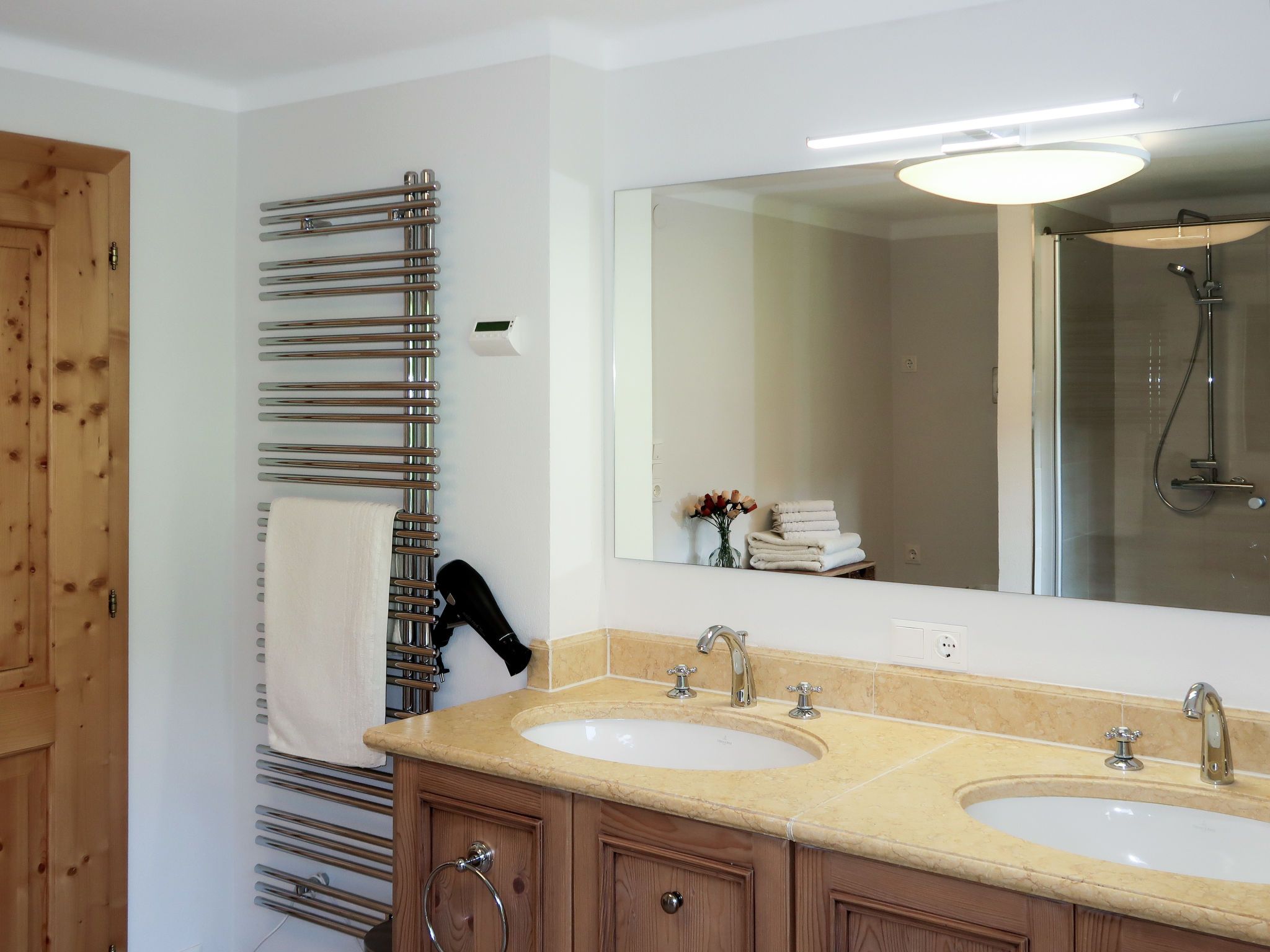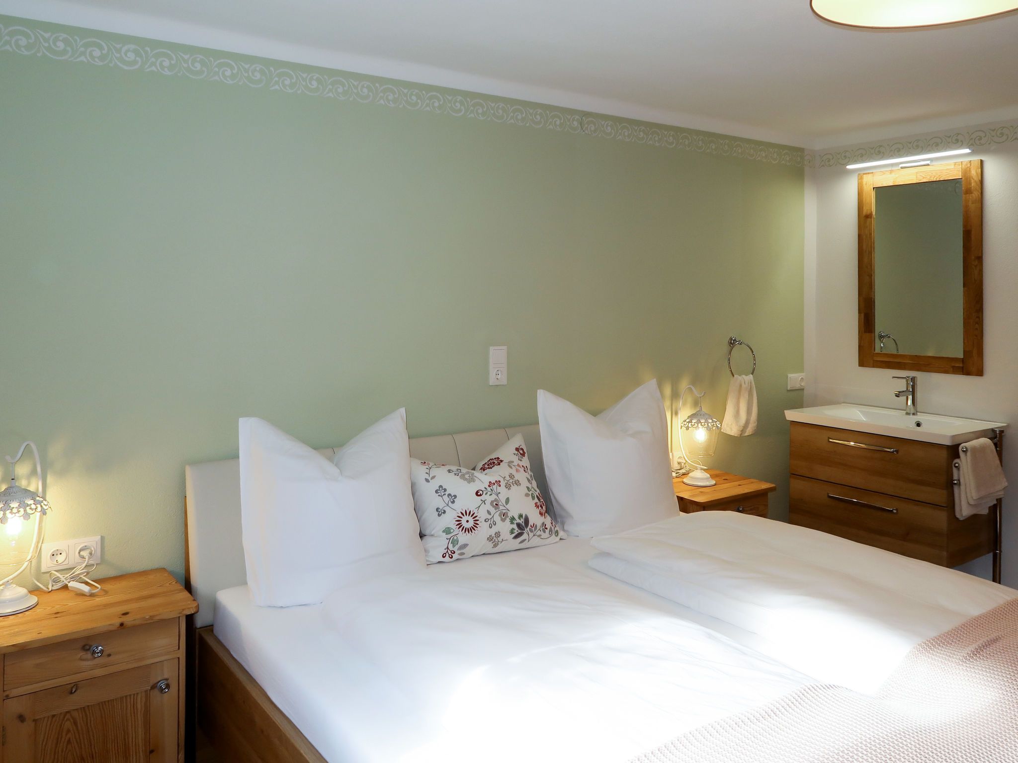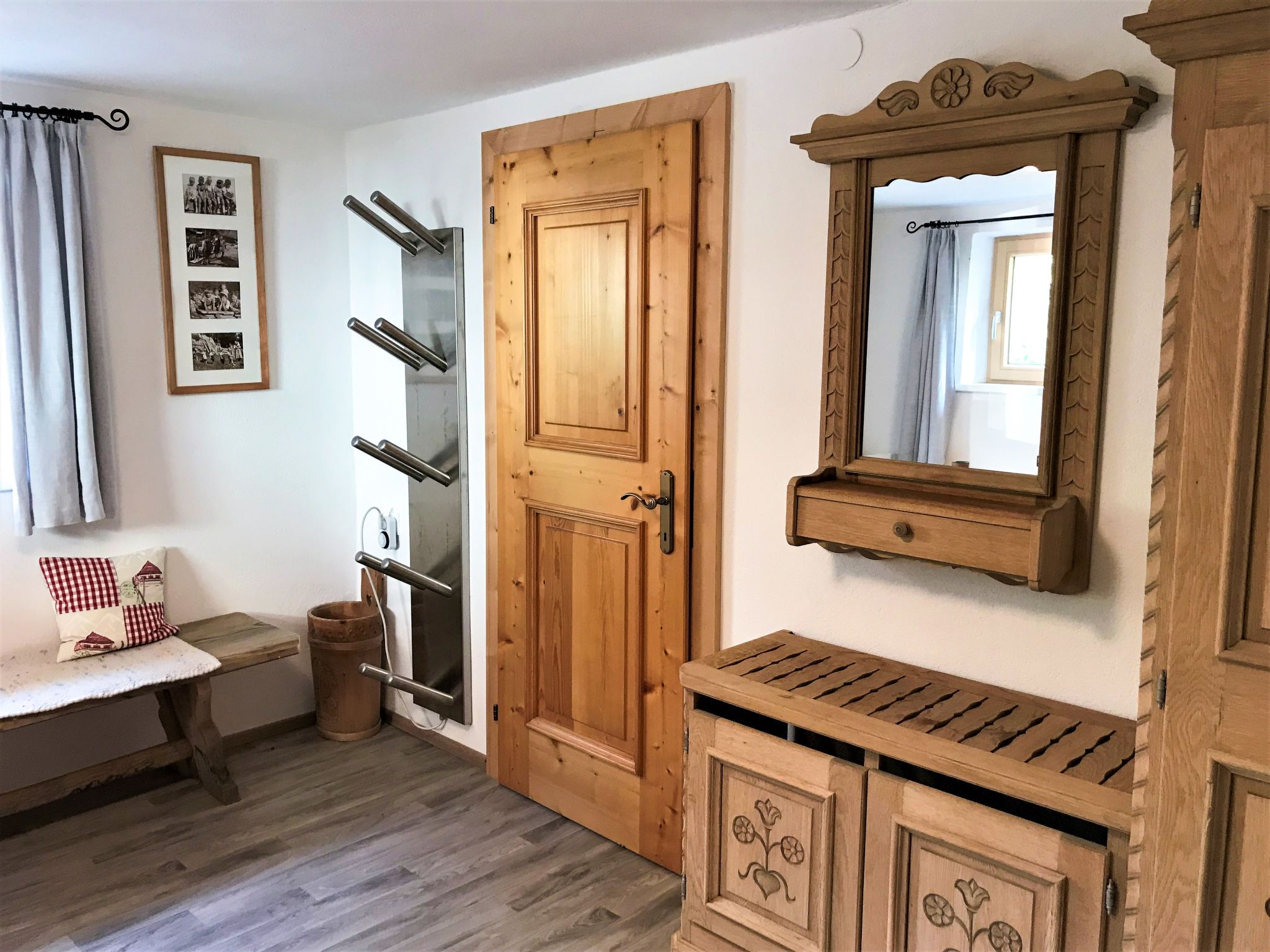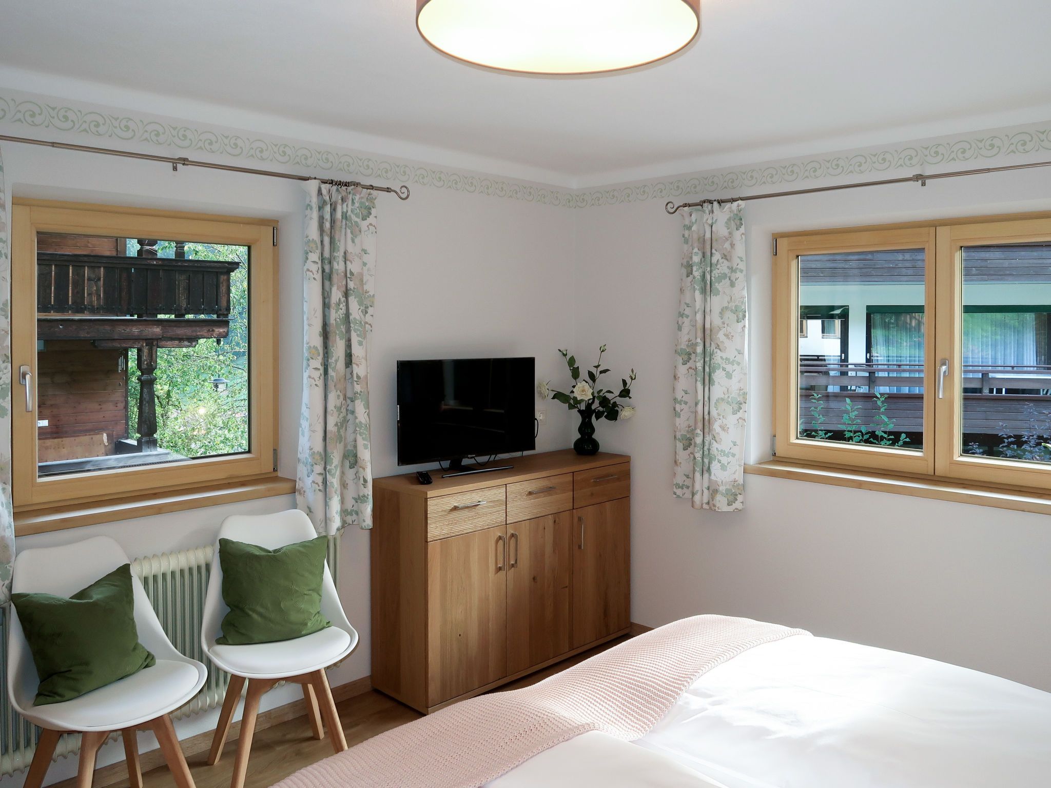 Sonnheim, 6-Zimmer-Haus 140 m2 auf 3 Stockwerken. Geräumig und hell, geschmackvoll und gemütlich eingerichtet: Wohn-/Esszimmer mit Essecke und Sat-TV (Flachbildschirm). 1 Doppelzimmer mit Waschbecken und Sat-TV (Flachbildschirm). Wohnküche (Backofen, Geschirrspüler, 4 Glaskeramikplatten, Toaster, Wasserkocher, Mikrowelle, elektrische Kaffeemaschine) mit Essecke. Ausgang zur Terrasse. Sep. WC. Obergeschoss: 1 Doppelzimmer mit Sat-TV. Ausgang zum Balkon. 1 Doppelzimmer mit Sat-TV. 2 Duschen, sep. WC, Doppelwaschbecken. 2. Obergeschoss: 1 abgeschrägtes Zimmer mit 1 Bett, 1 Doppelbett und Sat-TV. Ausgang zum Balkon. 1 abgeschrägtes kleines Zimmer mit 1 Bett. Ausgang zum Balkon. Ölheizung. 2 Balkone, grosse Terrasse teilweise überdacht. Terrassenmöbel, Balkonmöbel, Elektrogrill, Liegestühle (2), Abstellkammer. Sicht auf die Berge. Zur Verfügung: Babybett, Haartrockner. Internet (Wireless LAN, gratis). Bitte beachten: Nichtraucher-Haus. Feuerlöscher. Bei Belegung mit weniger Personen als der maximalen Personenzahl stehen nicht alle Wohneinheiten zur Verfügung.