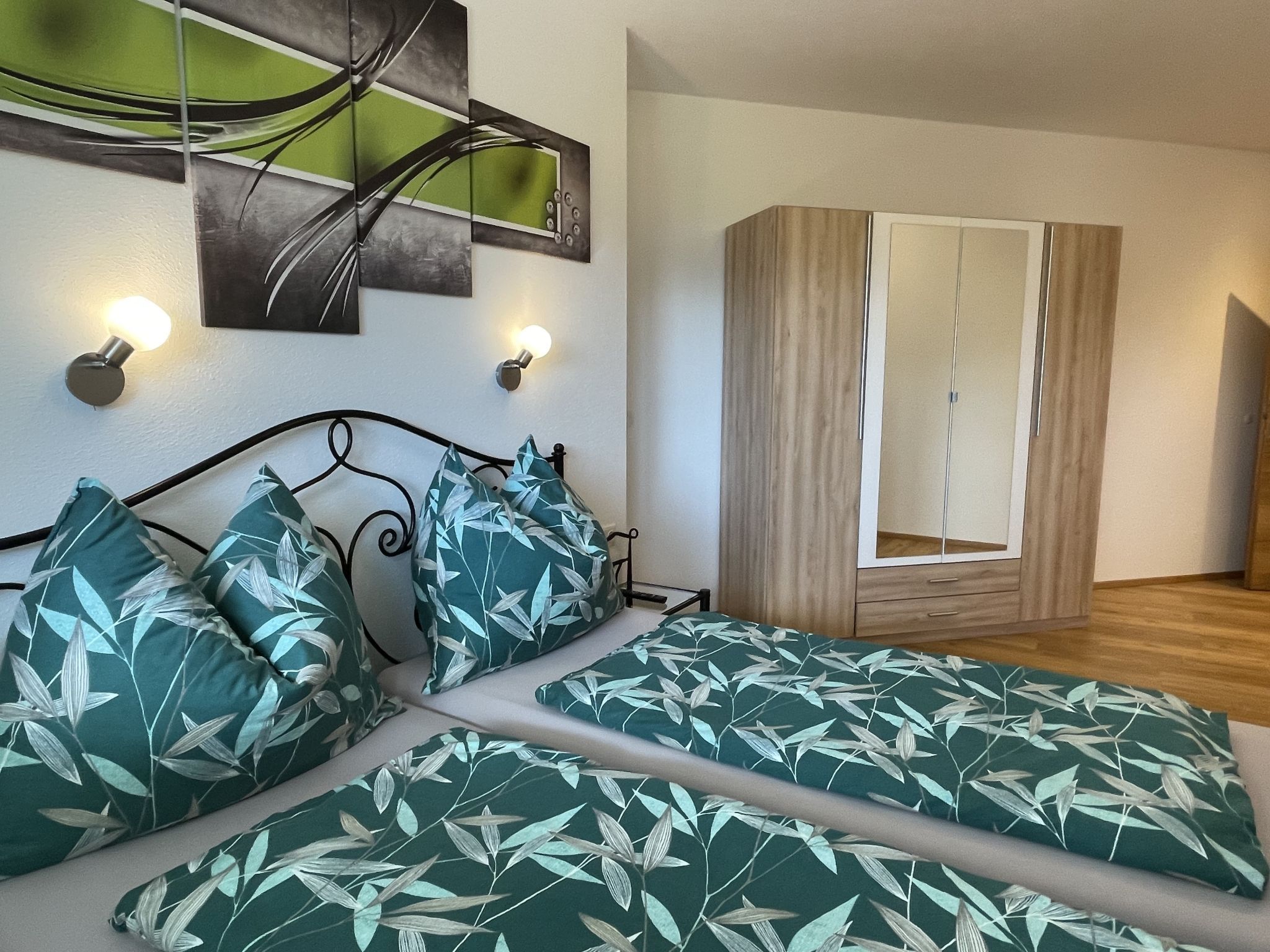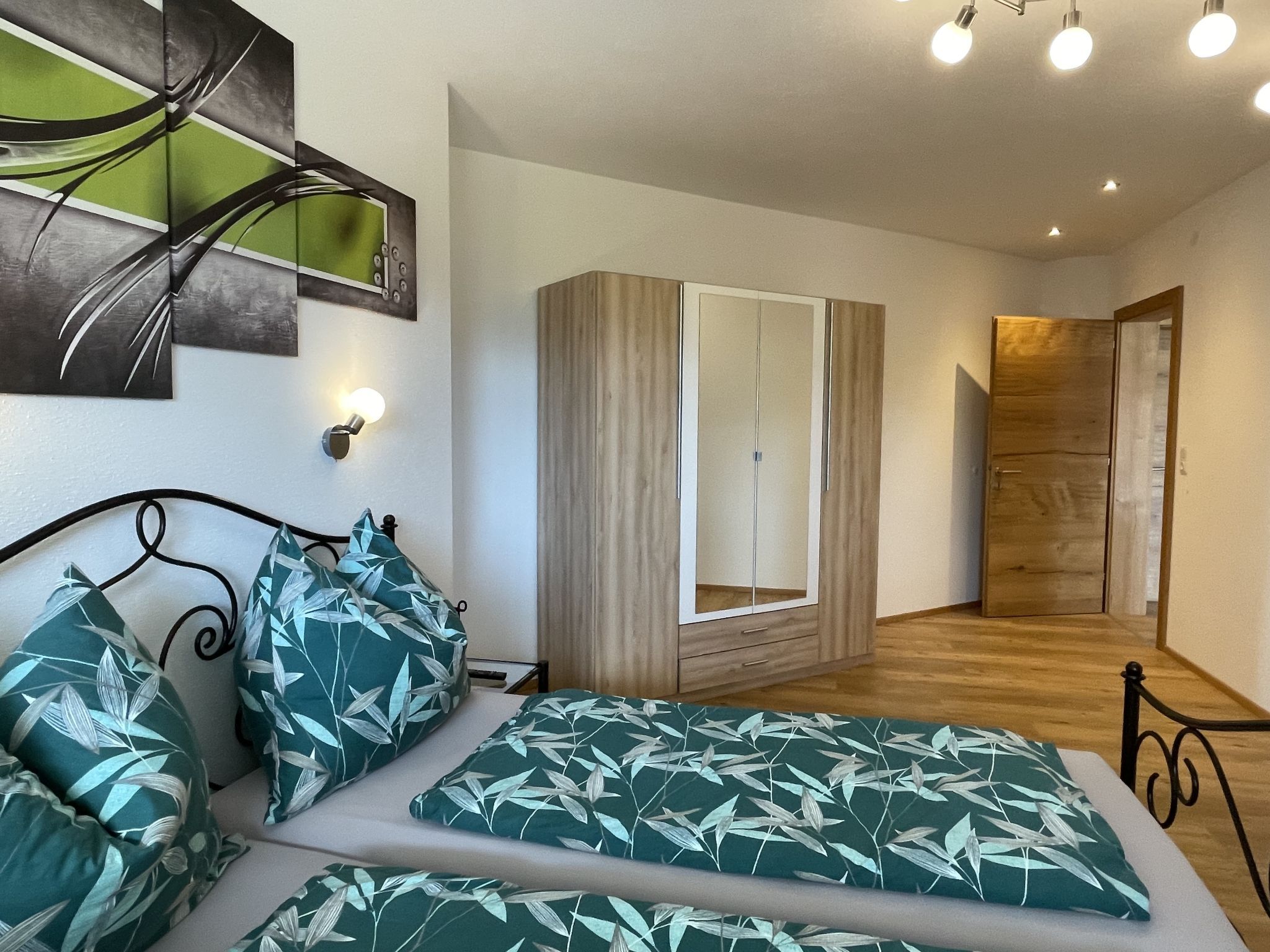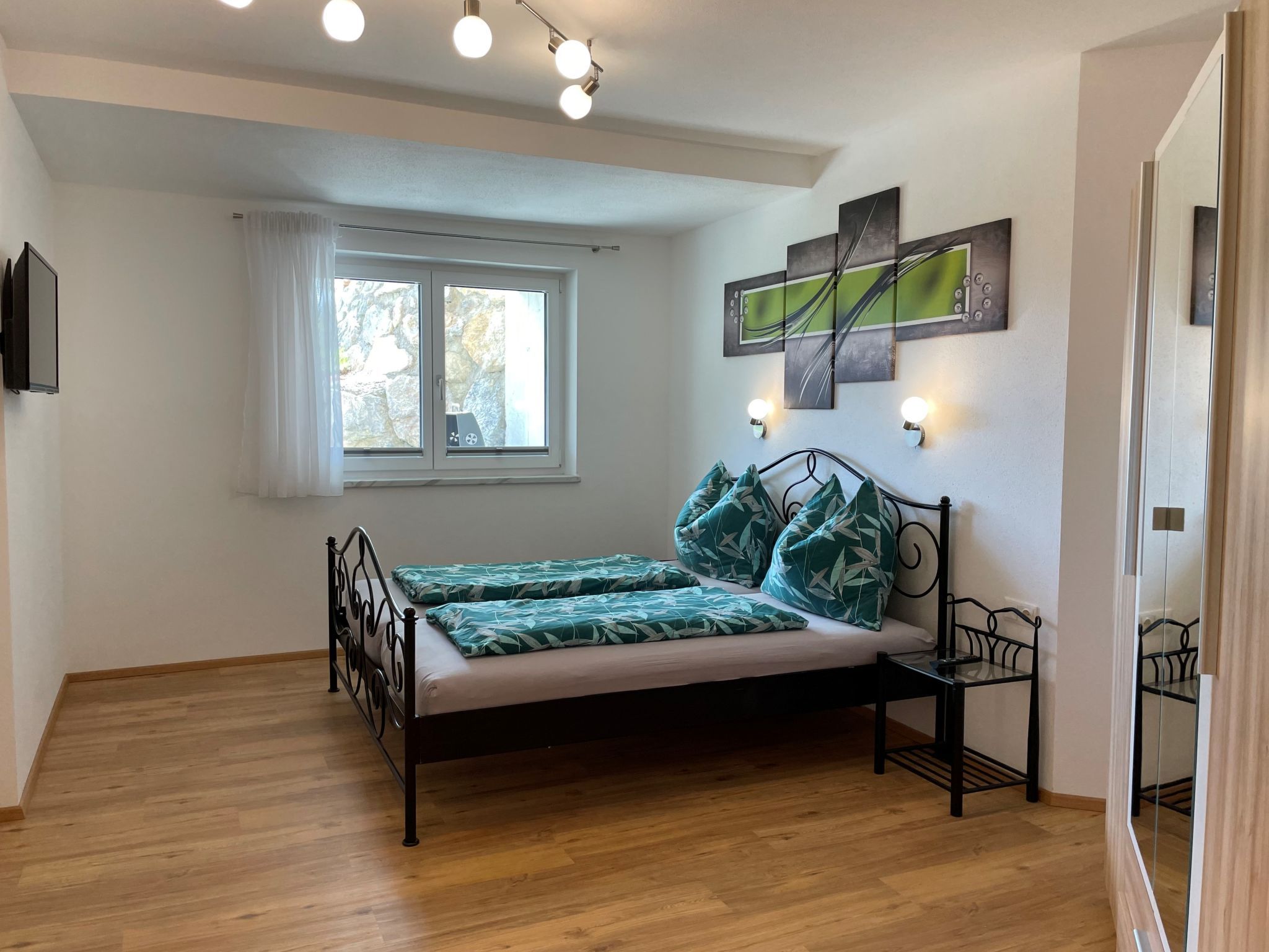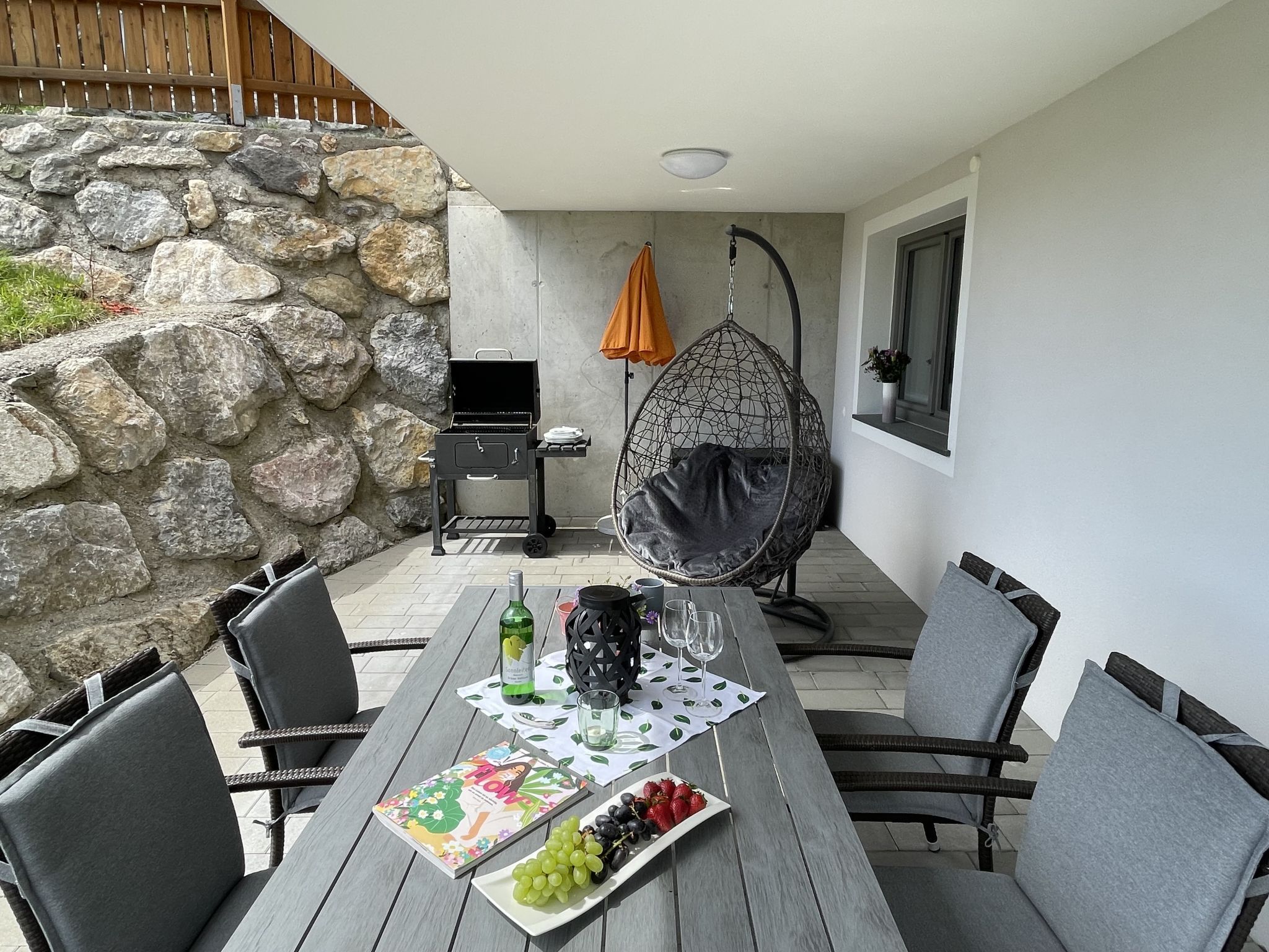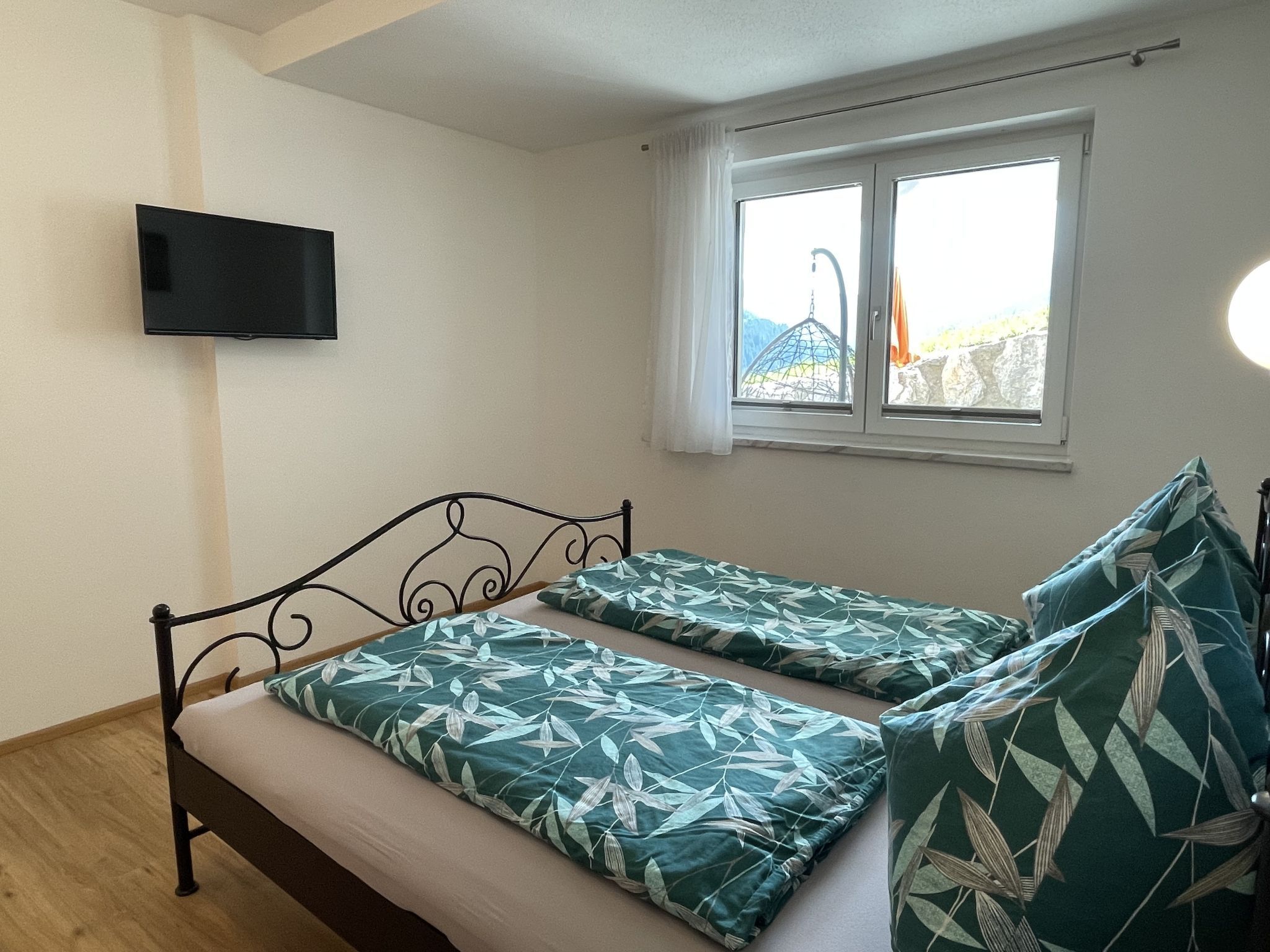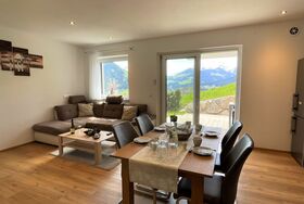 Bergblick, 3-Zimmer-Wohnung 79 m2, im ebenerdigen Untergeschoss. Geräumig und hell, schön und modern eingerichtet: Wohn-/Esszimmer mit Esstisch, Sat-TV und Internationale TV-Sender (Flachbildschirm). Ausgang zur Terrasse. 1 Doppelzimmer mit Sat-TV (Flachbildschirm). 1 Zimmer mit 2 Betten. Offene Küche (Backofen, Geschirrspüler, 4 Glaskeramikplatten, Toaster, Wasserkocher, Mikrowelle, Tiefkühler, elektrische Kaffeemaschine). Ausgang zur Terrasse. Dusche/WC. Heizung. Holzdielenboden. Grosse Terrasse teilweise überdacht. Terrassenmöbel, Gartengrill, Liegestühle (2), Abstellkammer. Herrliche Panoramasicht auf die Berge, das Tal und die Ortschaft. Zur Verfügung: Kinderhochstuhl, Babybett, Haartrockner. Internet (Wireless LAN, gratis). Bitte beachten: Nichtraucher-Unterkunft. Eigener Eingang, Feuerlöscher.