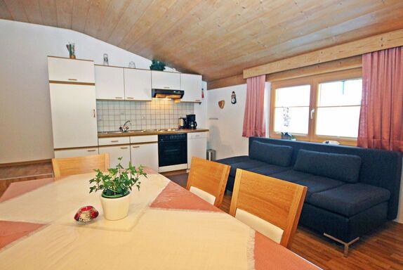 Alpenheim Haid, 3-Zimmer-Wohnung 80 m2 im 1. Stock. Teilweise abgeschrägt, schön und gemütlich eingerichtet: 1 Doppelzimmer mit Waschbecken. 1 abgeschrägtes Zimmer mit 2 Betten, 1 Doppelbett und Waschbecken. Ausgang zum Balkon. Abgeschrägte Wohnküche (4 Kochplatten, Backofen, Geschirrspüler, Toaster, Wasserkocher, elektrische Kaffeemaschine) mit Esstisch, 1 Doppeldiwanbett und Sat-TV. Dusche, sep. WC. E-Heizung, Bodenheizung. Teppichboden. Balkon. Zur Verfügung: Babybett. Internet (Wireless LAN, gratis). Bitte beachten: geeignet für Familien. Nichtraucher-Unterkunft. Flexibilität bei der Bettenaufteilung: Es stehen mehr Schlafmöglichkeiten zur Verfügung als die maximal zugelassene Personenzahl, diese darf dennoch nicht überschritten werden.