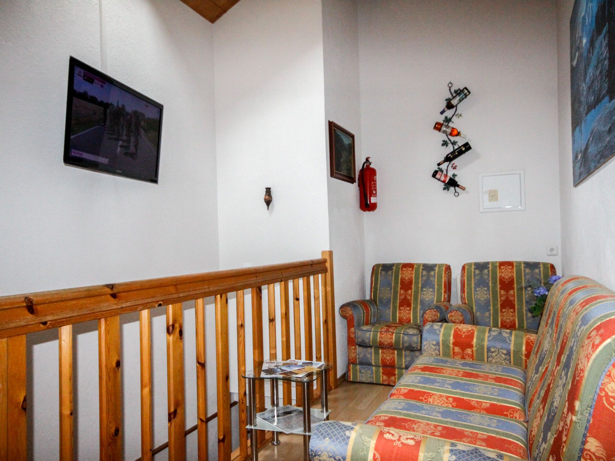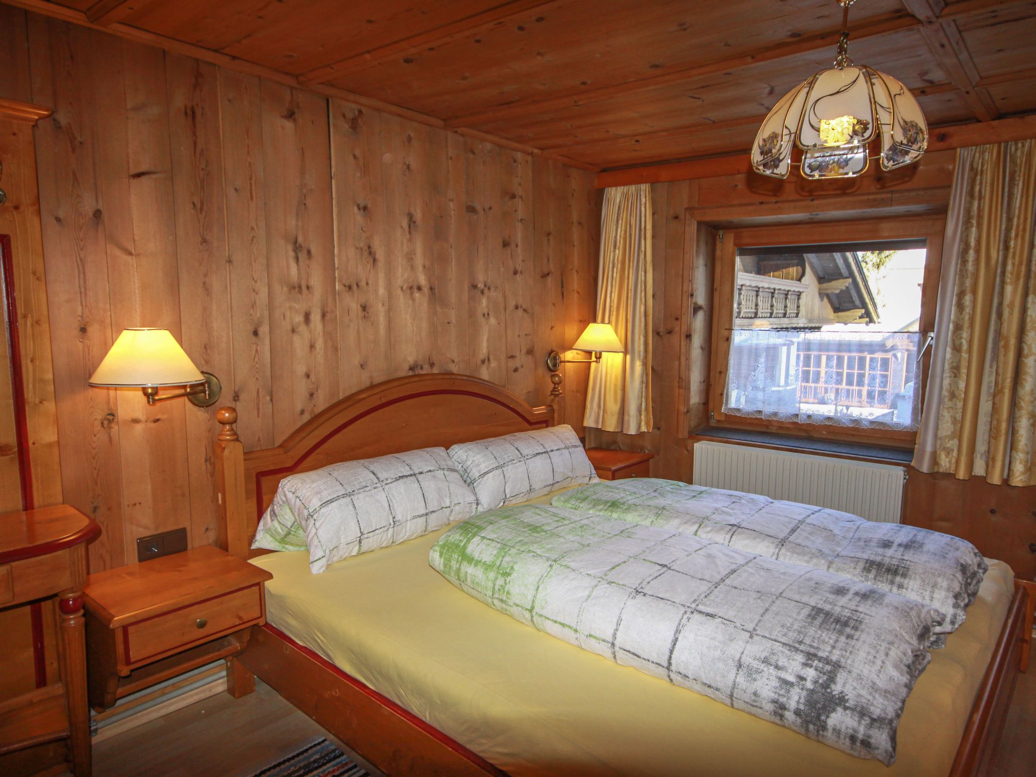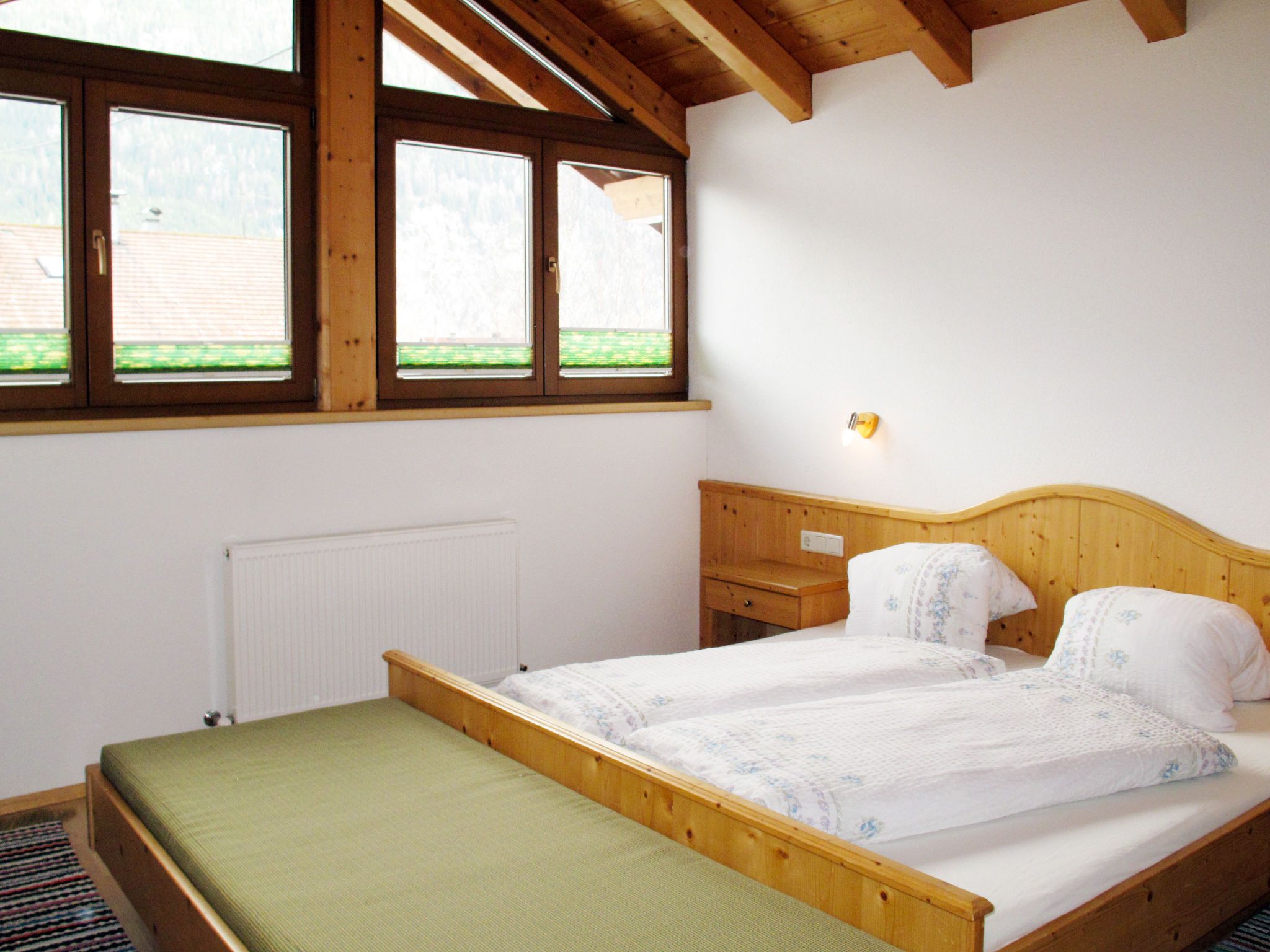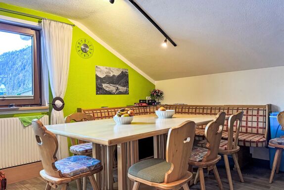 Alpenglühen, 5-Zimmer-Wohnung 100 m2 auf 2 Stockwerken. Hell, teilweise renoviert, gemütlich und mit viel Holz eingerichtet: Obergeschoss: 1 Zimmer mit 1 Doppelbett und Dusche. Sep. WC. 2. Obergeschoss: 1 abgeschrägtes Zimmer mit 1 Doppelbett und Dusche/WC. 1 abgeschrägtes Zimmer mit 1 Bett, 1 Doppelbett und Dusche/WC. Ausgang zum Balkon. 1 abgeschrägtes Zimmer mit 1 Bett, 1 Doppelbett und Dusche/WC. Wohnküche (Backofen, Geschirrspüler, 4 Glaskeramikplatten, Toaster, Wasserkocher, Mikrowelle, Tiefkühler, elektrische Kaffeemaschine) mit Esstisch, Essecke und Sat-TV. Ausgang zum Balkon. Ölheizung. Balkon. Zur Verfügung: Babybett. Internet (Wireless LAN, gratis). Bitte beachten: ein Doppelzimmer liegt außerhalb der Wohnung. Nichtraucher-Unterkunft. Rauchmelder.