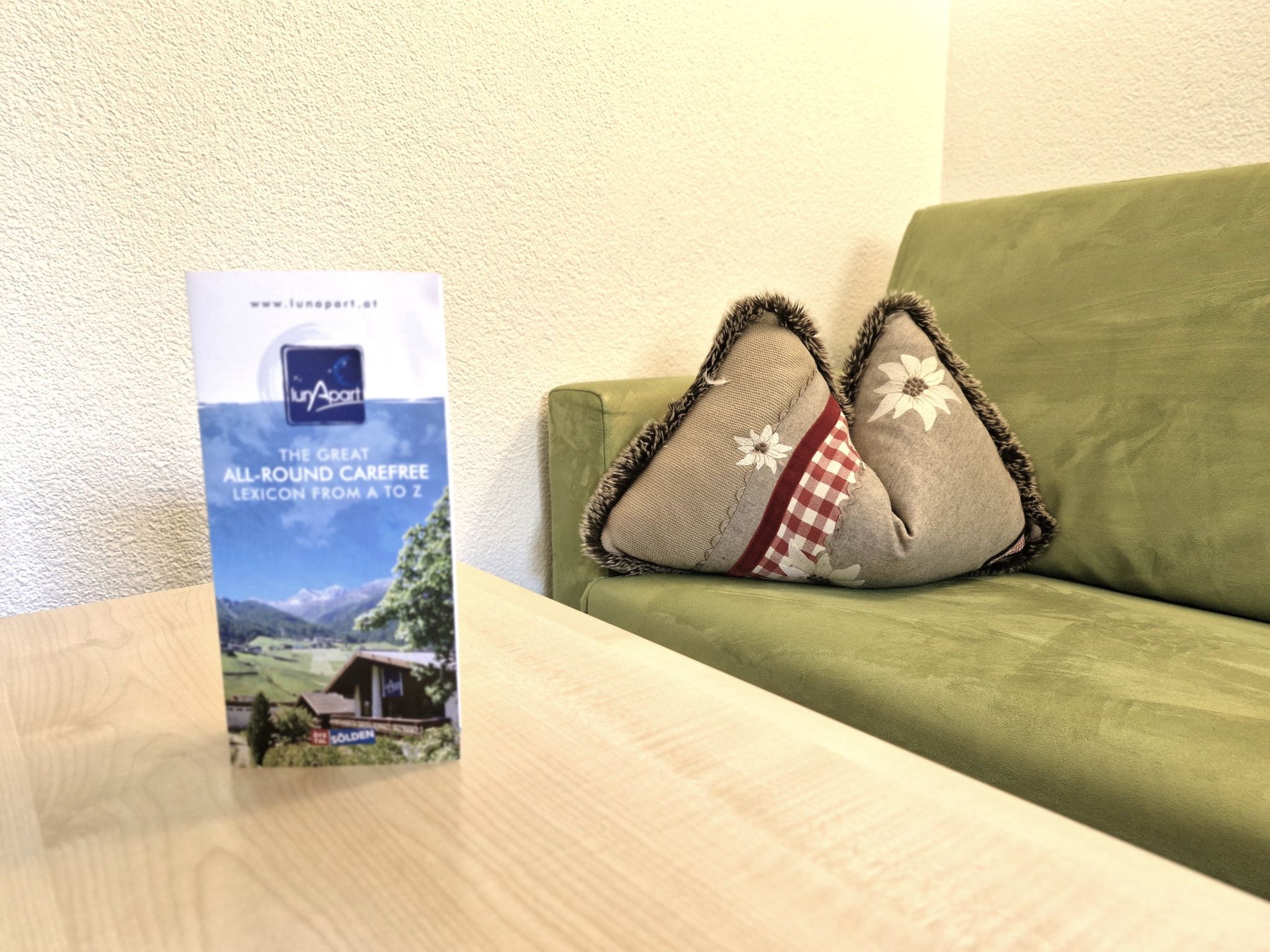 Lunapart, 2-Zimmer-Wohnung 27 m2, im Erdgeschoss. Modern eingerichtet: 1 Zimmer mit 1 Doppelbett. Wohnküche (Geschirrspüler, 4 Glaskeramikplatten, Wasserkocher, Mikrowelle, elektrische Kaffeemaschine) mit Esstisch, 1 Diwanbett und Sat-TV (Flachbildschirm), Radio. Dusche/WC. Ölheizung. Teppichboden. Zur Verfügung: Safe, Babybett bis 2 Jahre. Internet (WLAN, gratis). Bitte beachten: Maximal 1 Haustier/Hund erlaubt. Rauchmelder. Im Mietpreis inkludiert: täglich 1x pro Person Eintritt ins Hallenbad und Sauna der Freizeit Arena in Sölden, sowie Nutzung des Tennisplatzes (nach Absprache).