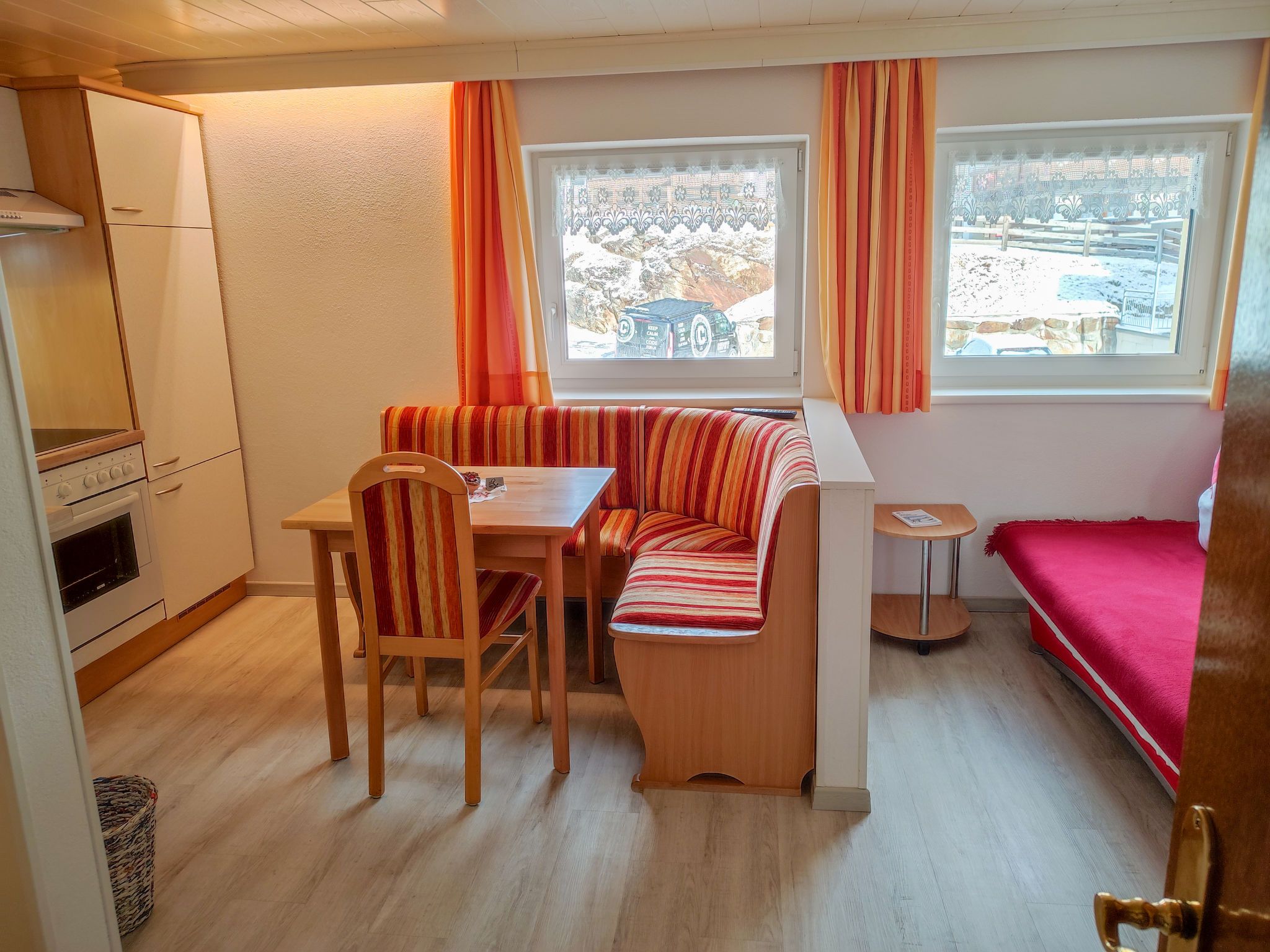 Elisabeth, 2-Zimmer-Wohnung 28 m2 im 1. Stock. Gemütlich eingerichtet: Wohn-/Esszimmer mit Esstisch und Kabel-TV. 1 Doppelzimmer mit Kabel-TV. Offene Küche (Backofen, Geschirrspüler, 4 Glaskeramikplatten, elektrische Kaffeemaschine). Dusche/WC. Ölheizung. Zur Verfügung: Safe. Internet (Wireless LAN, gratis). Parkplatz (1 Auto) beim Haus.