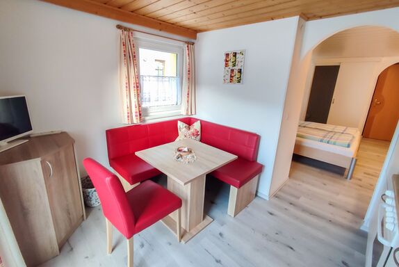 Elisabeth, 1-Zimmer-Wohnung 25 m2, im erhöhten Erdgeschoss. Gemütlich eingerichtet: 1 offenes Zimmer mit 1 Doppelbett und Dusche/WC. Wohnküche (Backofen, Geschirrspüler, 4 Glaskeramikplatten, elektrische Kaffeemaschine) mit Esstisch, Kabel-TV. Ausgang zur Terrasse. Ölheizung. Terrasse. Zur Verfügung: Safe. Internet (Wireless LAN, gratis). Parkplatz (1 Auto) beim Haus.