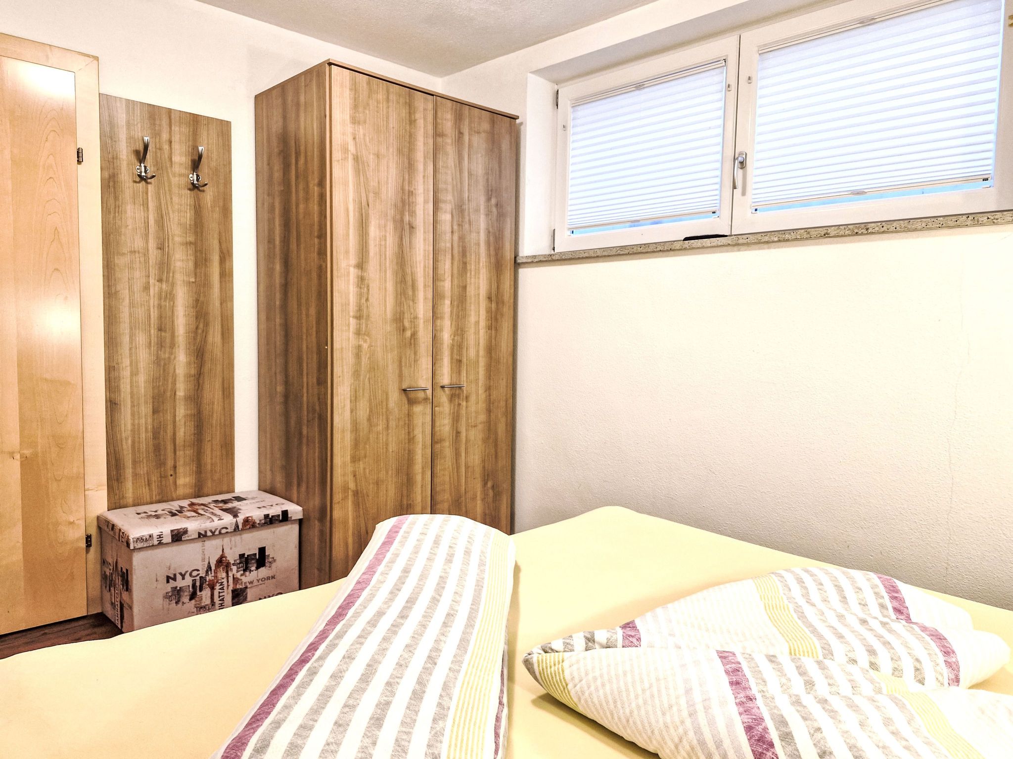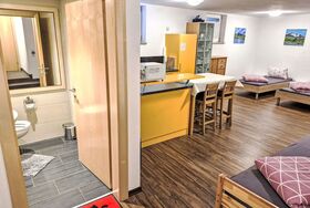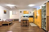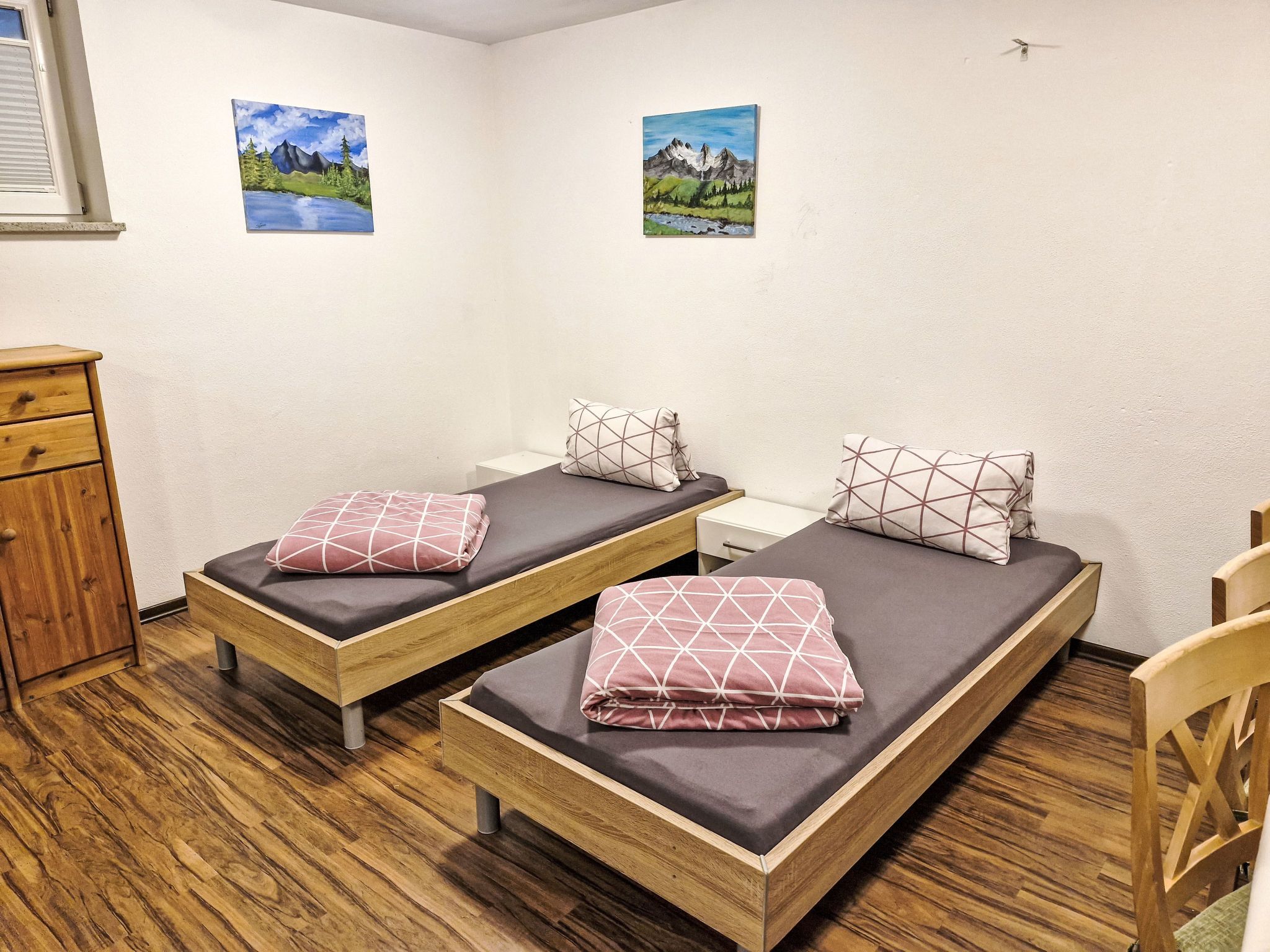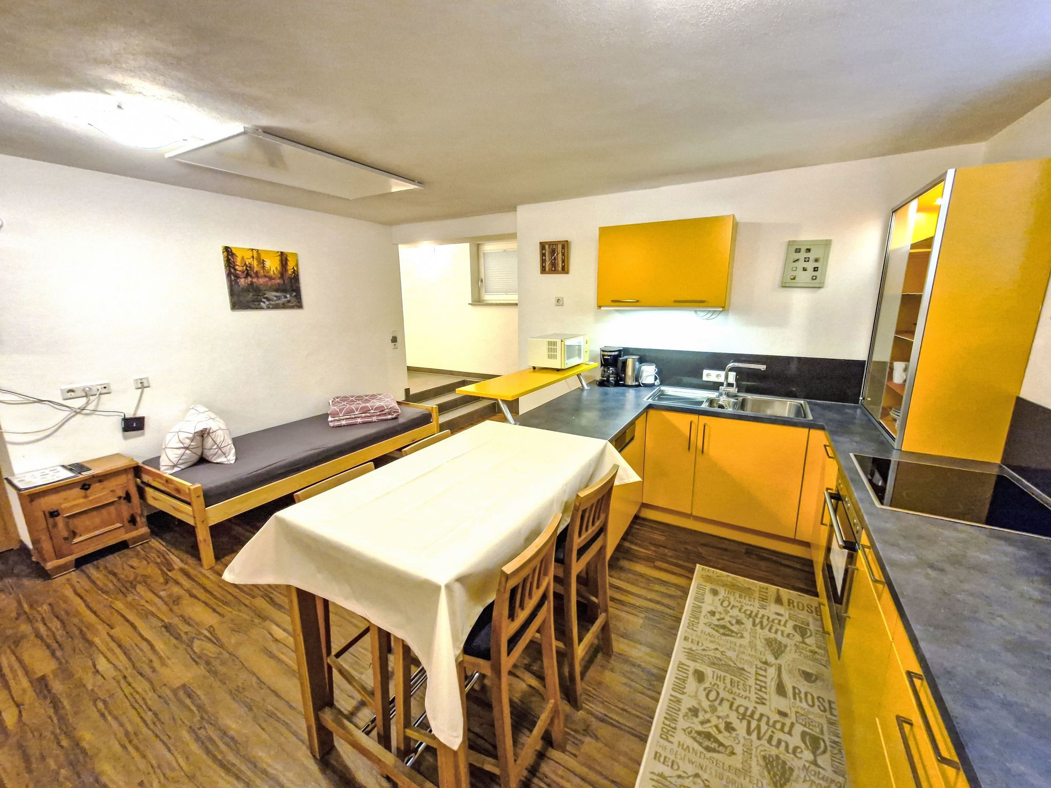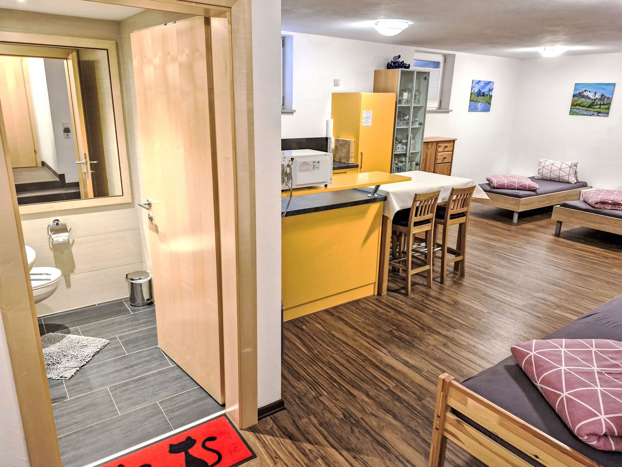 Opal, 2-Zimmer-Studio 45 m2, unteres Geschoss. Zweckmässig und schön eingerichtet: Wohn-/Schlafzimmer mit 1 Doppelbett und Dusche/WC. Wohnküche (Geschirrspüler, 4 Glaskeramikplatten, Wasserkocher, Mikrowelle, elektrische Kaffeemaschine) mit Esstisch, 3 Betten und Kabel-TV. Sep. WC. Fussbodenheizung. Keine Sicht. Zur Verfügung: Internet (Wireless LAN, gratis). Bitte beachten: ein Doppelzimmer liegt außerhalb der Wohnung. Nichtraucher-Unterkunft. Rauchmelder. Hinweis: Alle Zimmer mit Schachtfenster (keine Aussicht).