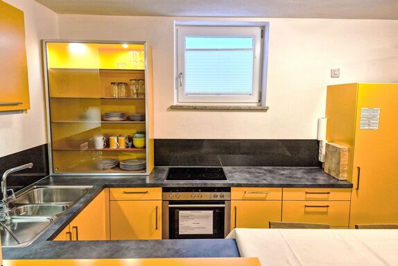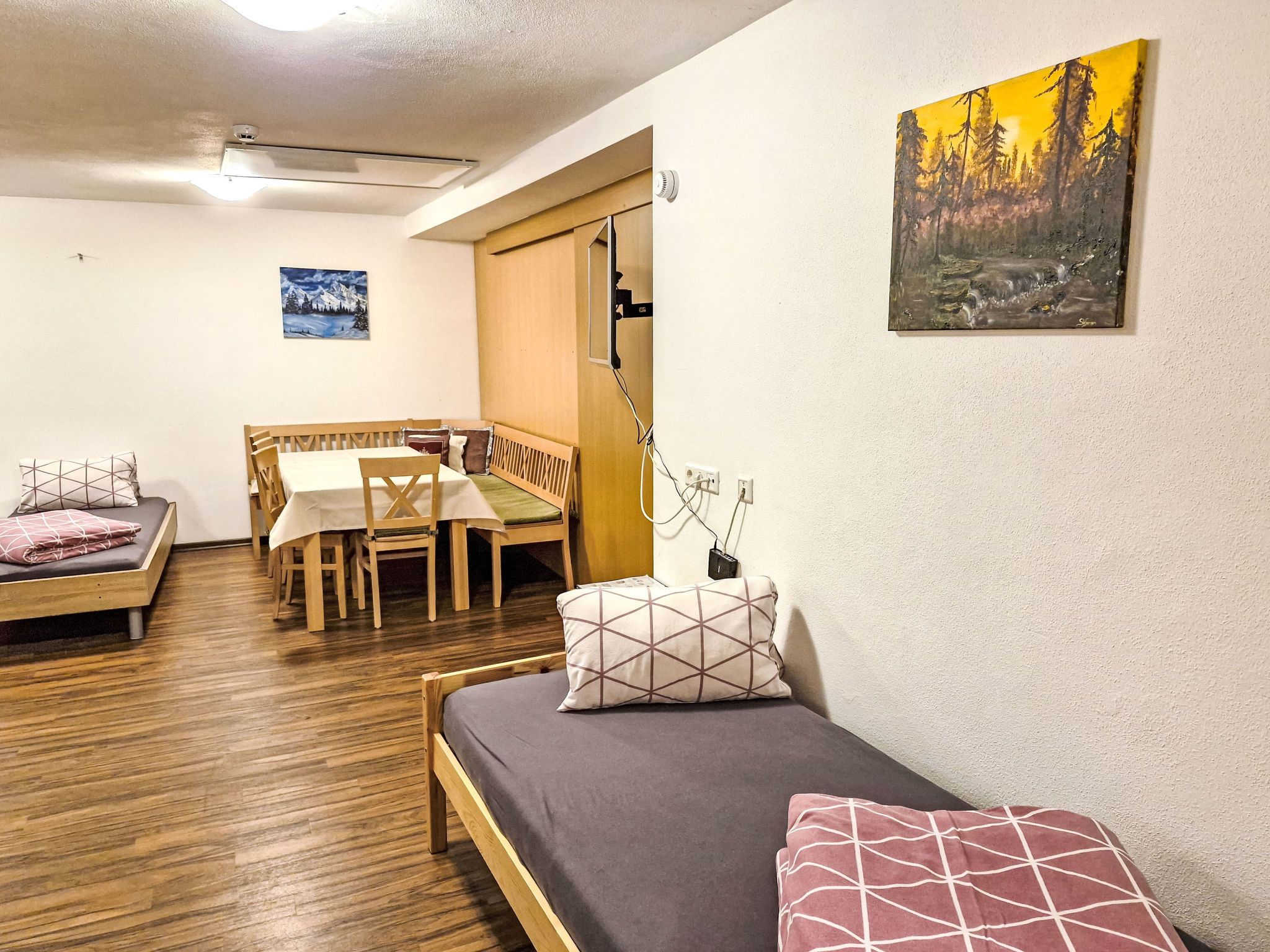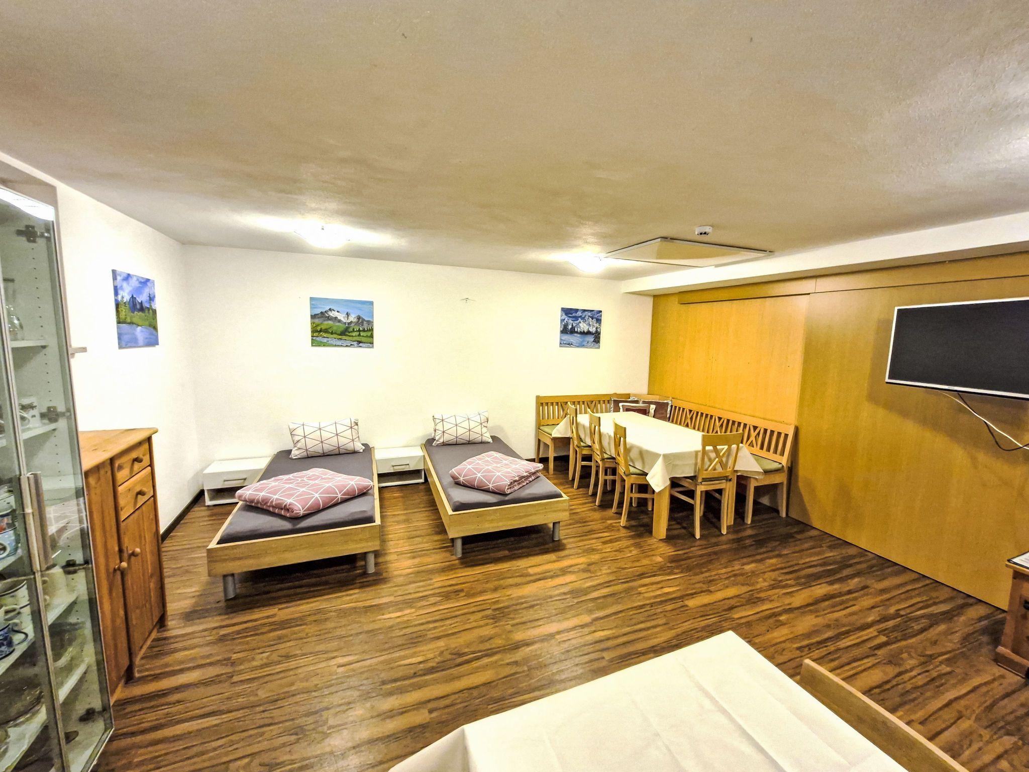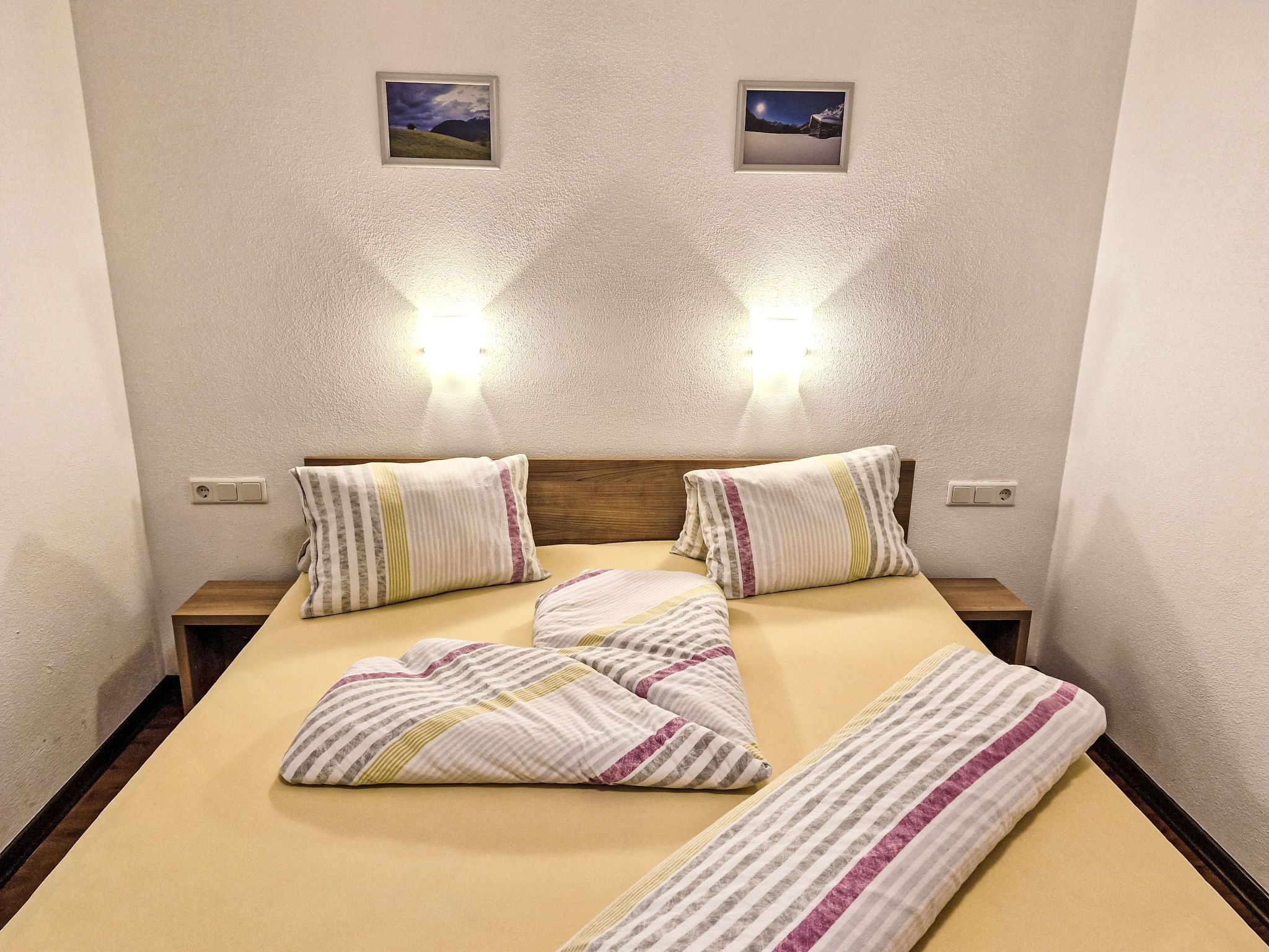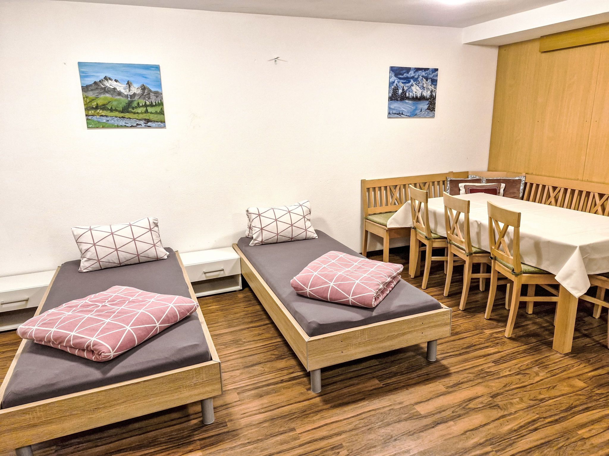 Opal, 2-Zimmer-Studio 45 m2, unteres Geschoss. Zweckmässig und schön eingerichtet: Wohn-/Schlafzimmer mit 1 Doppelbett und Dusche/WC. Wohnküche (Geschirrspüler, 4 Glaskeramikplatten, Wasserkocher, Mikrowelle, elektrische Kaffeemaschine) mit Esstisch, 3 Betten und Kabel-TV. Sep. WC. Fussbodenheizung. Keine Sicht. Zur Verfügung: Internet (Wireless LAN, gratis). Bitte beachten: ein Doppelzimmer liegt außerhalb der Wohnung. Nichtraucher-Unterkunft. Rauchmelder. Hinweis: Alle Zimmer mit Schachtfenster (keine Aussicht).
