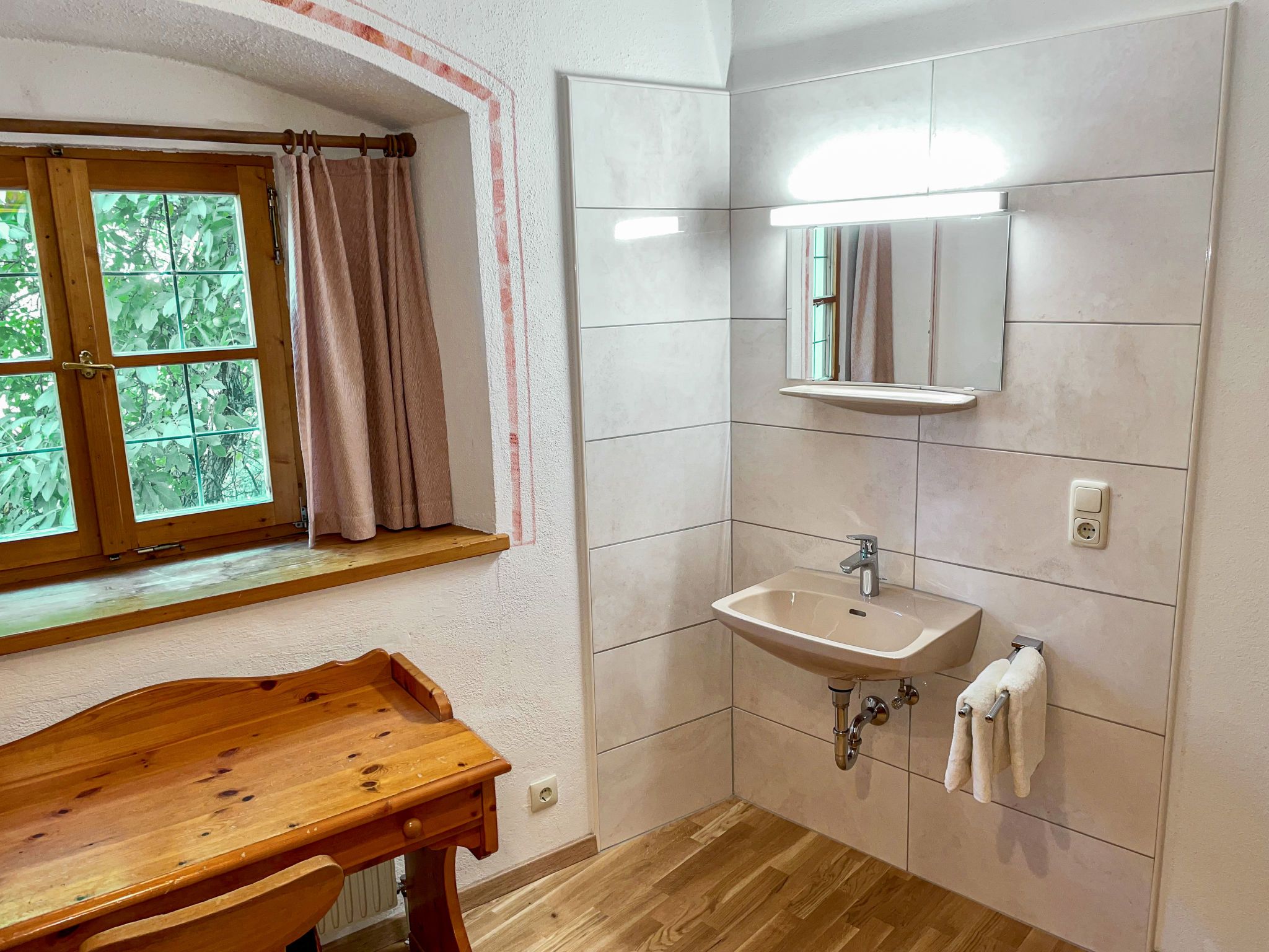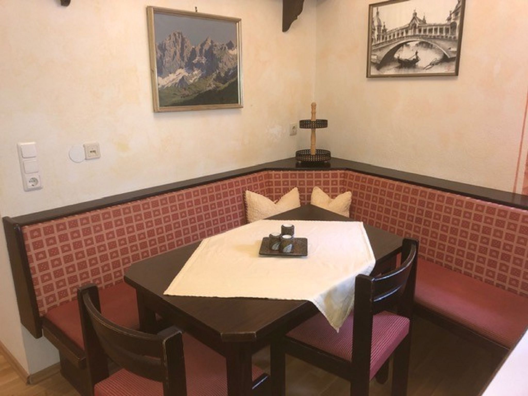 Burg Biedenegg, Pach, 3-Zimmer-Wohnung 60 m2 im 1. Stock. Rustikal und stilvoll eingerichtet: 1 Doppelzimmer mit Waschbecken. 1 Zimmer mit 1 x 2 Etagenbetten, Waschbecken. Wohnküche (4 Kochplatten, Toaster, Wasserkocher, Mikrowelle, elektrische Kaffeemaschine) mit Essecke und Sat-TV. Bad, sep. WC, Doppelwaschbecken. Ölheizung. Parkettboden. Schöne Sicht auf die Landschaft und die Ortschaft. Zur Verfügung: Kinderhochstuhl, Babybett. Internet (Wireless LAN, gratis). Bitte beachten: Rauchmelder.