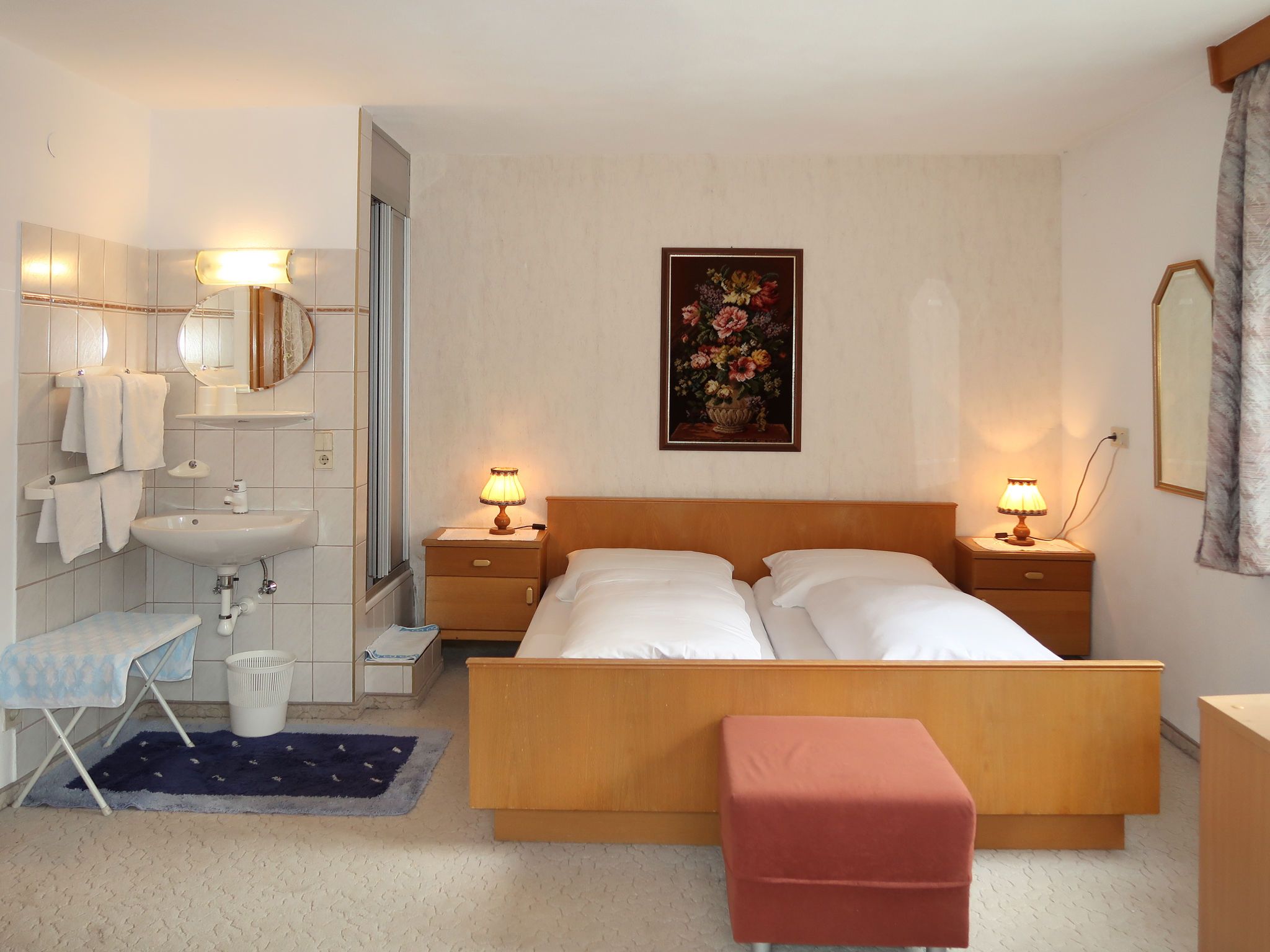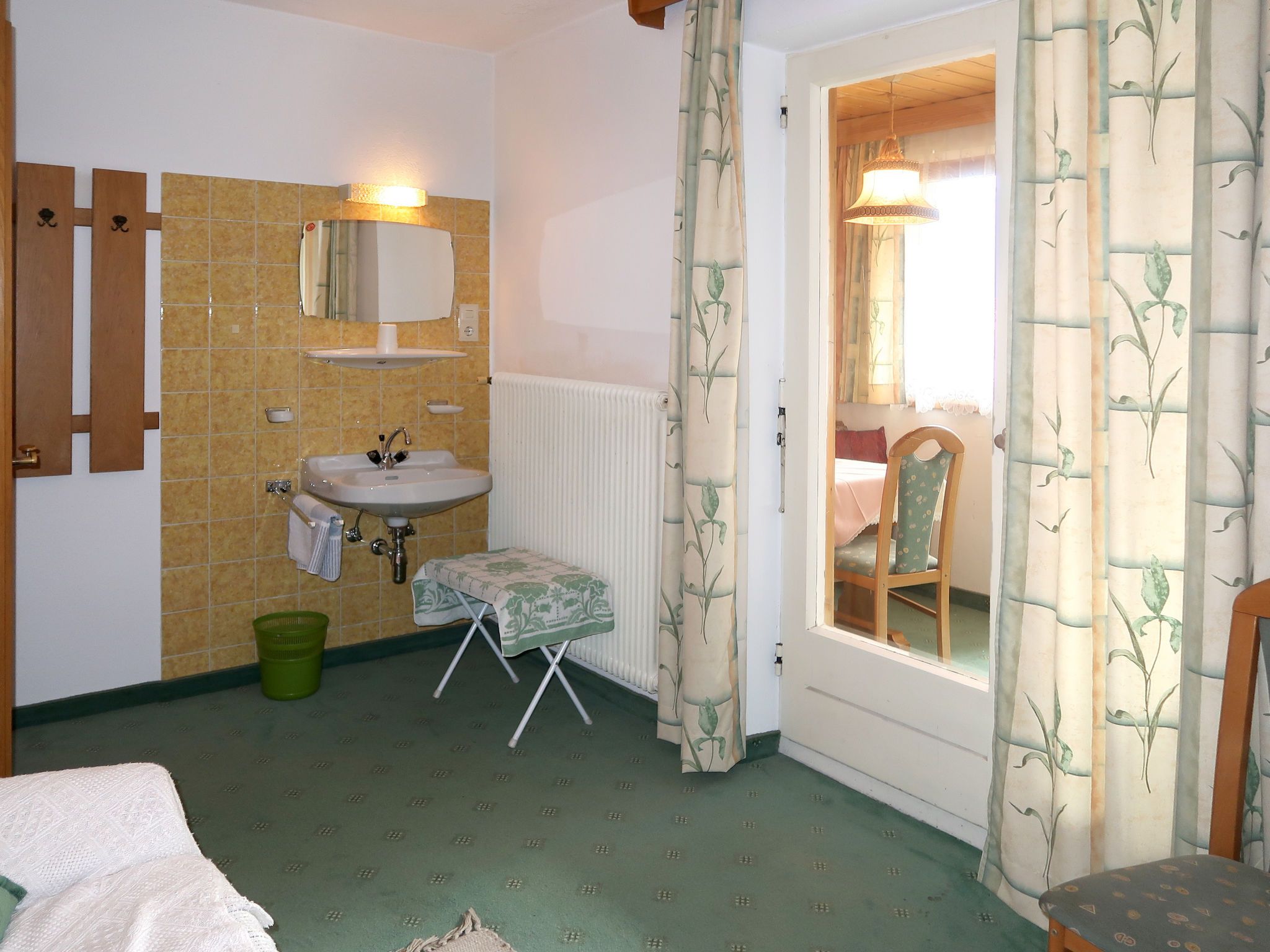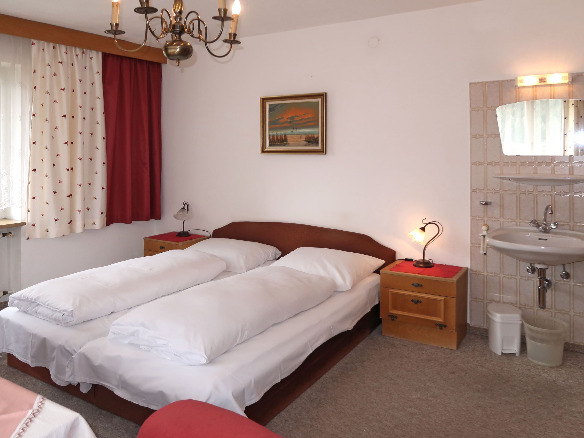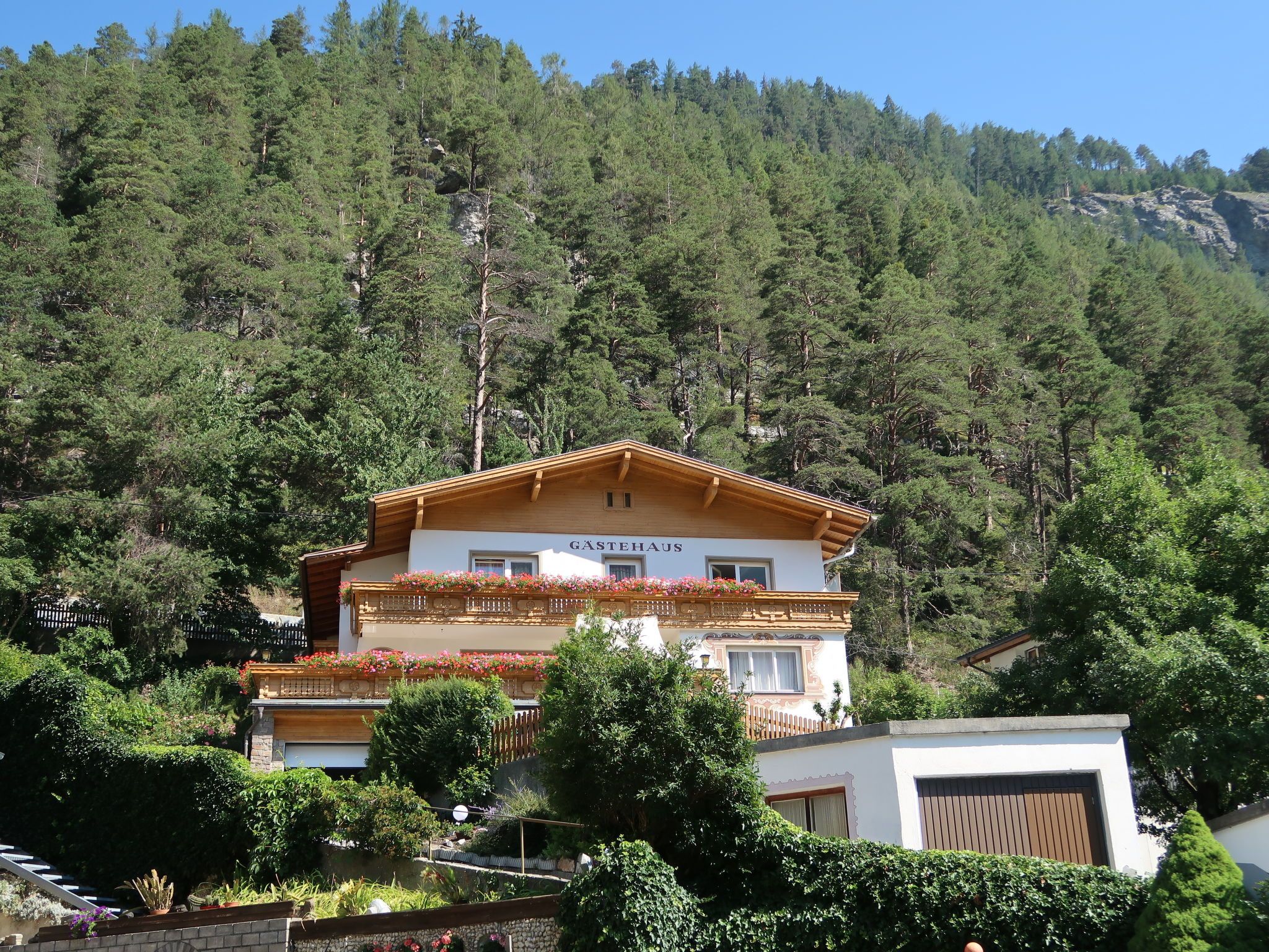 Palman, 9-Zimmer-Haus 200 m2 auf 3 Stockwerken, Südostlage. Zweckmässig und rustikal eingerichtet: grosses Wohn-/Esszimmer mit Esstisch, Essecke und Sat-TV. Küche (Backofen, Geschirrspüler, 4 Glaskeramikplatten, Toaster, Wasserkocher, Mikrowelle, elektrische Kaffeemaschine) mit kleinem Esstisch. Dusche/WC. Obergeschoss: 1 Doppelzimmer mit Wintergarten mit 1 Doppelbett, Waschbecken, Dusche/WC und Sat-TV. Ausgang zum Garten. 2 Doppelzimmer, jedes Zimmer mit Waschbecken, Dusche/WC und Sat-TV. 2. Obergeschoss: 3 Doppelzimmer, jedes Zimmer mit Waschbecken, Dusche/WC und Sat-TV. Ausgang zum Balkon. 1 Zimmer mit 1 Bett und Waschbecken. 1 Doppelzimmer. Ölheizung. Teppichboden. 2 Balkone, grosse Terrasse, Gartensitzplatz. Terrassenmöbel, Balkonmöbel. Schöne Sicht auf das Tal, die Ortschaft und Piz Buin. Zur Verfügung: Kinderhochstuhl, Babybett. Internet (Wireless LAN, gratis). Bei Belegung mit weniger Personen als der maximalen Personenzahl stehen nicht alle Wohneinheiten zur Verfügung.