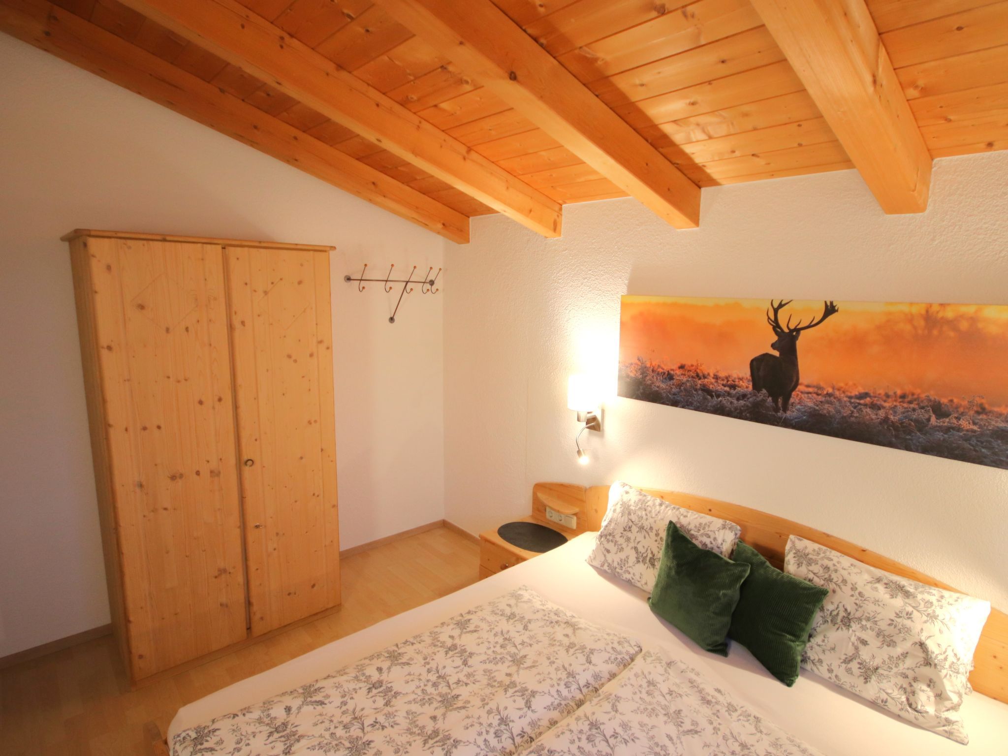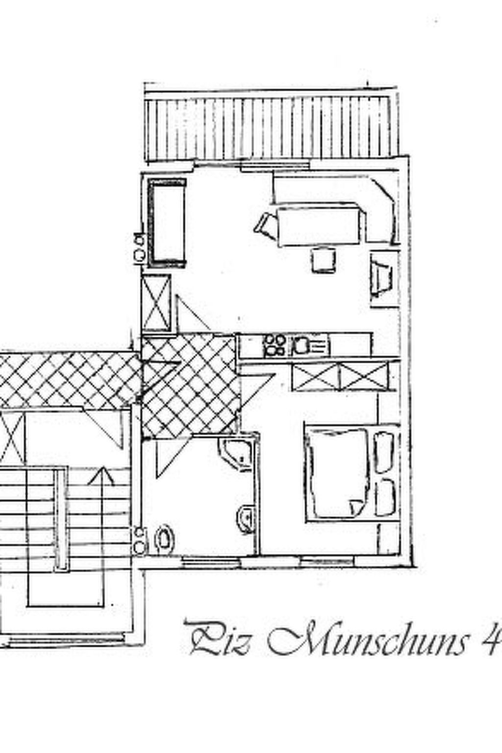 Piz Munschuns, 2-Zimmer-Wohnung 43 m2 im 2. Stock, Südwestlage. Teilweise abgeschrägt, schön und gemütlich eingerichtet: Wohn-/Schlafzimmer mit 1 Doppeldiwanbett, Esstisch und Sat-TV. Ausgang zum Balkon. 1 Doppelzimmer. Offene Küche (Backofen, Geschirrspüler, 4 Induktionskochplatten, Toaster, Wasserkocher, Mikrowelle, elektrische Kaffeemaschine). Dusche/WC. Ölheizung. Balkon. Balkonmöbel. Zur Verfügung: Safe, Kinderhochstuhl, Babybett. Internet (Wireless LAN, gratis). Bitte beachten: Rauchmelder.