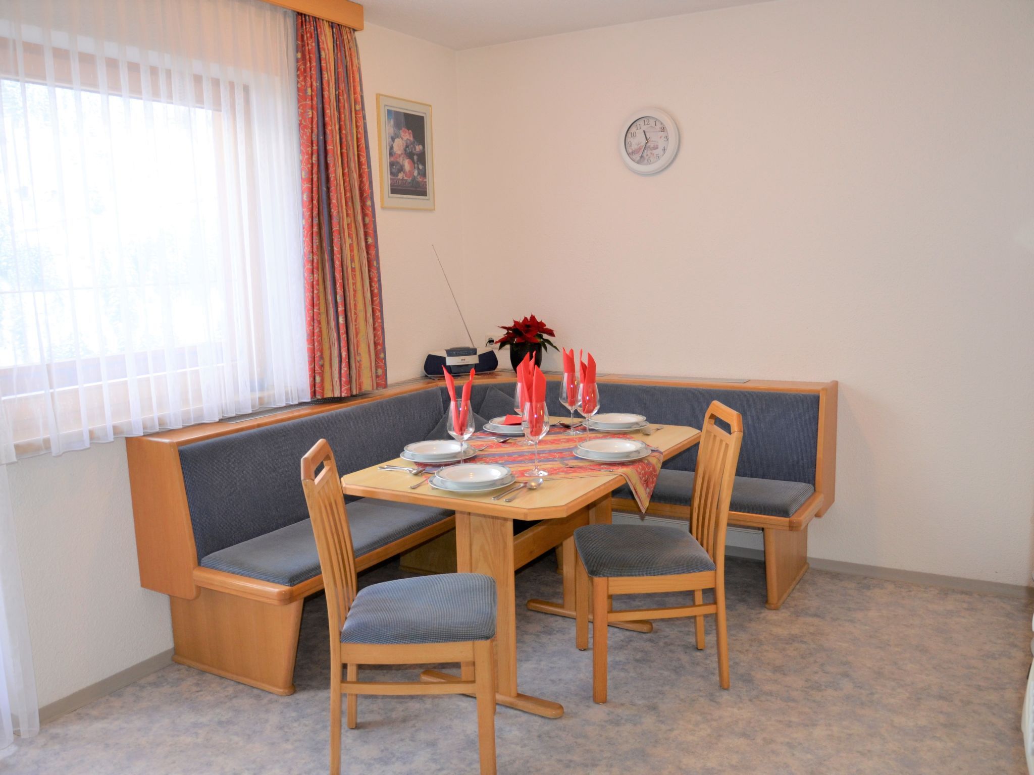 Elfriede, 3-Zimmer-Wohnung 47 m2 im 1. Stock. Hell, zweckmässig eingerichtet: 1 Doppelzimmer. 1 Zimmer mit 1 Bett und 1 Doppeldiwanbett. Wohnküche (4 Kochplatten, Backofen, Toaster, Wasserkocher, elektrische Kaffeemaschine) mit Essecke, Sat-TV und Radio. Ausgang zum Balkon. Dusche, sep. WC. Ölheizung. Teppichboden. Balkon. Balkonmöbel. Zur Verfügung: Kinderhochstuhl, Babybett. Internet (Wireless LAN, gratis). Parkplatz (2 Autos). Bitte beachten: Nichtraucher-Unterkunft. Feuerlöscher. Bei Belegung mit weniger Personen als der maximalen Personenzahl stehen nicht alle Schlafzimmer zur Verfügung.