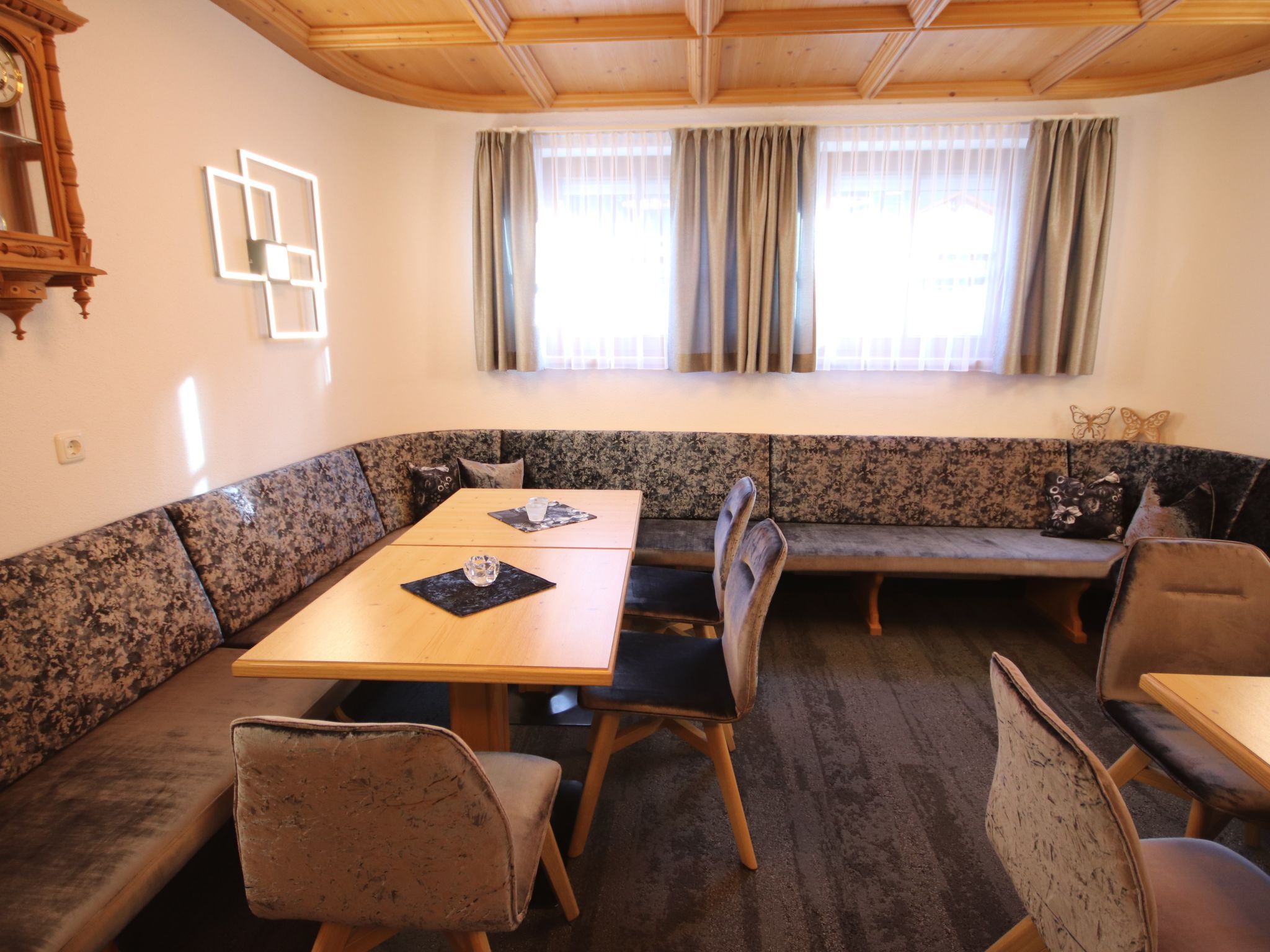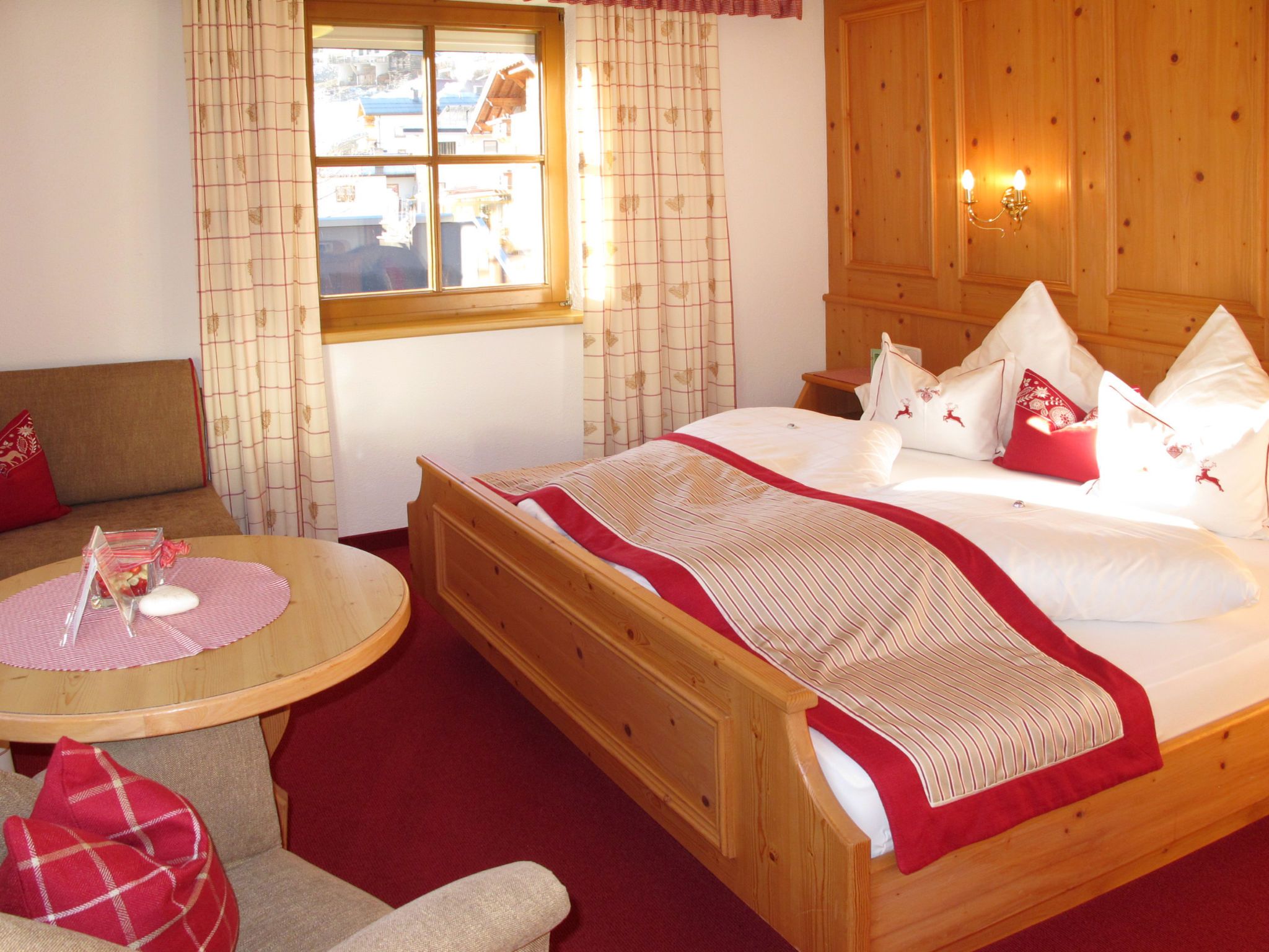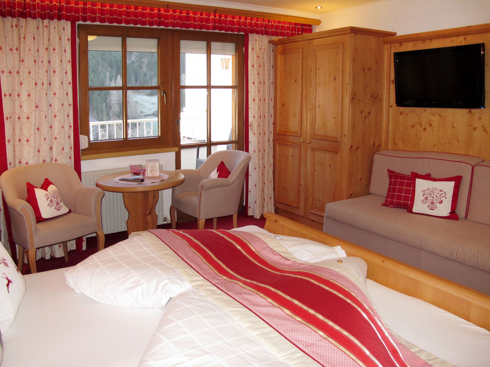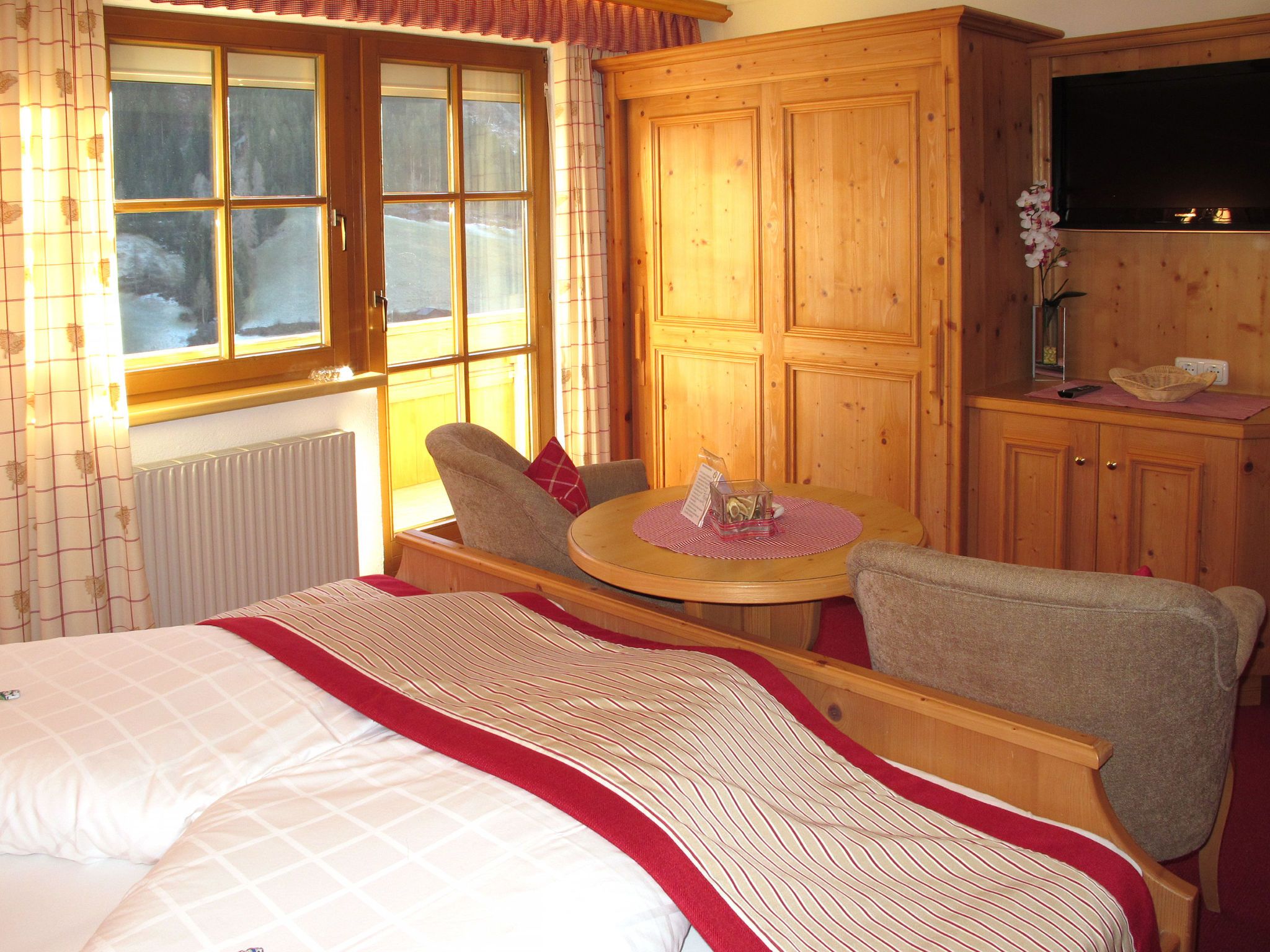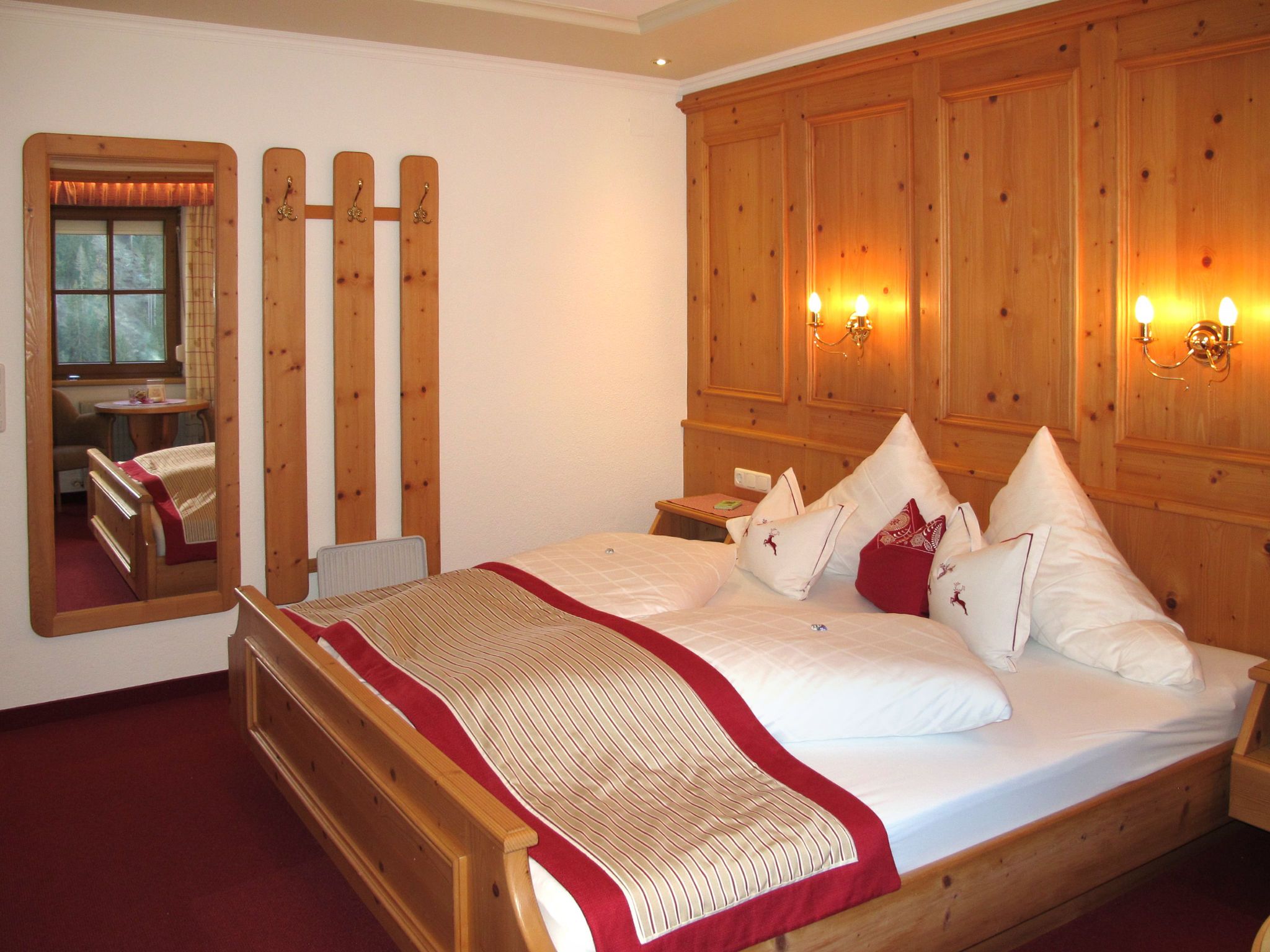 Apart Garni Royal, 7-Zimmer-Wohnung 150 m2 auf 3 Stockwerken. Gemütlich und mit viel Holz eingerichtet: unteres Geschoss: Esszimmer mit Esstisch und Sat-TV. Offene Küche (4 Kochplatten, Backofen, Geschirrspüler, Toaster, Wasserkocher, elektrische Kaffeemaschine). Sep. WC. Obergeschoss: 2 Doppelzimmer, jedes Zimmer mit Dusche/WC und Sat-TV. Ausgang zum Balkon. 1 Zimmer mit 1 Bett, 1 Doppelbett, Dusche/WC und Sat-TV. Ausgang zum Balkon. 2. Obergeschoss: 2 Doppelzimmer, jedes Zimmer mit Dusche/WC und Sat-TV. Ausgang zum Balkon. 1 Zimmer mit 1 Bett, 1 Doppelbett, Dusche/WC und Sat-TV. Ausgang zum Balkon. Heizung. 2 Balkone. Balkonmöbel. Panoramasicht auf die Berge und das Tal. Zur Verfügung: Safe, Babybett, Haartrockner. Internet (Wireless LAN, gratis). Bitte beachten: Nichtraucher-Unterkunft. Rauchmelder, Feuerlöscher. Hinweis: Alle Zimmer sind vom gemeinsamen Hausflur und dem gemeinsamen Treppenhaus aus separat zugänglich.
