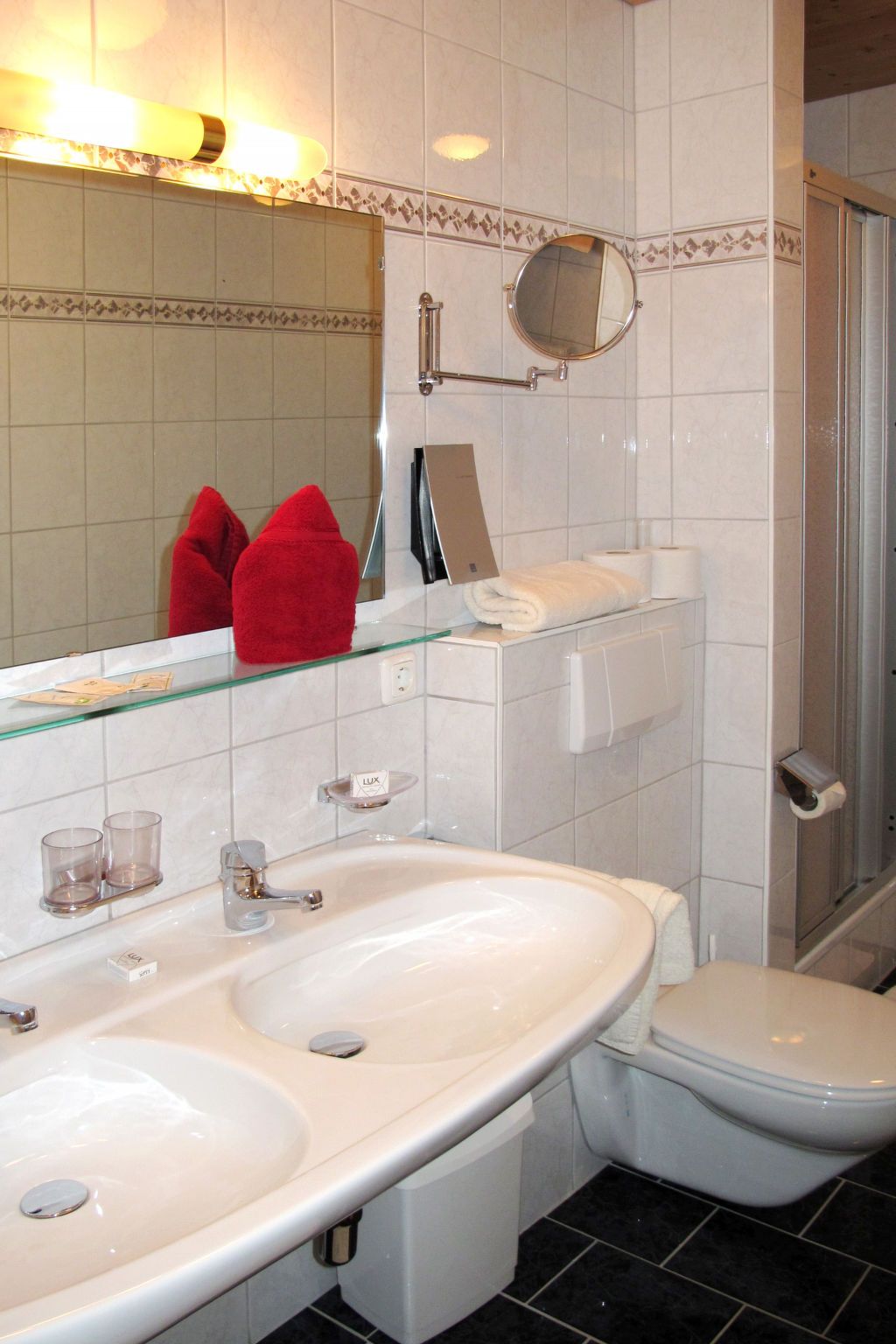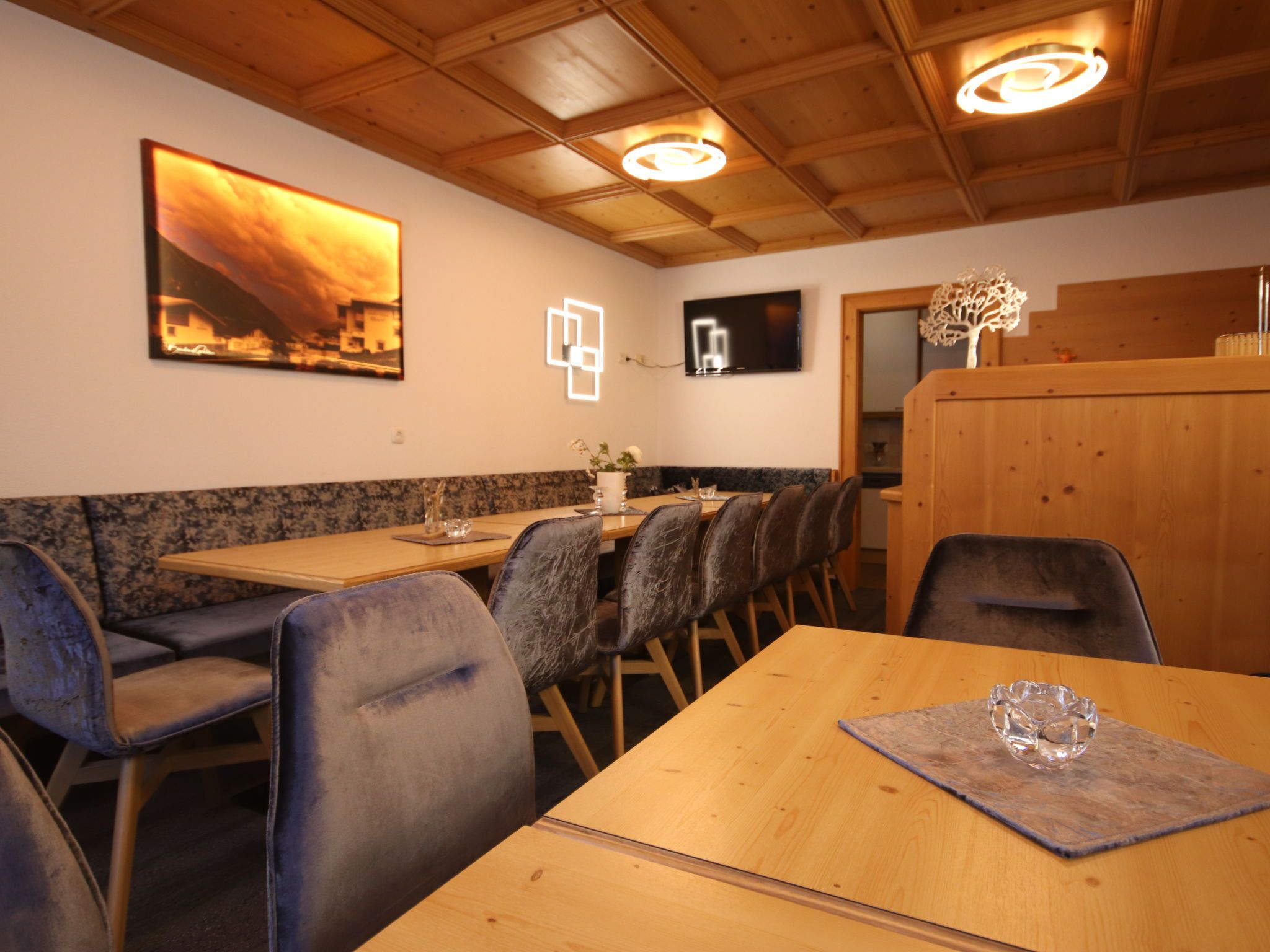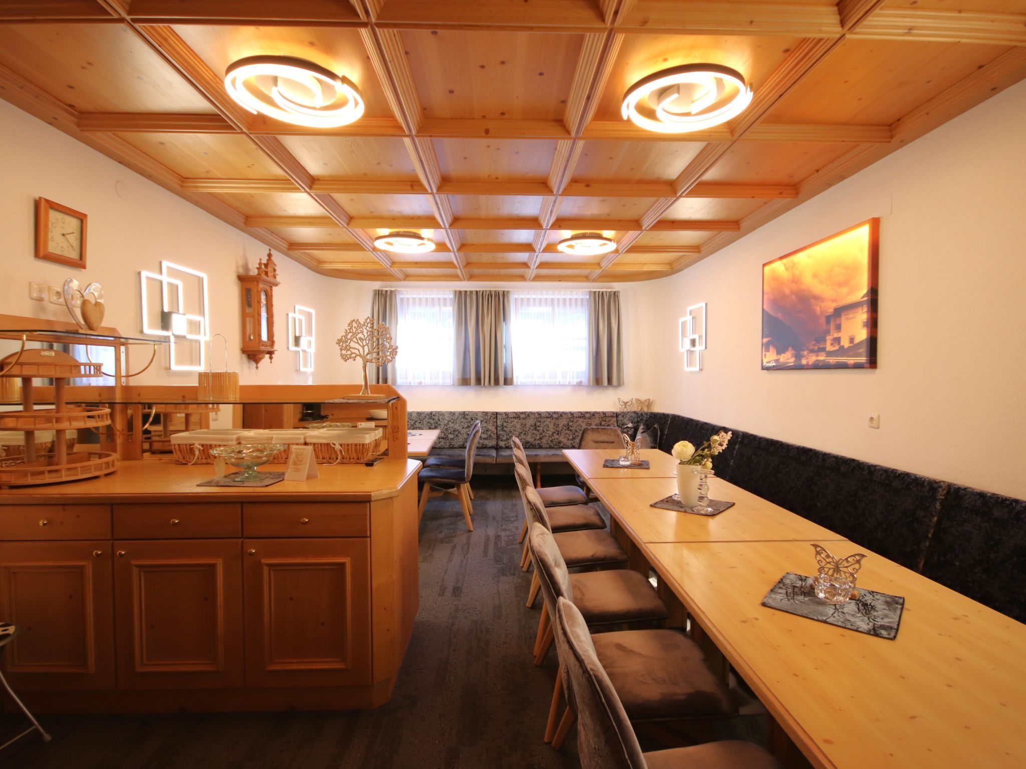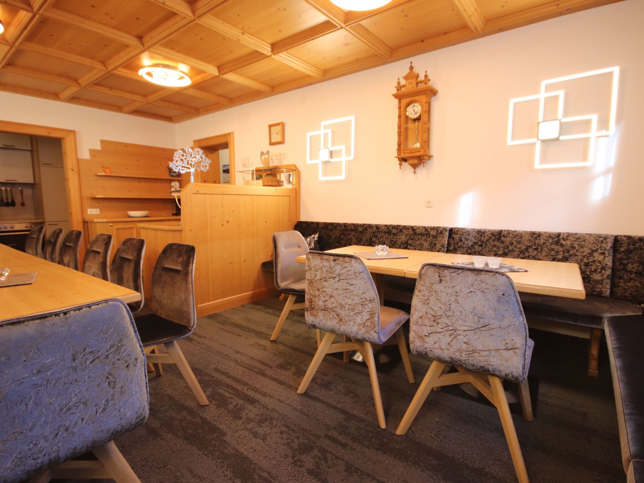 Apart Garni Royal, 7-Zimmer-Wohnung 150 m2 auf 3 Stockwerken. Gemütlich und mit viel Holz eingerichtet: unteres Geschoss: Esszimmer mit Esstisch und Sat-TV. Offene Küche (4 Kochplatten, Backofen, Geschirrspüler, Toaster, Wasserkocher, elektrische Kaffeemaschine). Sep. WC. Obergeschoss: 2 Doppelzimmer, jedes Zimmer mit Dusche/WC und Sat-TV. Ausgang zum Balkon. 1 Zimmer mit 1 Bett, 1 Doppelbett, Dusche/WC und Sat-TV. Ausgang zum Balkon. 2. Obergeschoss: 2 Doppelzimmer, jedes Zimmer mit Dusche/WC und Sat-TV. Ausgang zum Balkon. 1 Zimmer mit 1 Bett, 1 Doppelbett, Dusche/WC und Sat-TV. Ausgang zum Balkon. Heizung. 2 Balkone. Balkonmöbel. Panoramasicht auf die Berge und das Tal. Zur Verfügung: Safe, Babybett, Haartrockner. Internet (Wireless LAN, gratis). Bitte beachten: Nichtraucher-Unterkunft. Rauchmelder, Feuerlöscher. Hinweis: Alle Zimmer sind vom gemeinsamen Hausflur und dem gemeinsamen Treppenhaus aus separat zugänglich.