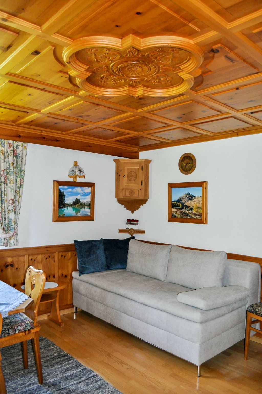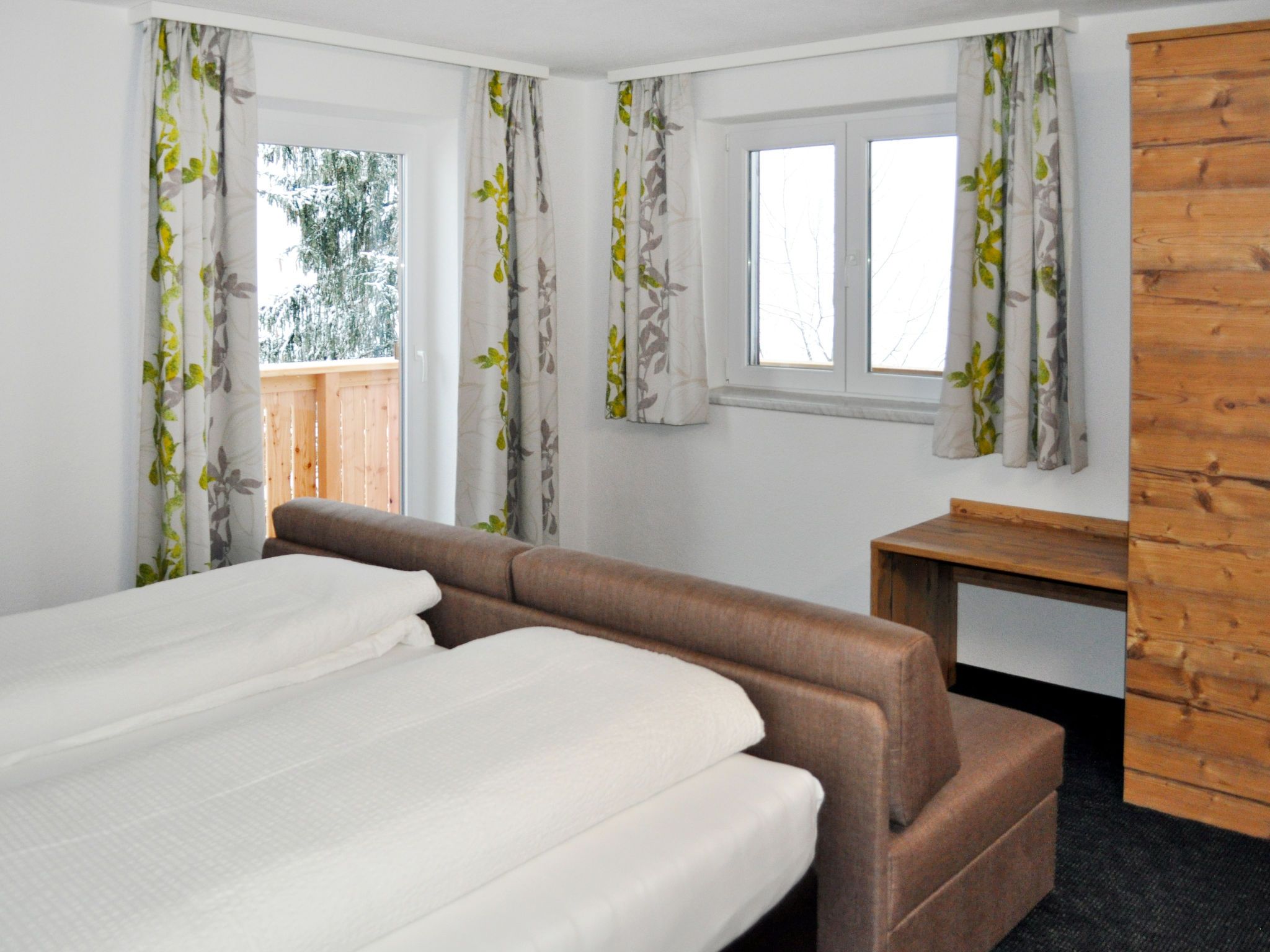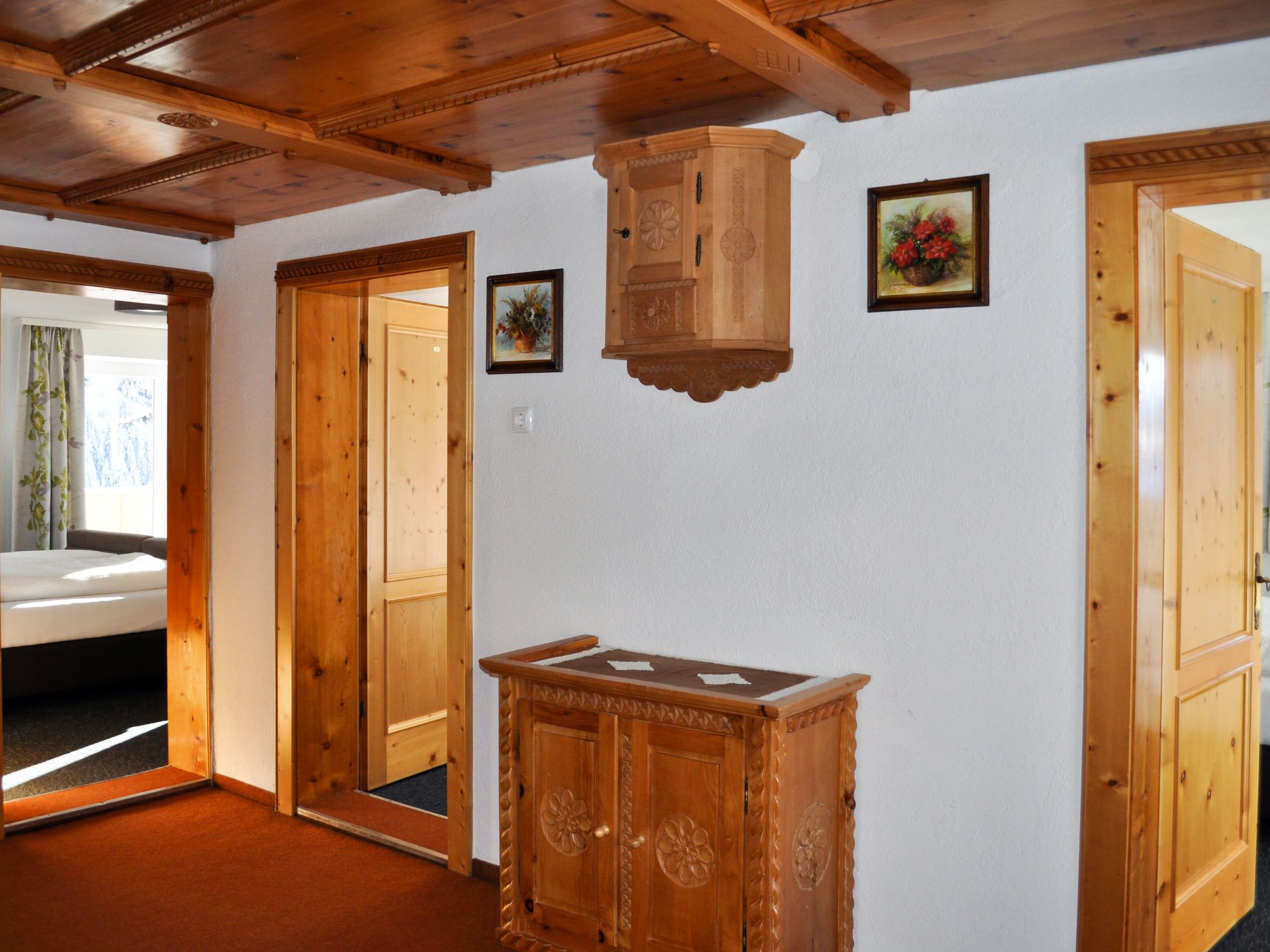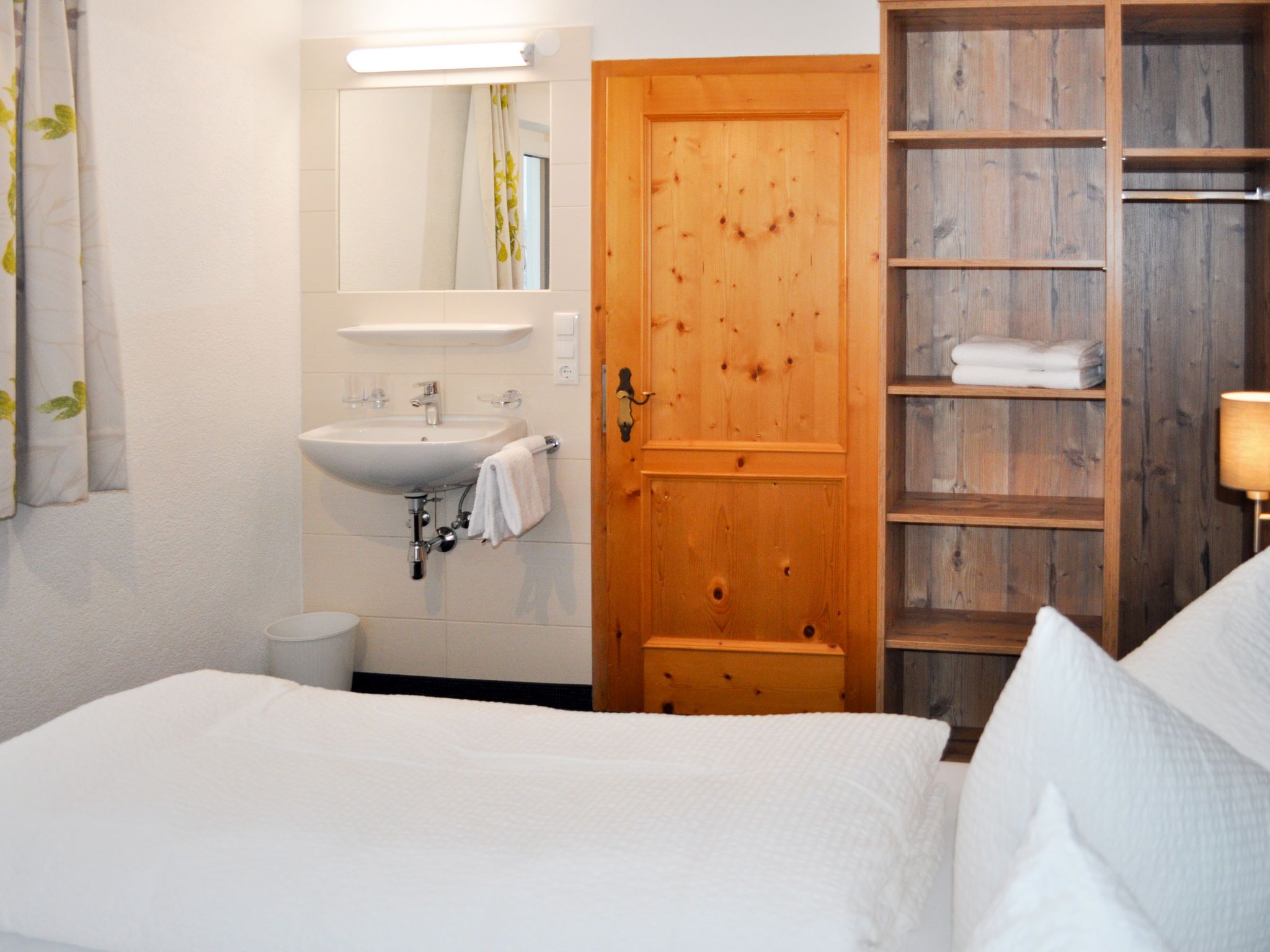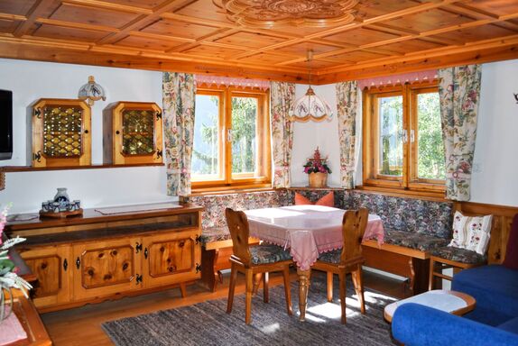 Schönblick, 6-Zimmer-Haus 130 m2 auf 2 Stockwerken. Renoviert im Jahre 2019, gemütlich und mit viel Holz eingerichtet: Wohnzimmer mit Sat-TV. 1 Doppelzimmer mit Waschbecken. Wohnküche (Backofen, Geschirrspüler, 4 Glaskeramikplatten, Toaster, Wasserkocher, Mikrowelle, Tiefkühler, elektrische Kaffeemaschine) mit Essecke. Dusche, sep. WC. Obergeschoss: 2 Doppelzimmer, jedes Zimmer mit Waschbecken. 1 Zimmer mit 1 Diwanbett, 1 Doppelbett und Waschbecken. Ausgang zum Balkon. 1 Zimmer mit 1 Bett und Waschbecken. Dusche/WC. Ölheizung. Teppichboden. Balkon. Schöne Panoramasicht auf das Tal. Zur Verfügung: Internet (Wireless LAN, gratis). Bitte beachten: Nichtraucher-Unterkunft. Feuerlöscher. Im Sommer steht den Gästen eine möblierte Terrasse und ein Garten zur Verfügung.