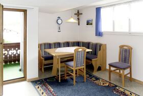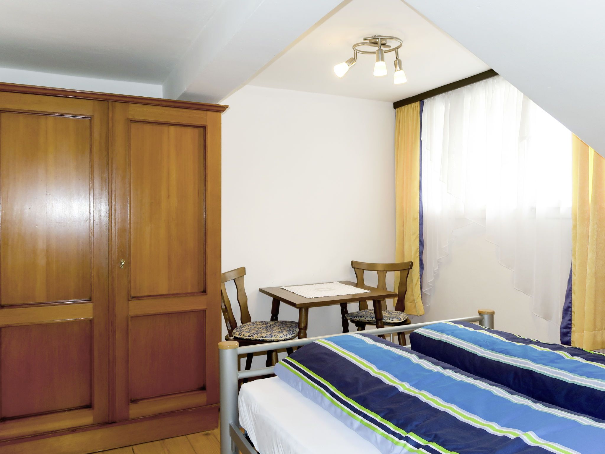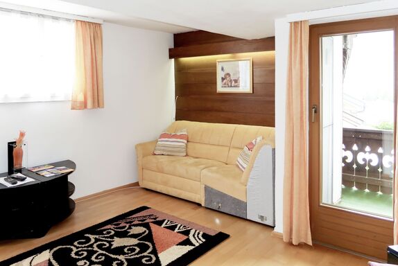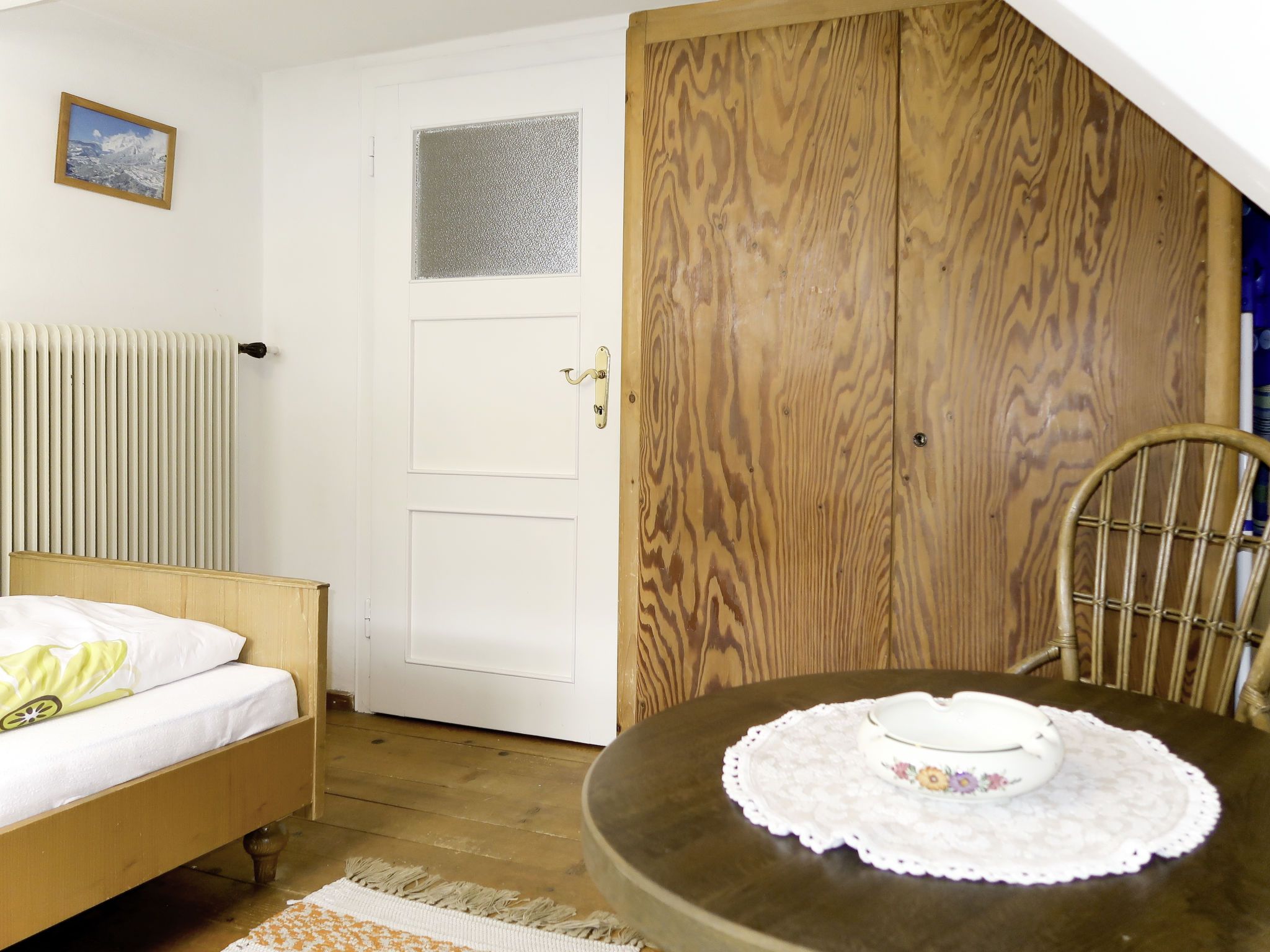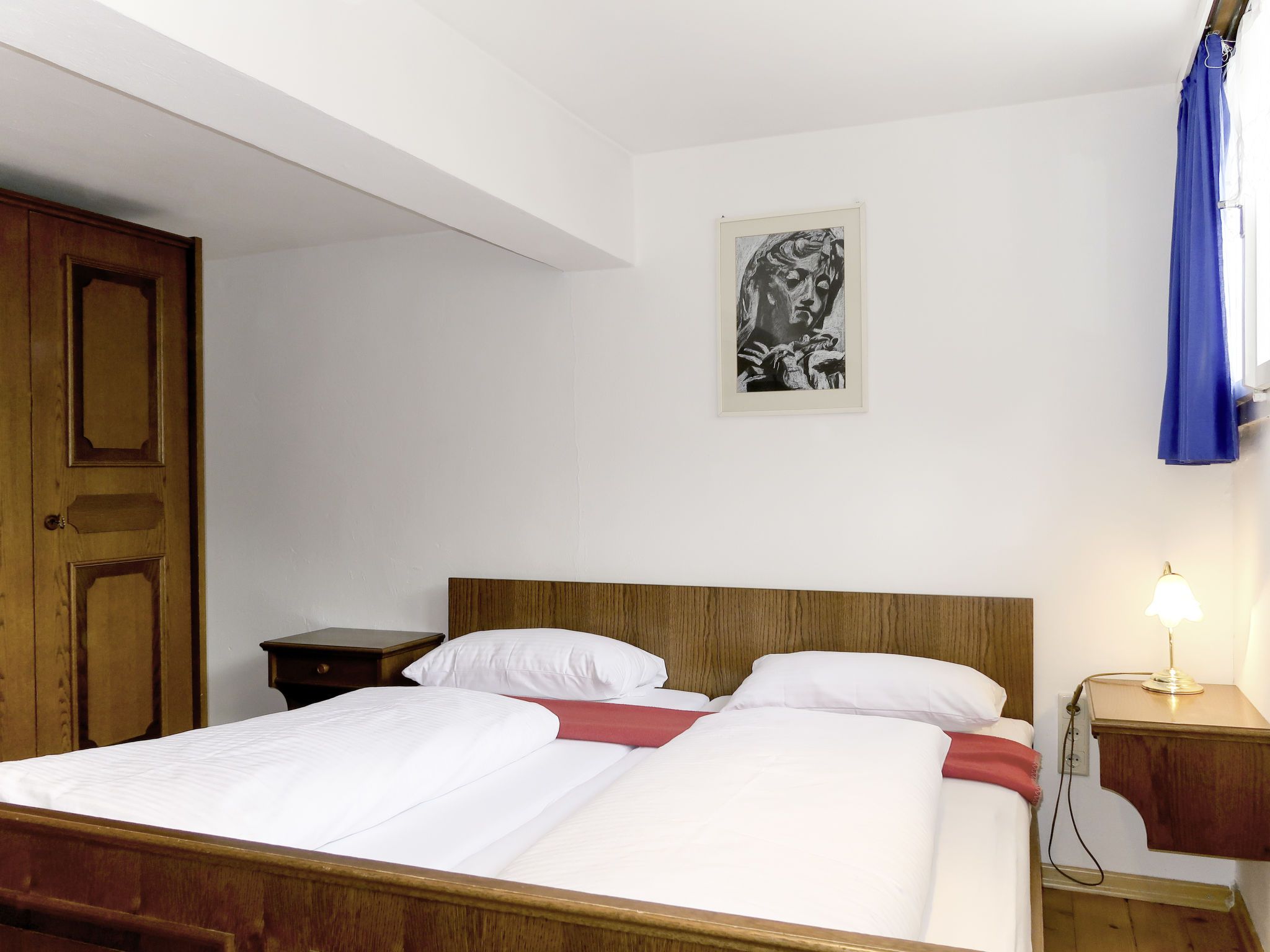 Huber, 4-Zimmer-Wohnung 60 m2 im 2. Stock. Einfach eingerichtet: Wohnzimmer, Deckenhöhe 195 cm, niedrige Türrahmen, Höhe 175 cm mit Sat-TV. Ausgang zum Balkon. 1 abgeschrägtes Zimmer mit 1 franz. Bett. 1 Doppelzimmer. 1 Zimmer mit 1 Bett. Küche (Backofen, Geschirrspüler, 4 Glaskeramikplatten, Toaster, Wasserkocher, elektrische Kaffeemaschine) mit Essecke. Ausgang zum Balkon. Dusche/WC. Ölheizung. Holzdielenboden. Balkon. Balkonmöbel, Abstellkammer. Zur Verfügung: Internet (Wireless LAN, gratis). Parkplatz (1 Auto).