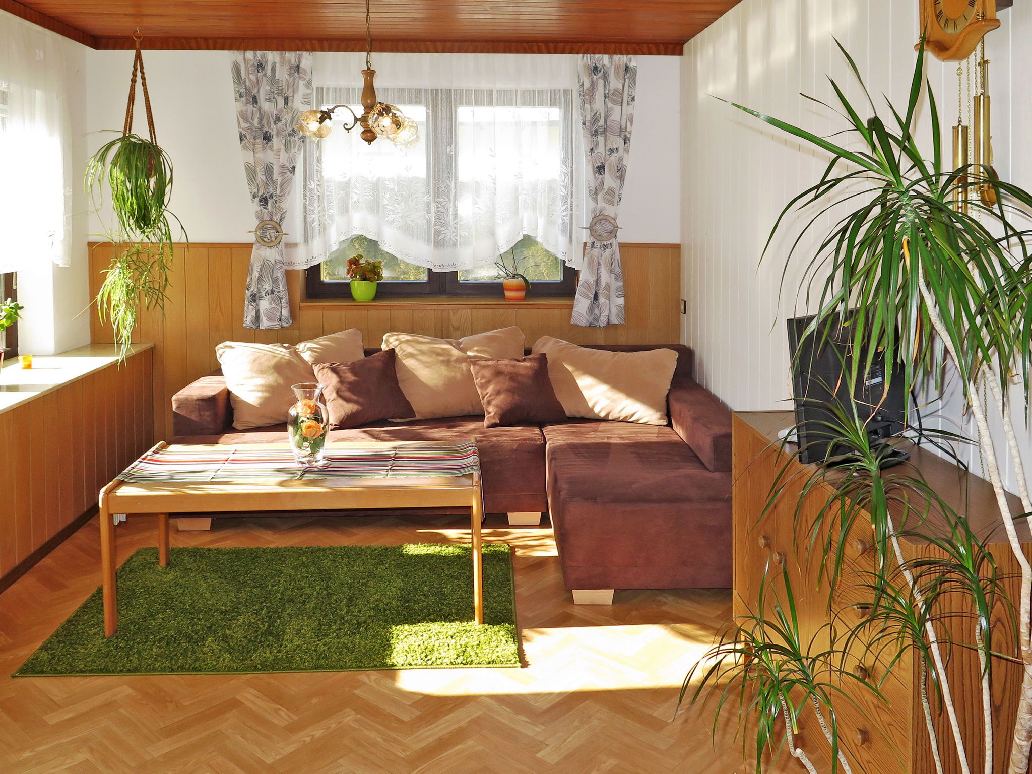 Katharina, 6-Zimmer-Haus 150 m2 auf 2 Stockwerken. Rustikal und mit viel Holz eingerichtet: Wohnzimmer mit Sat-TV. Ausgang zur Terrasse. 2 Zimmer, jedes Zimmer mit 1 Doppelbett. Küche (Backofen, Geschirrspüler, 4 Glaskeramikplatten, Toaster, Wasserkocher, Mikrowelle, Tiefkühler, elektrische Kaffeemaschine) mit Esstisch und Essecke. Bad/Dusche, sep. WC. Obergeschoss: Wohnzimmer mit Sat-TV. Ausgang zum Balkon. 1 Zimmer mit 1 Doppelbett und Dusche/WC. 1 Zimmer mit 1 Doppelbett und Dusche/WC. Ausgang zum Balkon. Ölheizung. Parkettboden. Balkon, Terrasse. Terrassenmöbel, Balkonmöbel, Gartengrill (mobil). Schöne Sicht auf die Berge und Grimming. Zur Verfügung: Kinderhochstuhl, Babybett. Internet (Wireless LAN, gratis). Bitte beachten: Nichtraucher-Haus.