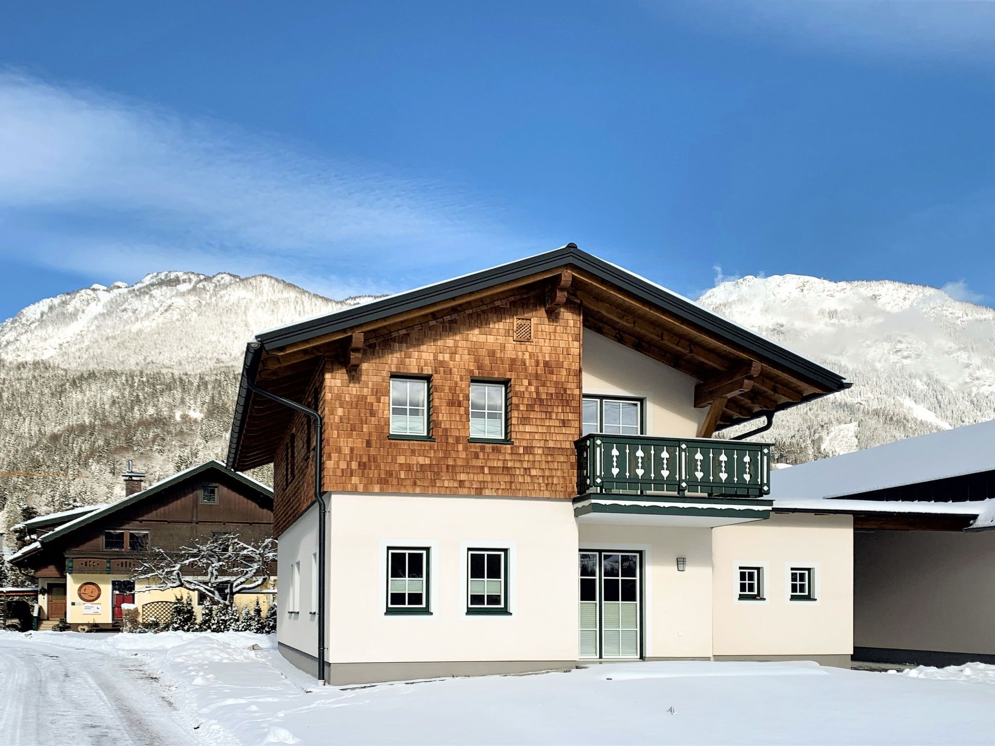 Schönes, freistehendes Landhaus Siedlerhof, 750 m.ü.M., Baujahr 2018, umgeben von Bäumen und Wiesen. Im Ortsteil Weissenbach, 2.5 km vom Zentrum von Haus im Ennstal, 9 km vom Zentrum von Schladming, 11 km vom Zentrum von Ramsau am Dachstein, 4 km vom See, 2 km vom Skigebiet, im Grünen. Zur Mitbenutzung: naturbelassenes Grundstück 600 m2. Tennis (2 x Sandbelag). Zur Alleinbenutzung: Garten 30 m2 (nicht eingezäunt) mit Wiese. Im Hause: Skiraum, Skischuhtrockner. Parkplatz (für 2 Autos, überdacht). Supermarkt 2.5 km, Restaurant 2.5 km, Bushaltestelle 100 m, Bahnstation Haus im Ennstal 1.8 km, Hallenbad 10 km, Badesee Aicher Badesee 4 km. Tennis 20 m, Bergeisenbahn 2 km, Skilift 2 km, Skibushaltestelle 100 m. Hinweis: 2 große Tennisplätze auf dem Grundstück können kostenlos mitbenutzt werden.