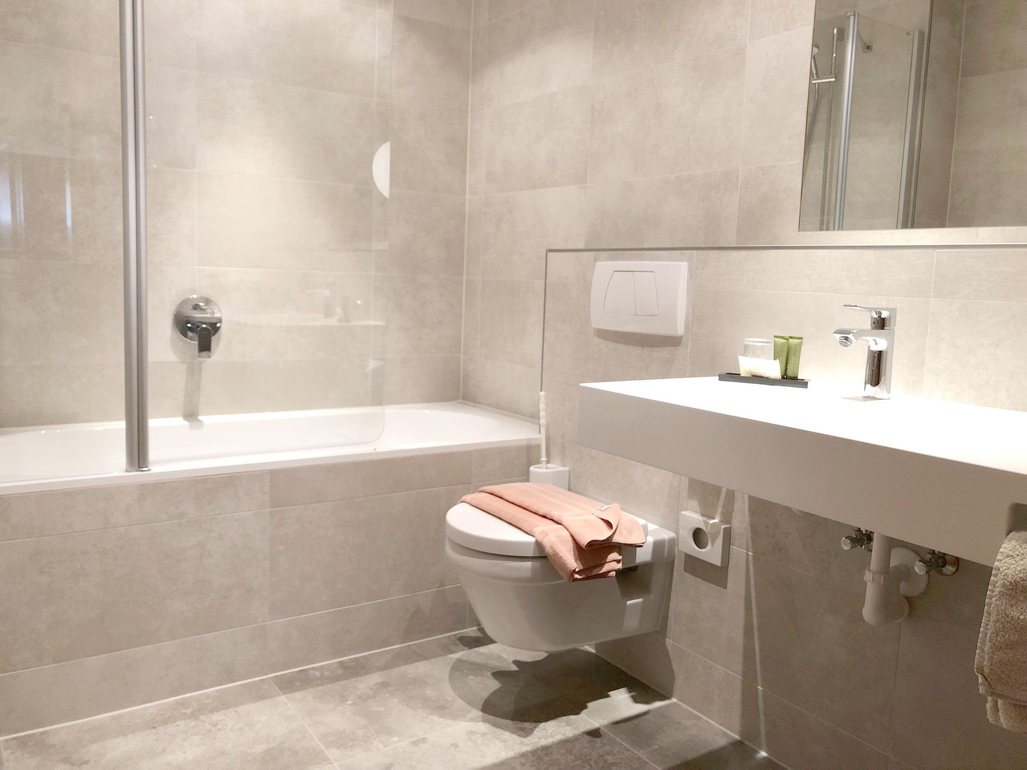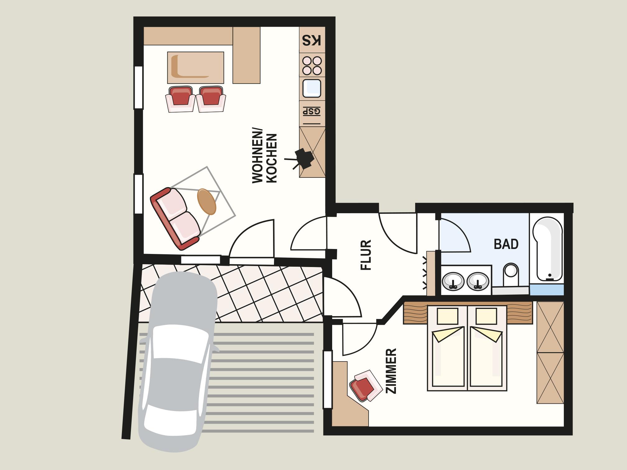 Appartement Typ C2 mit ca. 45 m²: 1 Doppelzimmer; 1 vollausgestattete Wohküche (Cerankochfeld, Backrohr, Geschirrspüler, Mikrowelle, Kaffeemaschine uvm.) mit gemütlichen Sitzecke und ausziehbaren Schlafsofa für zwei weitere Personen; 1 Badezimmer mit einer Duschbadewanne, WC, Haartrockner und Kosmetikspiegel; Flat-TV;