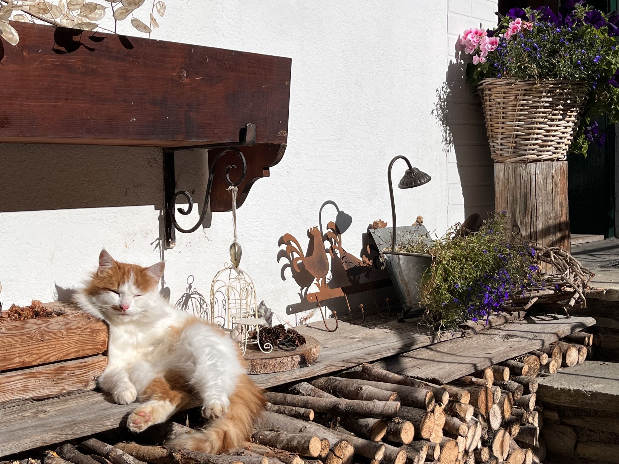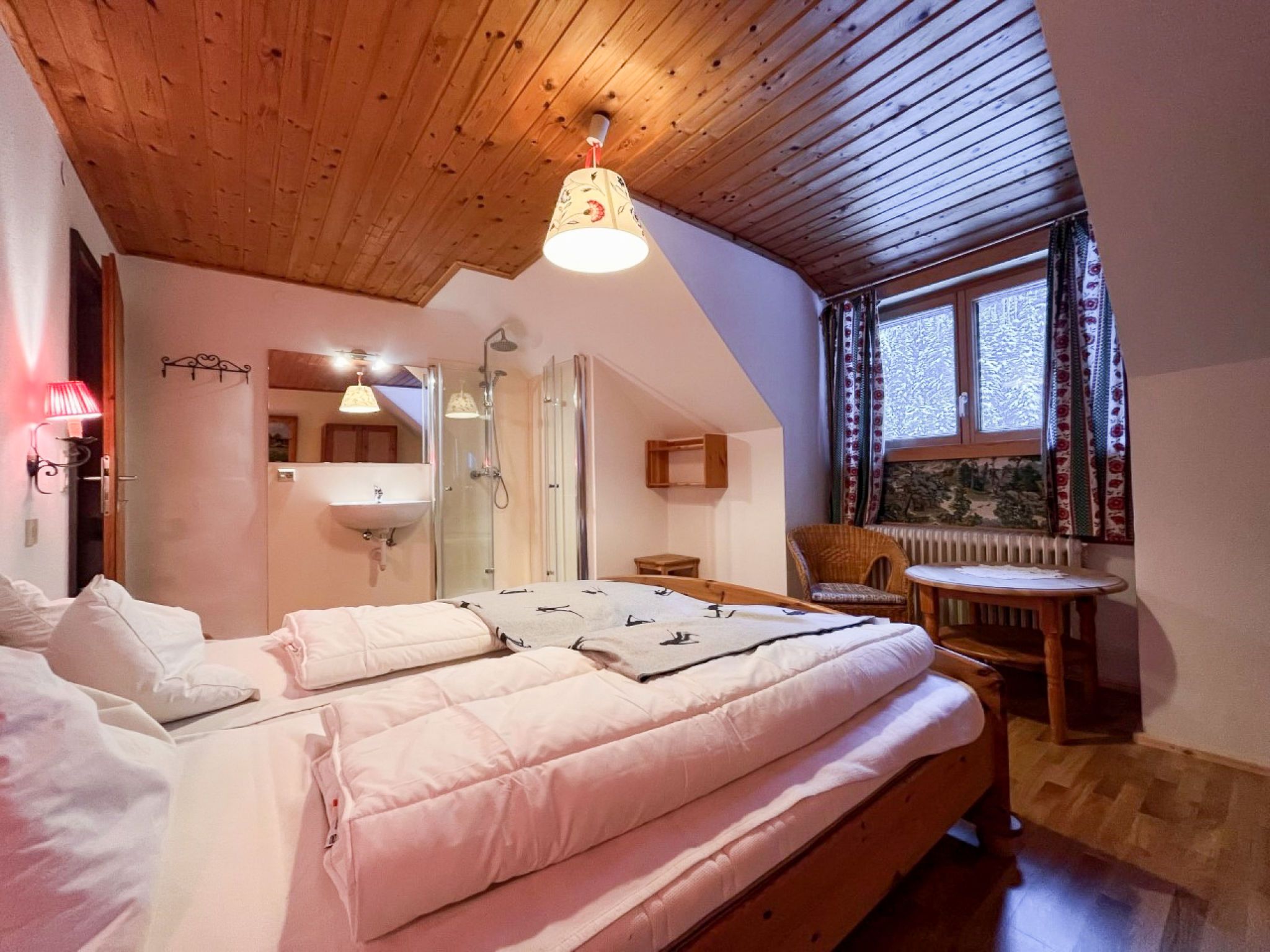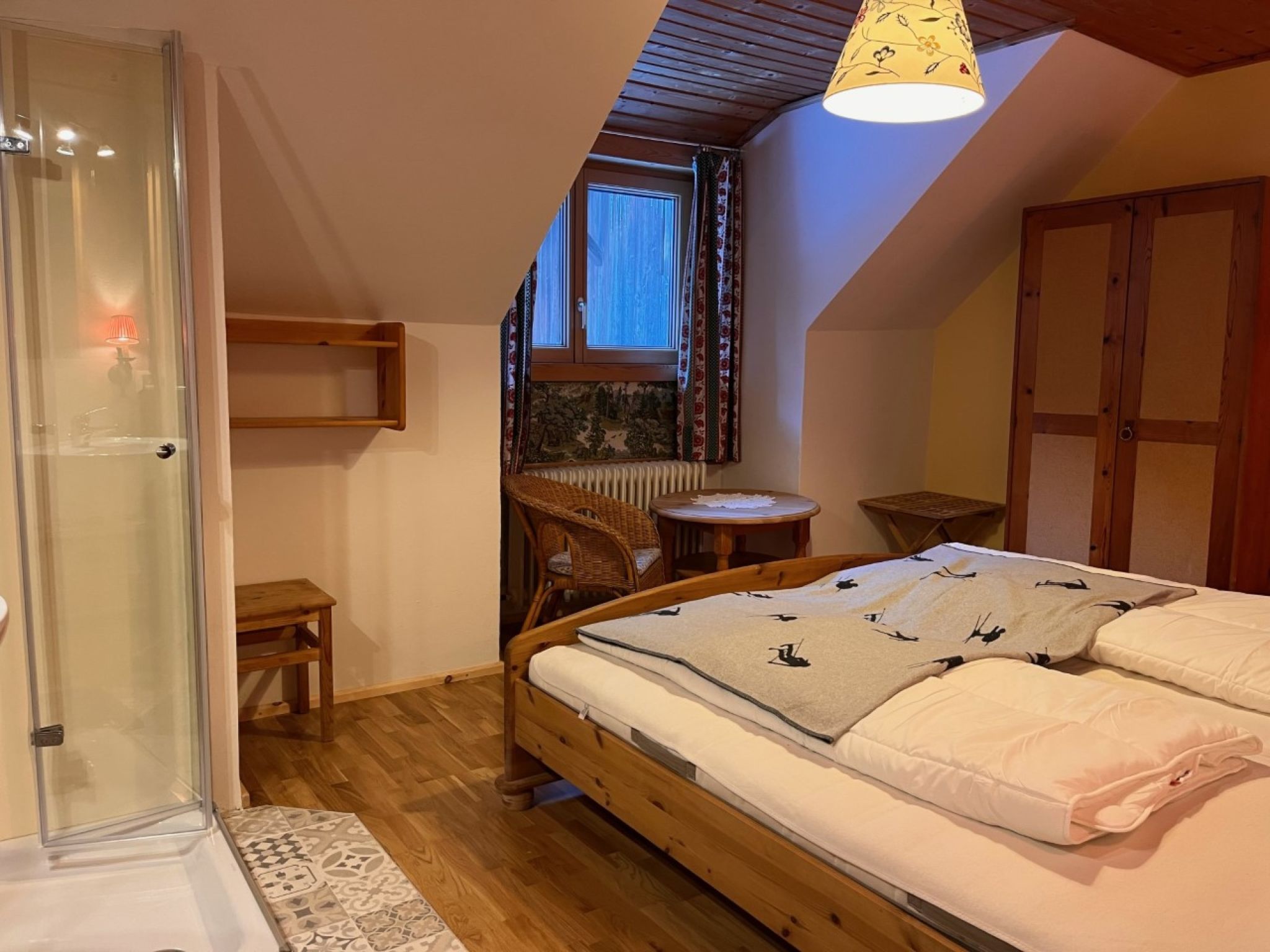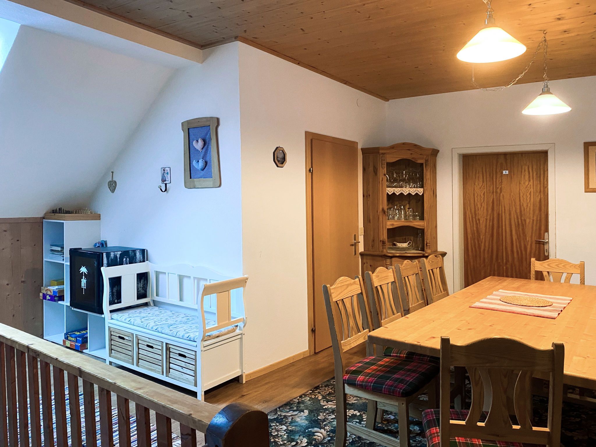 Knaushof, 6-Zimmer-Wohnung 110 m2 im 2. Stock. Teilweise abgeschrägt, stilvoll und gemütlich eingerichtet: Eingang mit Esstisch. 1 Zimmer mit 1 Doppelbett, Waschbecken und Dusche. Ausgang zum Balkon. 1 Zimmer mit 1 Doppelbett, Waschbecken und Dusche. 1 Zimmer mit 1 Doppelbett und Waschbecken. 1 Zimmer mit 2 Betten, 1 Doppelbett und Waschbecken. Ausgang zum Balkon. 1 Zimmer mit 1 Bett, 1 Doppelbett, Waschbecken und Dusche. Ausgang zum Balkon. Wohnküche (Backofen, Geschirrspüler, 4 Glaskeramikplatten, Toaster, Wasserkocher, Mikrowelle, elektrische Kaffeemaschine) mit Esstisch. 2 sep. WC's. Holzheizung. Holzdielenboden, Teppichboden. Balkon. Zur Verfügung: Kinderhochstuhl, Babybett. Internet (WLAN, gratis). Bitte beachten: Maximal 1 Haustier/Hund erlaubt. Rauchmelder.