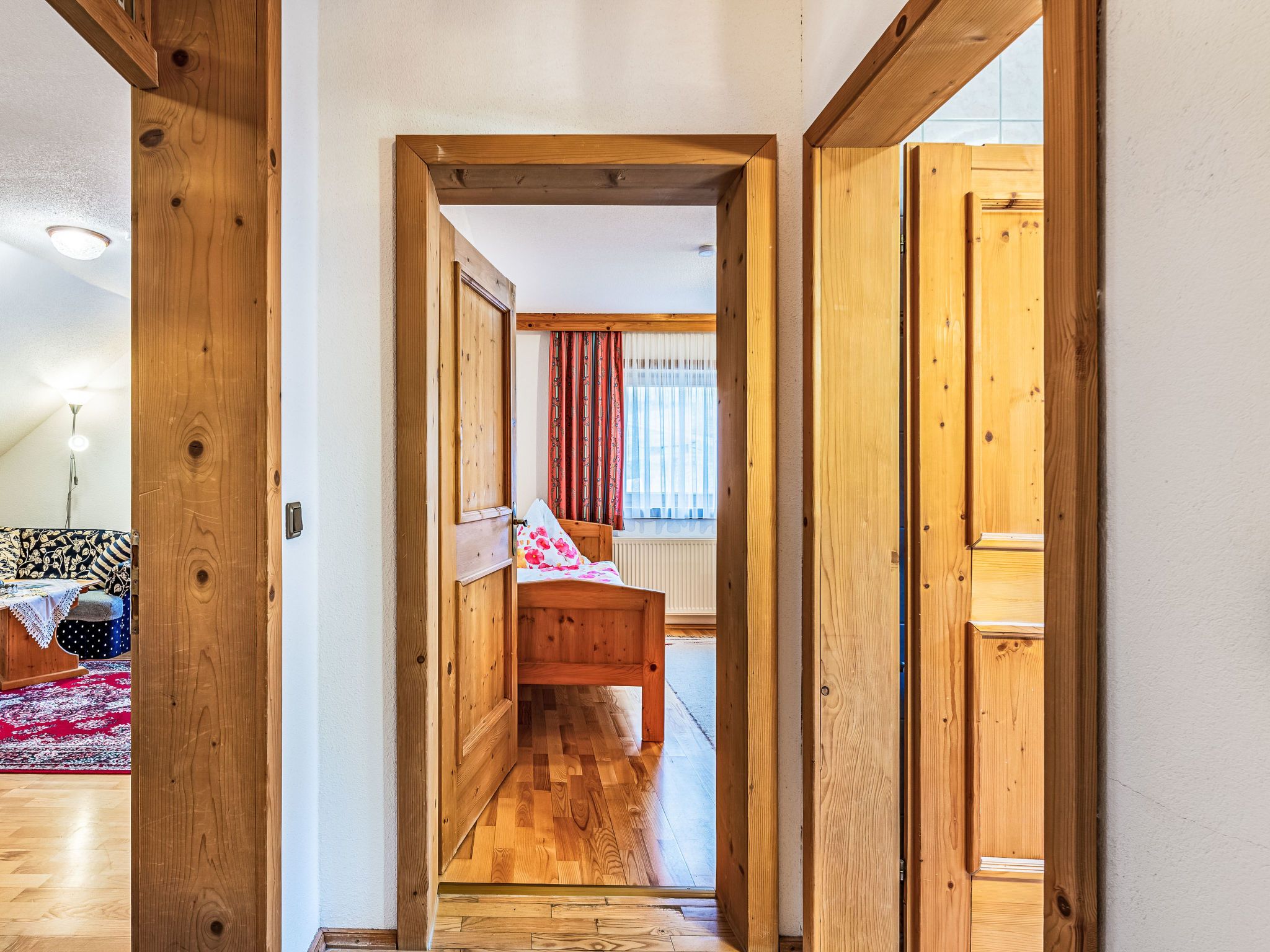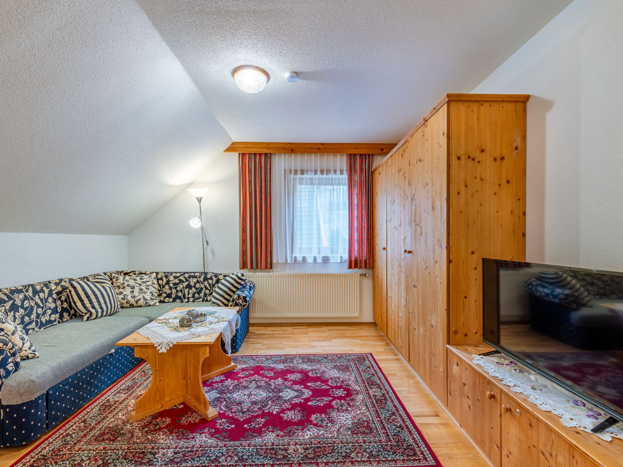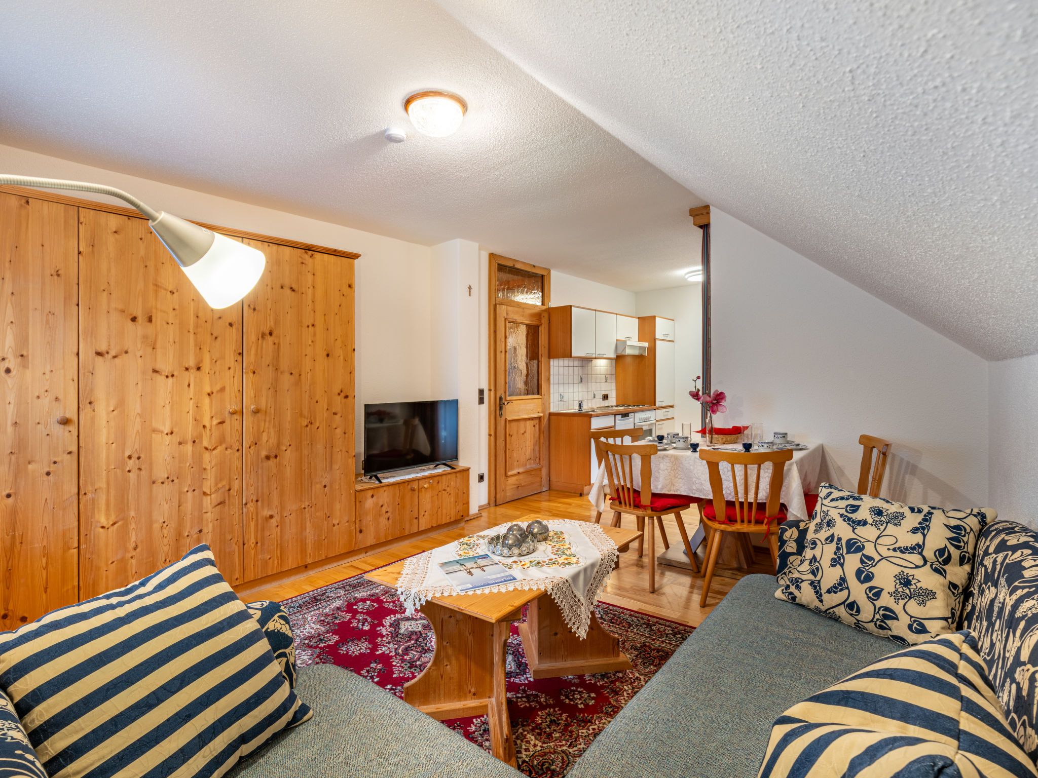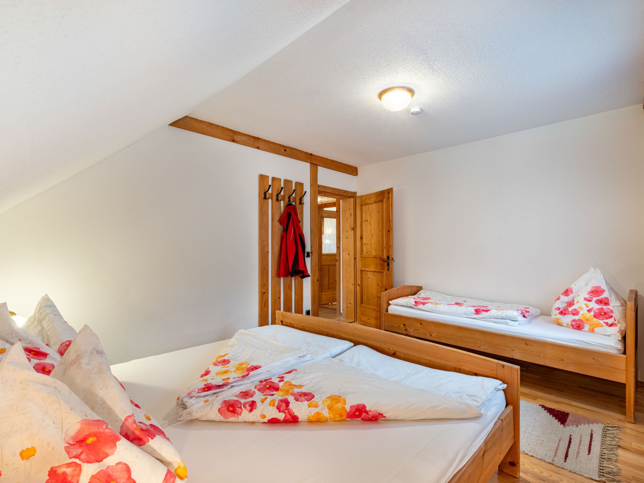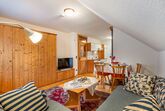 Enzian, 2-Zimmer-Wohnung 45 m2, im Dachgeschoss. Hell, gemütlich eingerichtet: abgeschrägtes Wohn-/Schlafzimmer mit 1 Doppeldiwanbett, Esstisch und Sat-TV. Abgeschrägt 1 Zimmer mit 1 Bett und 1 Doppelbett. Offene Küche (4 Kochplatten, Backofen, Toaster, Wasserkocher, elektrische Kaffeemaschine). Dusche/WC. Heizung. Parkettboden. Balkon. Zur Verfügung: Internet (Wireless LAN, gratis). Bitte beachten: Rauchmelder. Bei Belegung mit weniger Personen als der maximalen Personenzahl stehen nicht alle Wohneinheiten zur Verfügung.