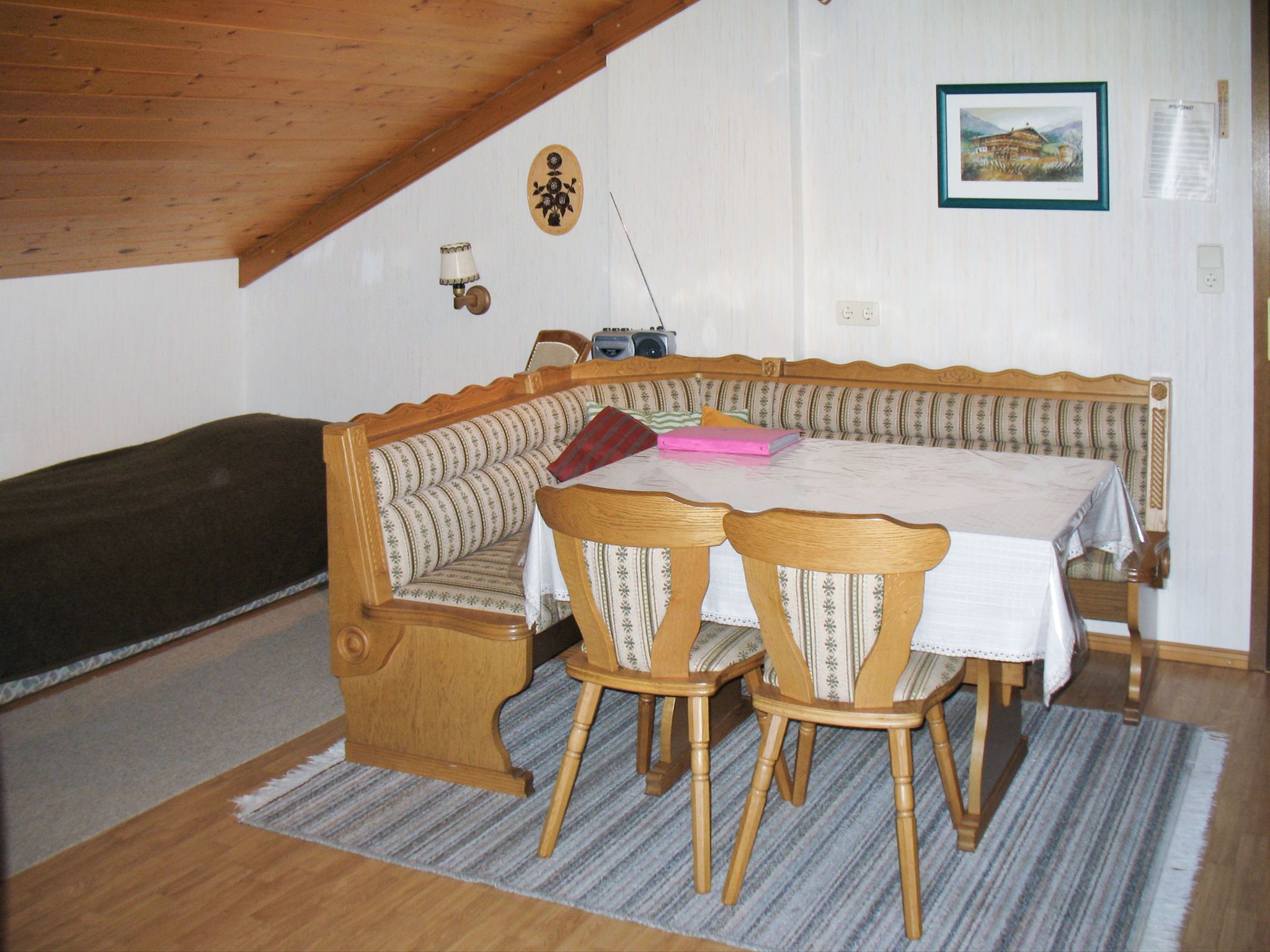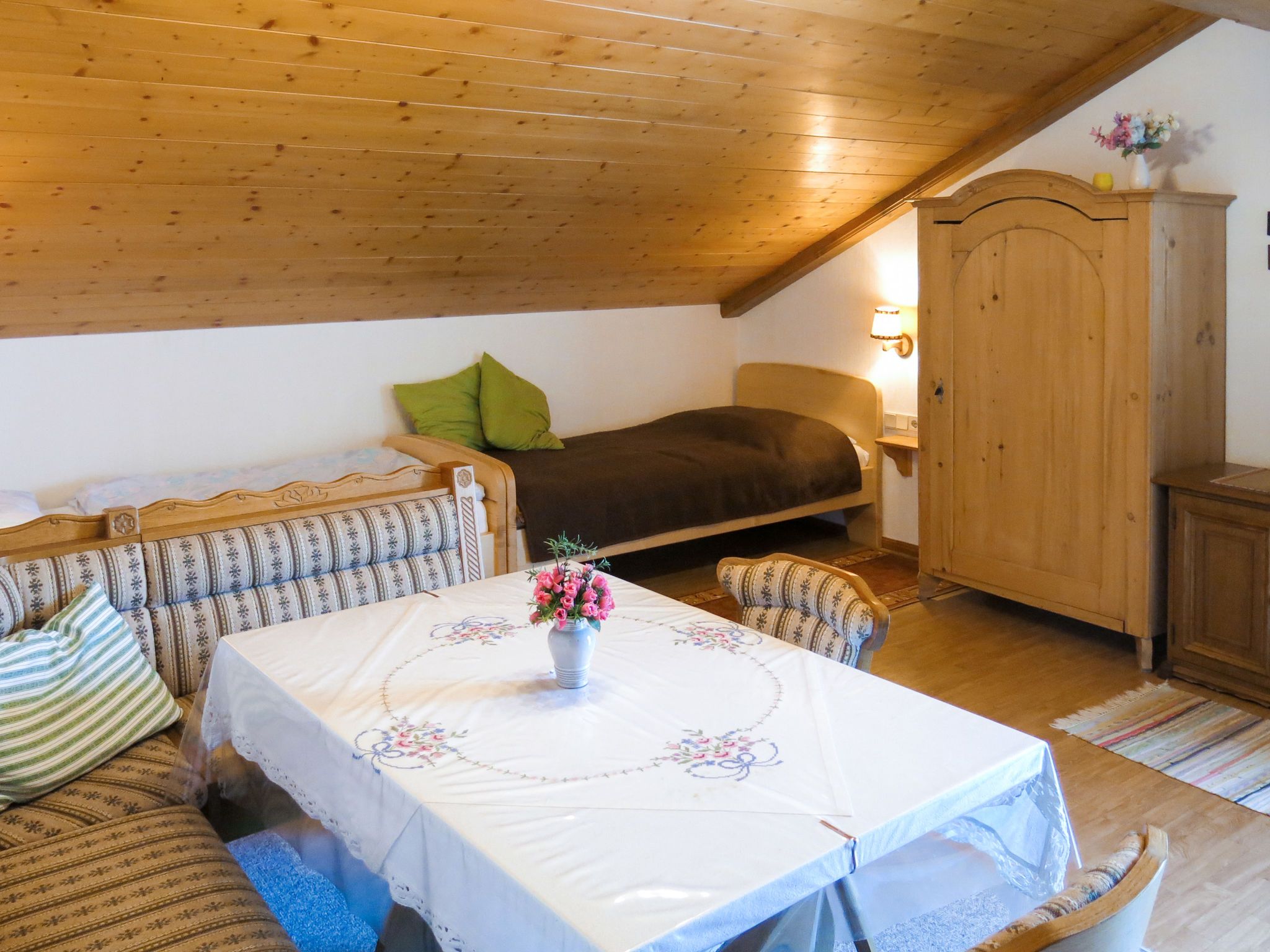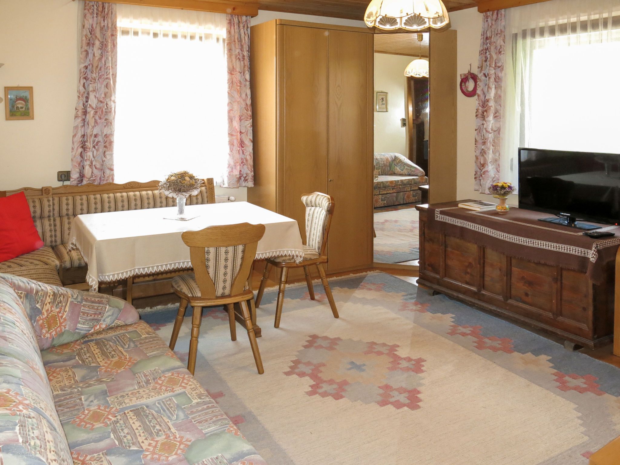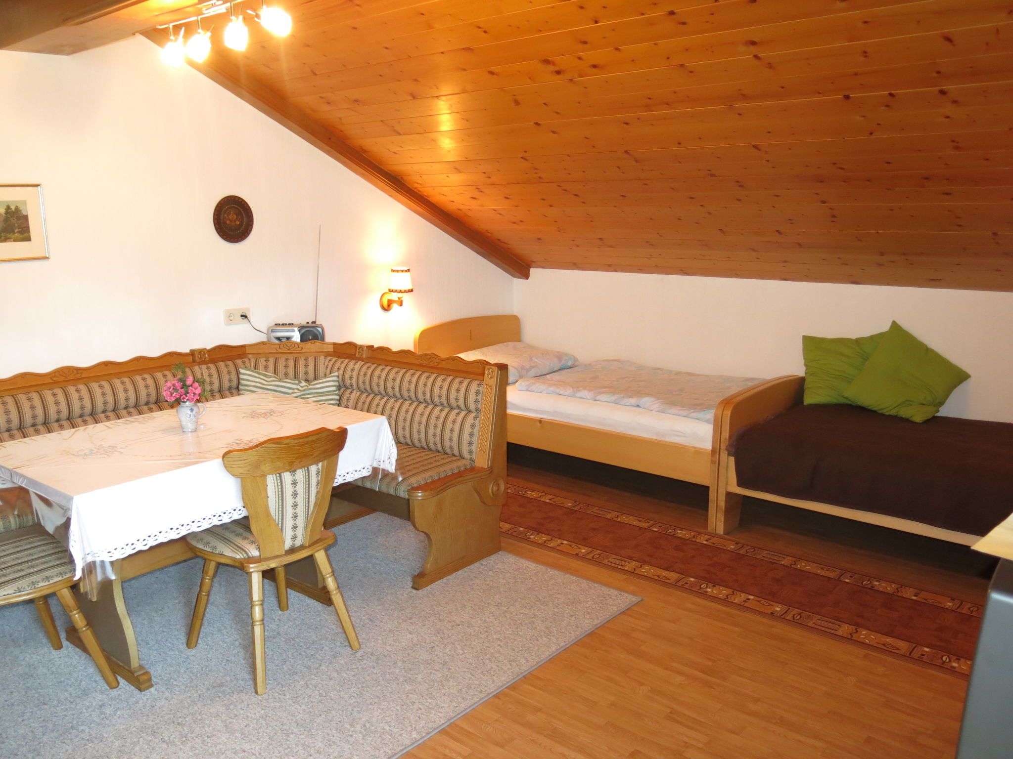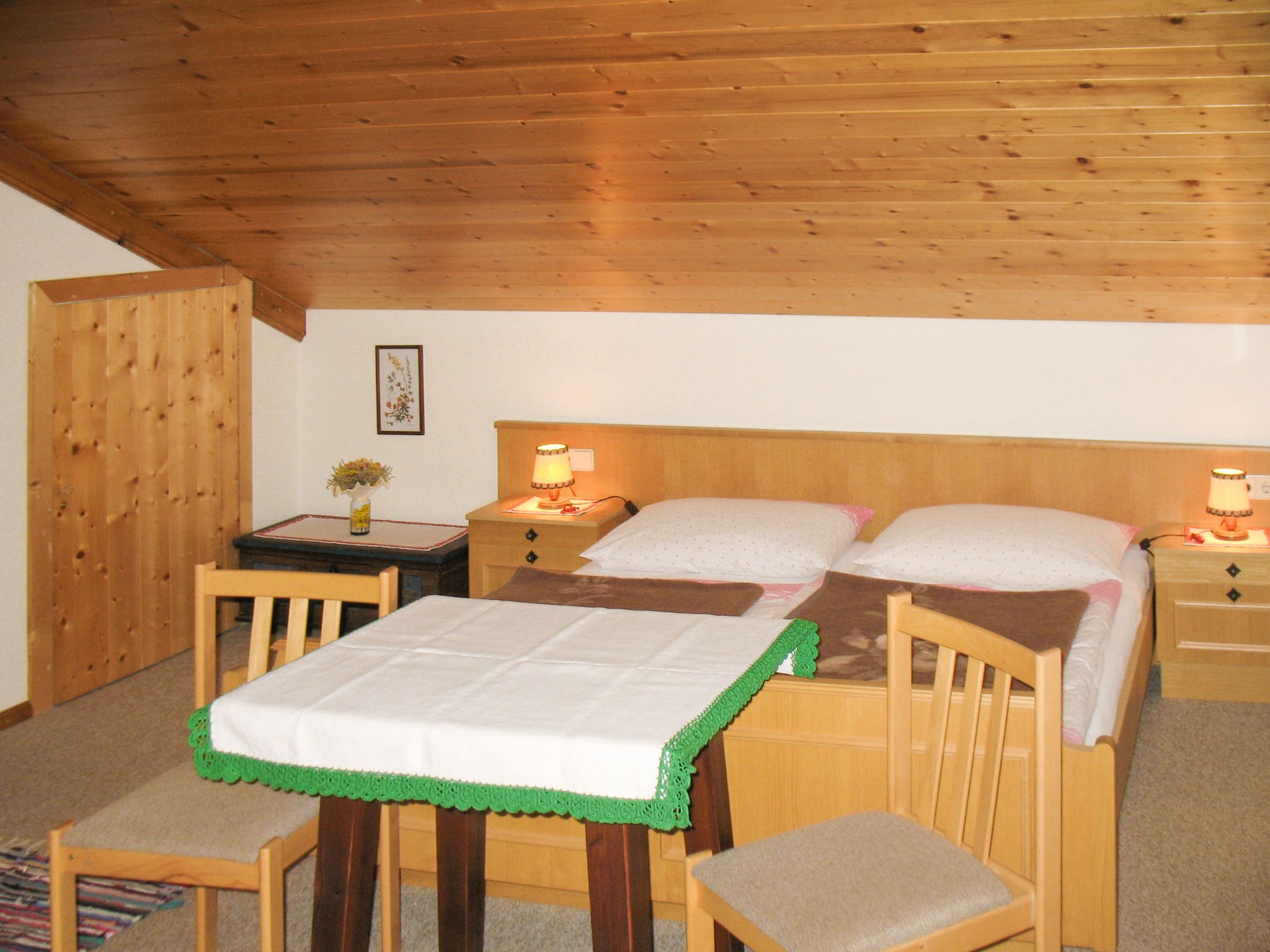 Lassnig, 2-Zimmer-Wohnung 60 m2 im 2. Stock. Einfach und gemütlich eingerichtet: abgeschrägtes Wohn-/Schlafzimmer mit 2 Diwanbetten, Esstisch, Sat-TV und Radio. Ausgang zum Balkon. 1 abgeschrägtes Doppelzimmer. Ausgang zum Balkon. Offene Küche (4 Kochplatten, Backofen, Geschirrspüler, Toaster, Wasserkocher, Mikrowelle, elektrische Kaffeemaschine). Dusche/WC. Heizung. Balkon, Südlage. Schöne Sicht. Zur Verfügung: Internet (Wireless LAN, gratis).