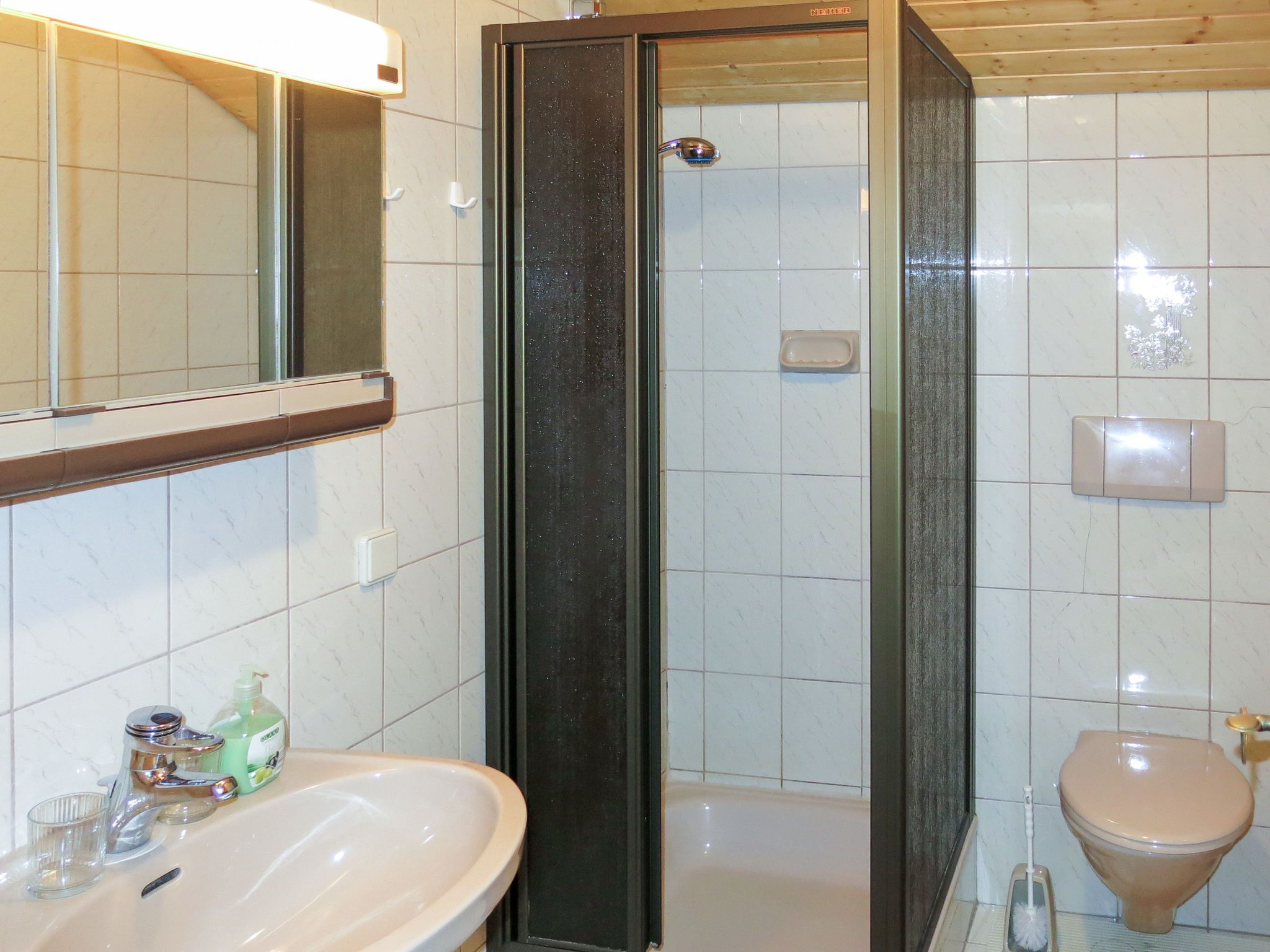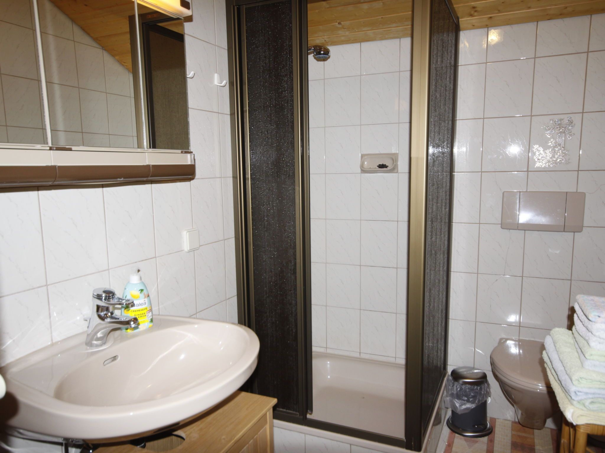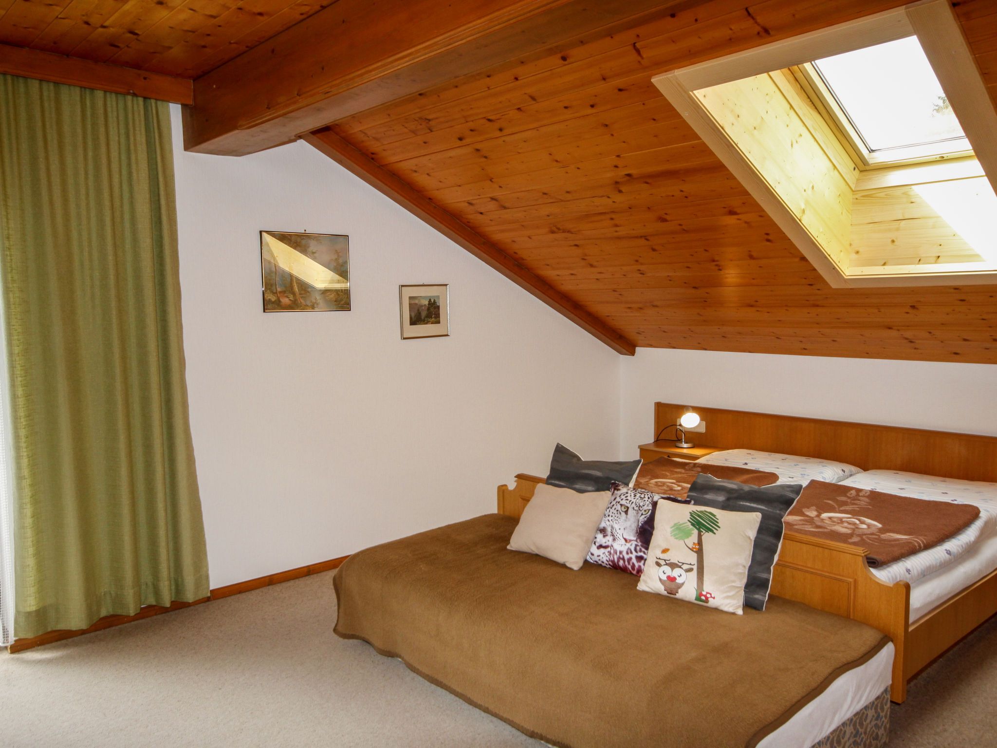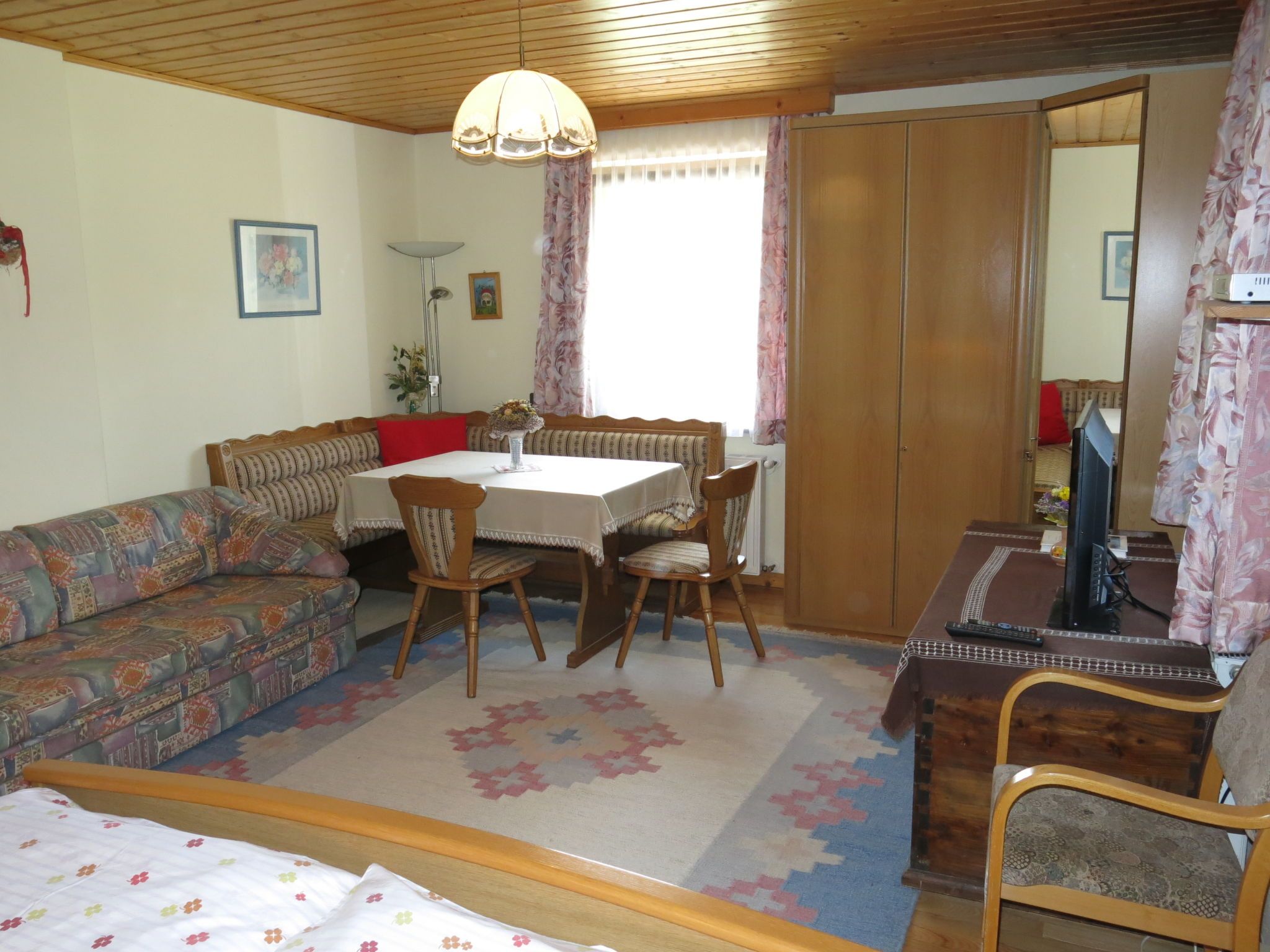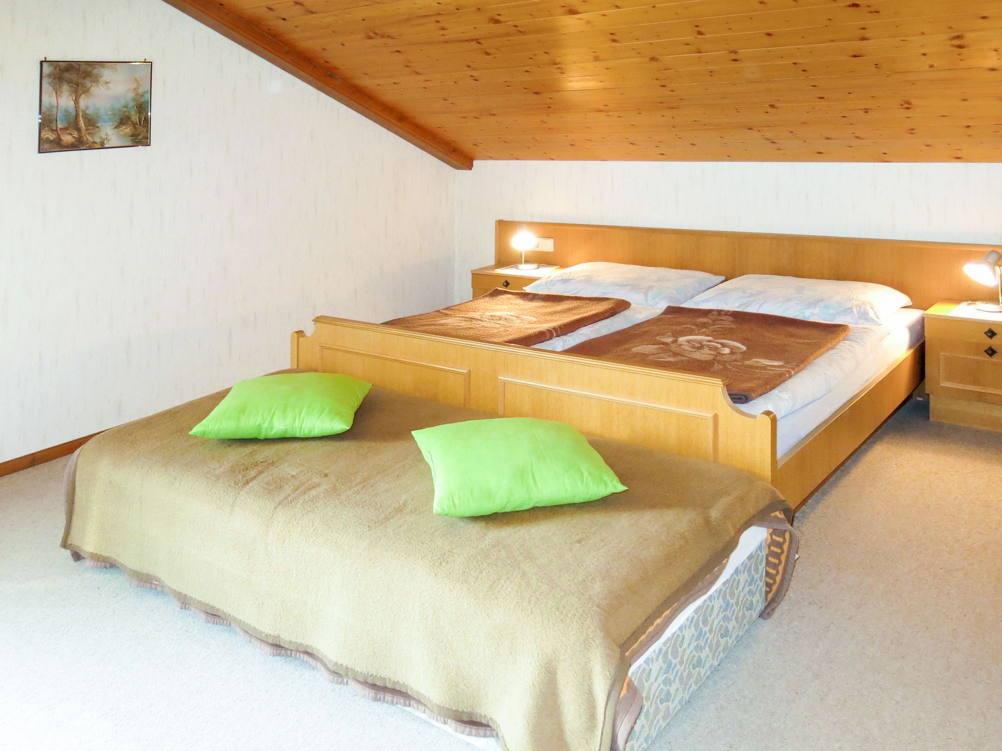 Lassnig, 2-Zimmer-Wohnung 60 m2 im 2. Stock. Einfach und gemütlich eingerichtet: abgeschrägtes Wohn-/Schlafzimmer mit 2 Diwanbetten, Esstisch, Sat-TV und Radio. Ausgang zum Balkon. 1 abgeschrägtes Doppelzimmer. Ausgang zum Balkon. Offene Küche (4 Kochplatten, Backofen, Geschirrspüler, Toaster, Wasserkocher, Mikrowelle, elektrische Kaffeemaschine). Dusche/WC. Heizung. Balkon, Südlage. Schöne Sicht. Zur Verfügung: Internet (Wireless LAN, gratis).