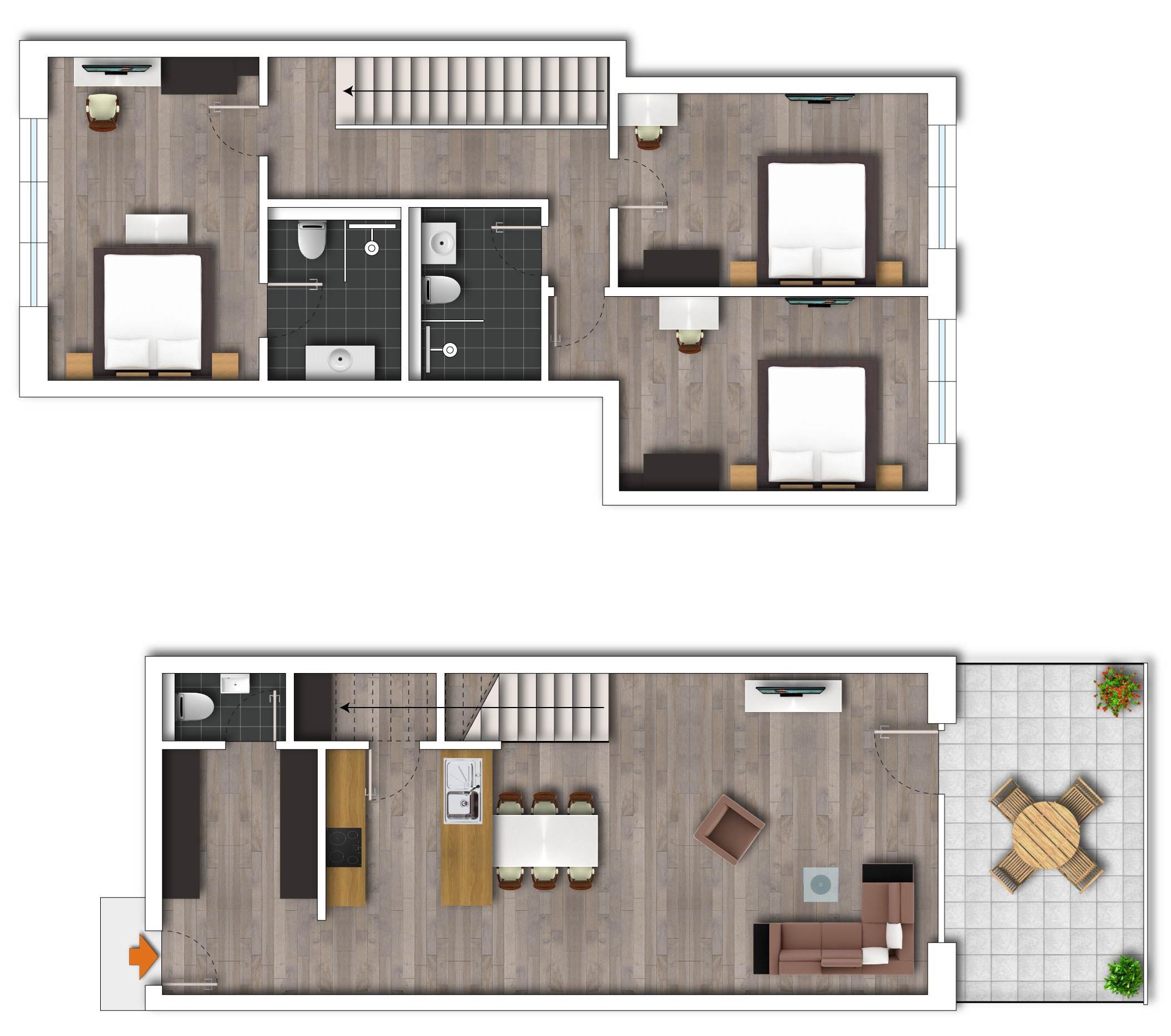 CENTRAL VALLEY PENTHOUSE N°4 mit ca. 128 m² über 2 Etagen: großer Wohnraum mit vollausgestatteter, offener Küche (Geschirrspüler, Backofen, Kaffeemaschine, Wasserkocher, Elektroherd, uvm.) und Essbereich; 1 separates WC, 3 Doppelzimmer; 2 Badezimmer mit Dusche/WC und Pflegeprodukten; TV in den Schlafzimmern und im Wohnbereich; große Terrasse mit ca. 16 m².