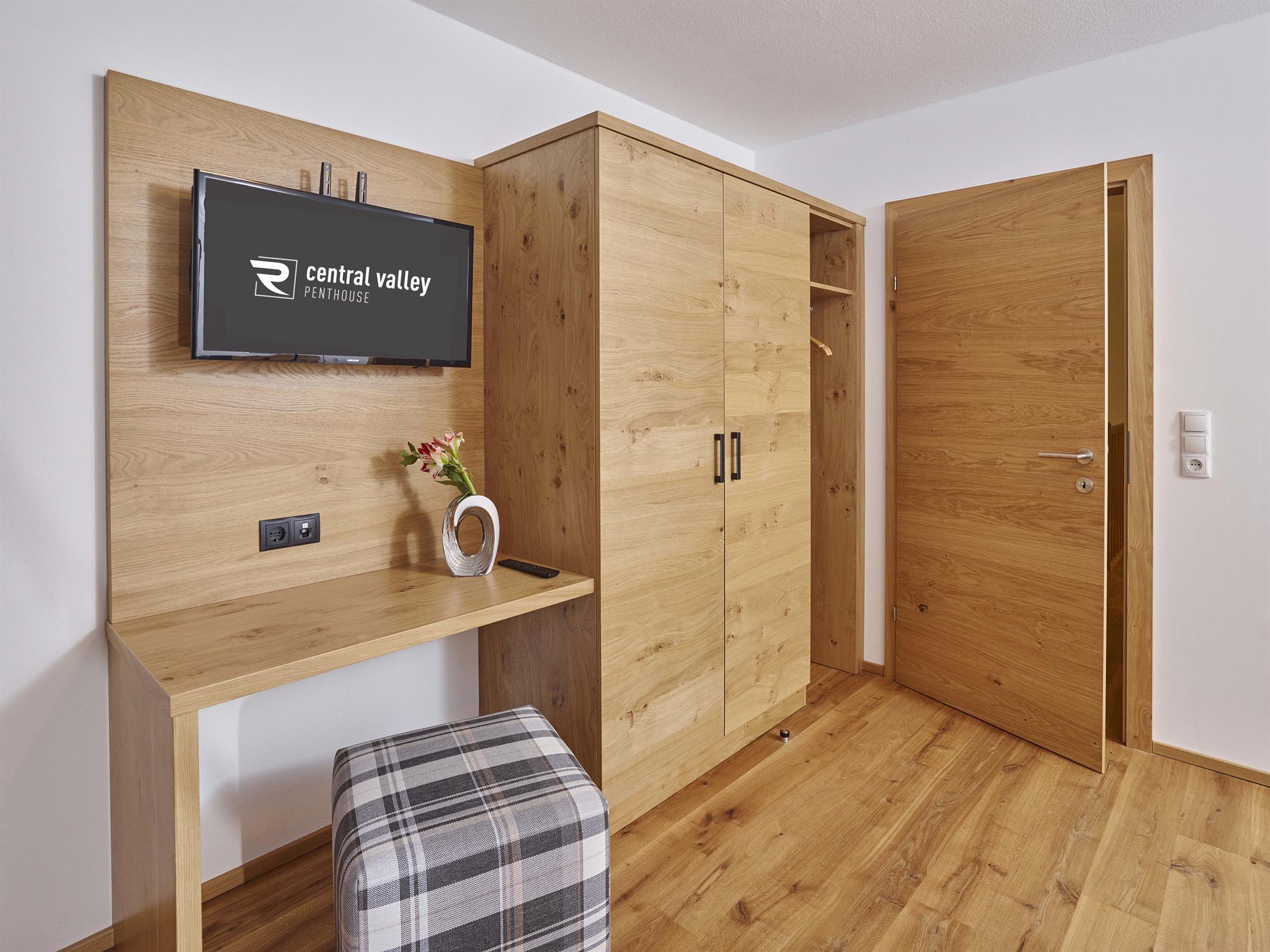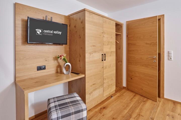 CENTRAL VALLEY PENTHOUSE N°3 mit ca. 128 m² über 2 Etagen: großer Wohnraum mit vollausgestatteter, offener Küche (Geschirrspüler, Backofen, Kaffeemaschine, Wasserkocher, Elektroherd, uvm.) und Essbereich; 1 separates WC, 3 Doppelzimmer; 2 Badezimmer mit Dusche/WC und Pflegeprodukten; TV in den Schlafzimmern und im Wohnbereich; große Terrasse mit ca. 16 m².