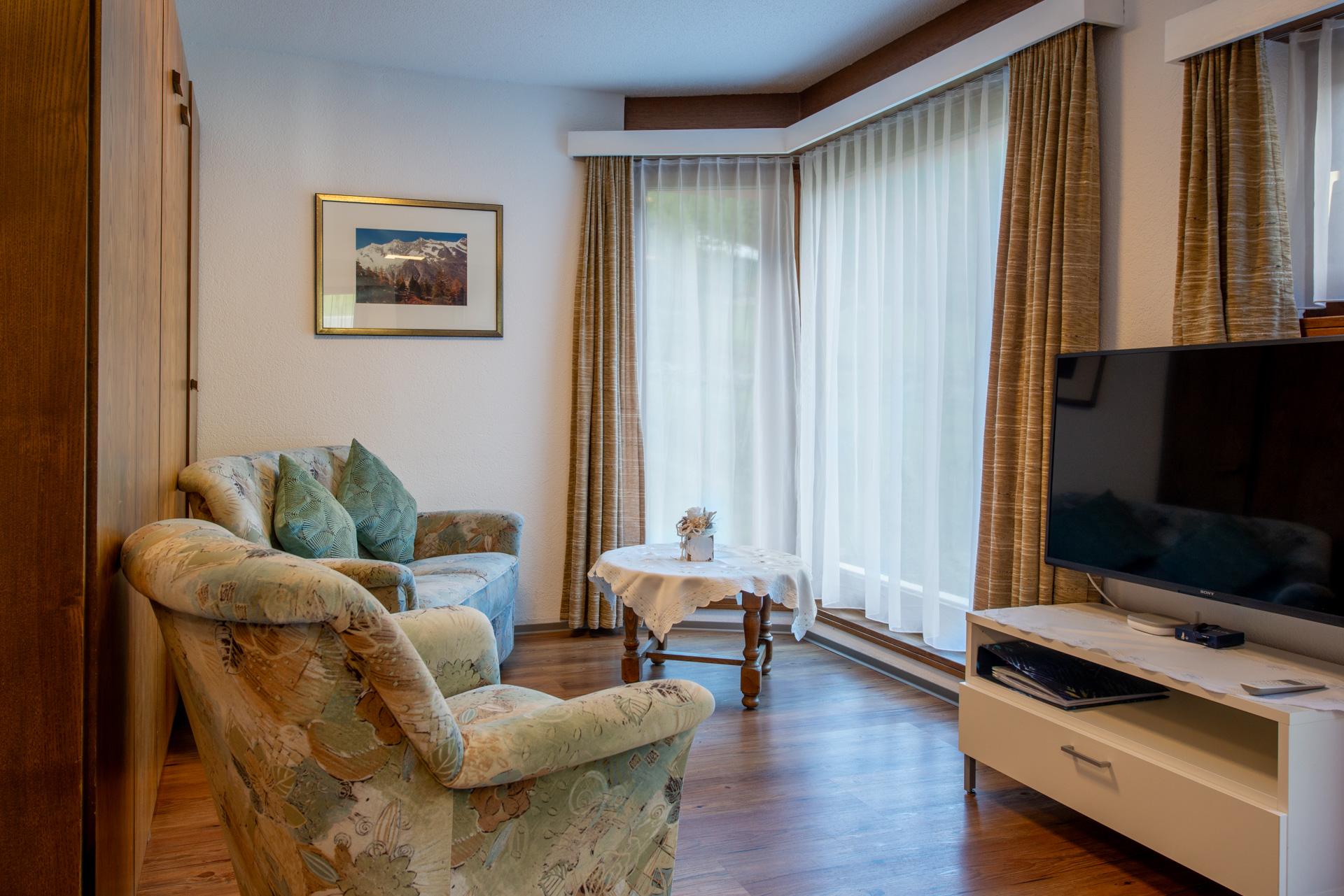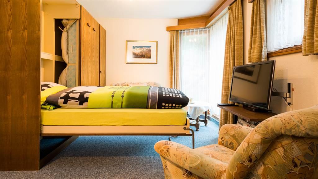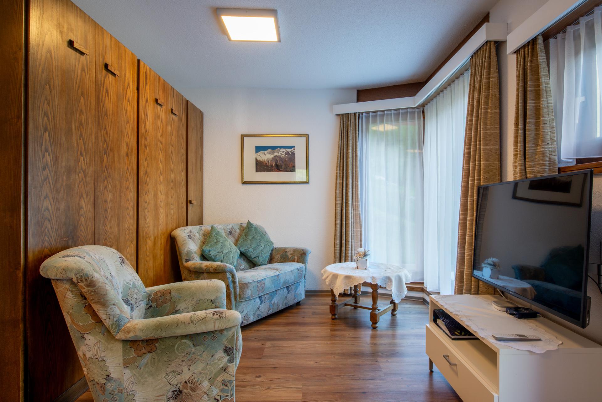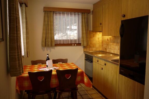 Die Wohnung ist neuwertig und heimelig eingerichtet. Sie verfügt über eine Wohnküche, die mit Backofen, Geschirrspülmaschine, Kühlschrank mit Eisfach, Toaster, Mixer, Kaffeefiltermaschine, Wasserkocher ausgestattet ist. Racletteofen und Fonduegeschirr auf Anfrage. Die Wohnung besteht aus einem separaten Schlafzimmer mit zwei Betten, einem Wohn-/Schlafzimmer mit Flachbildfernseher/Radio und einem Badezimmer mit Dusche/WC. WLAN steht Ihnen in der ganzen Wohnung kostenlos zur Verfügung.