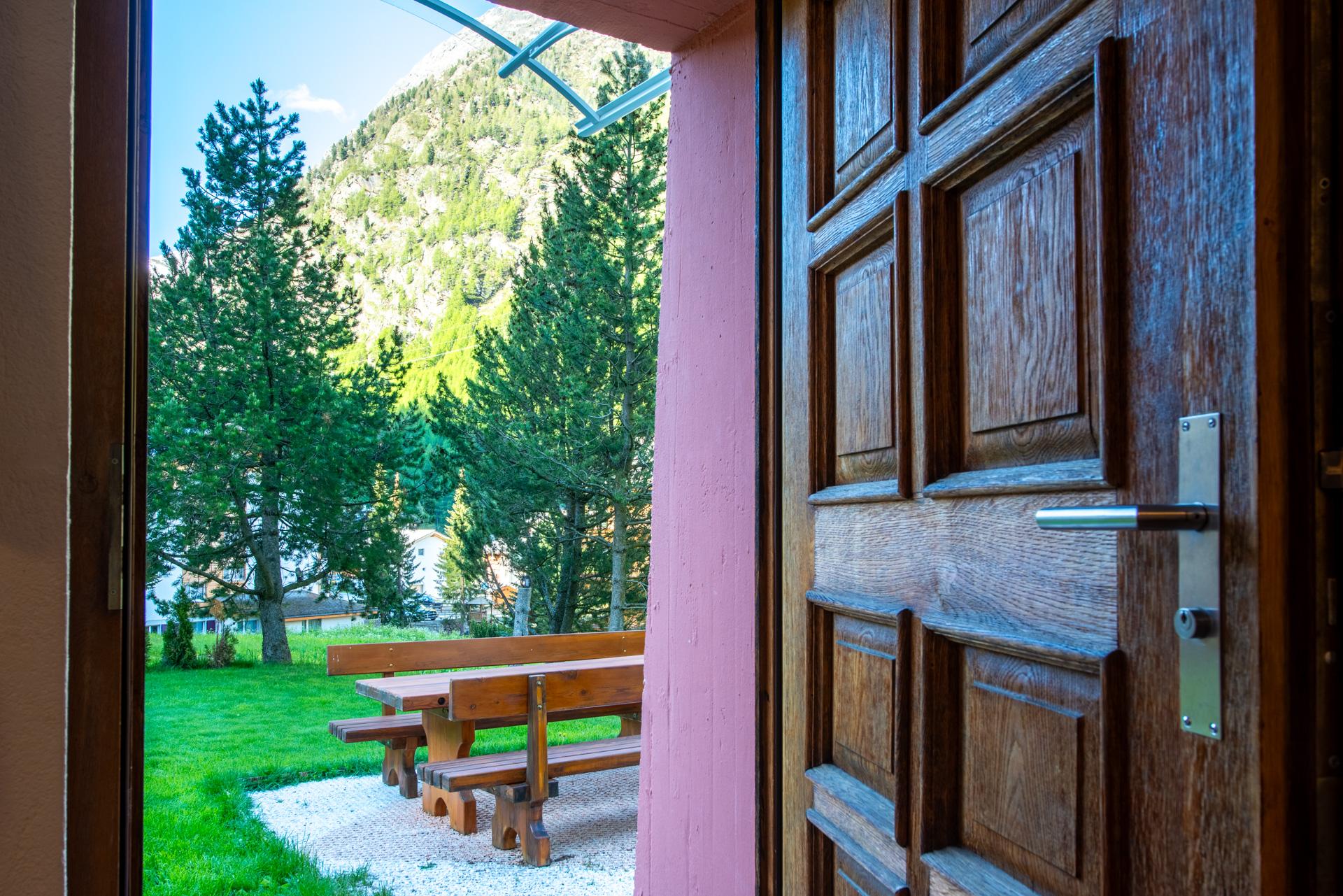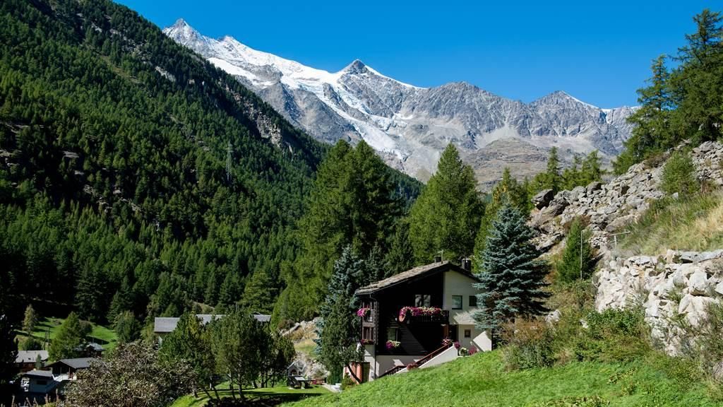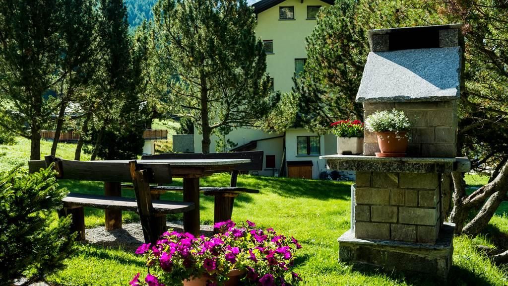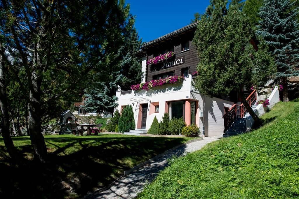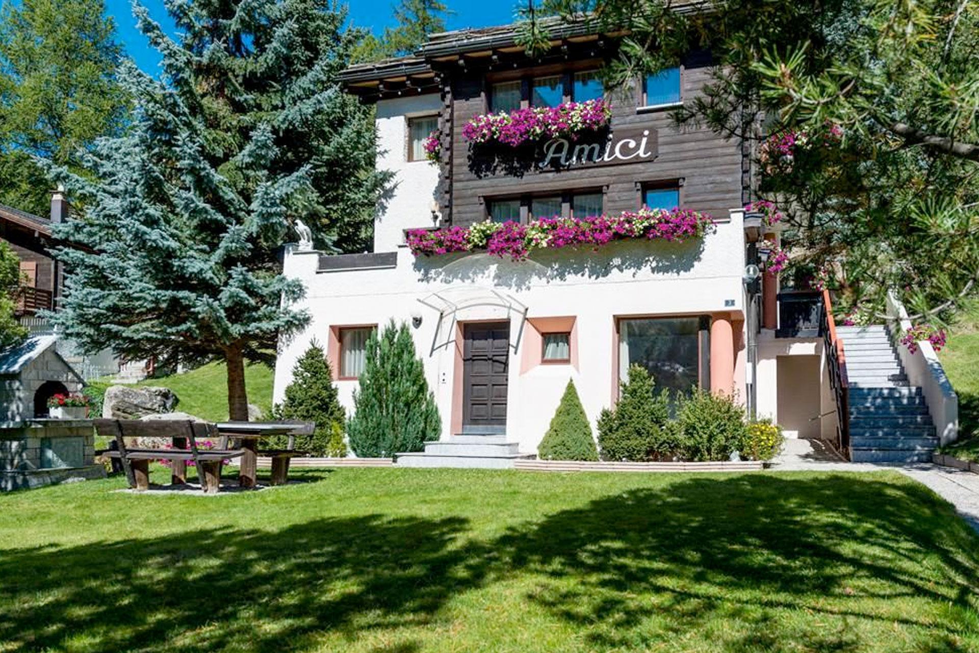 Das Haus Amici befindet sich in sehr sonniger und ruhiger Lage, umgeben von einer herrlichen Liegewiese mit Gartencheminée. Blick auf die Mischabel-Bergkette.