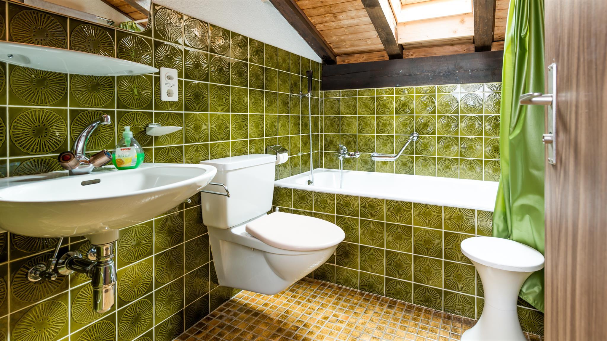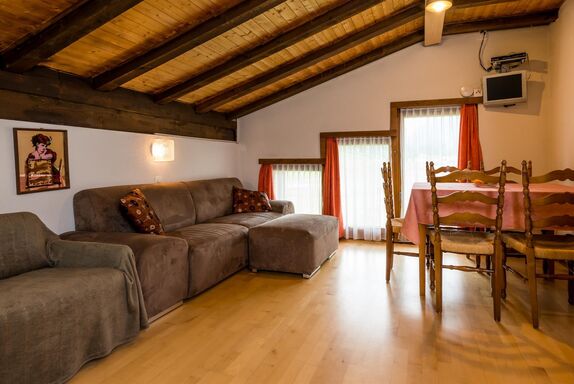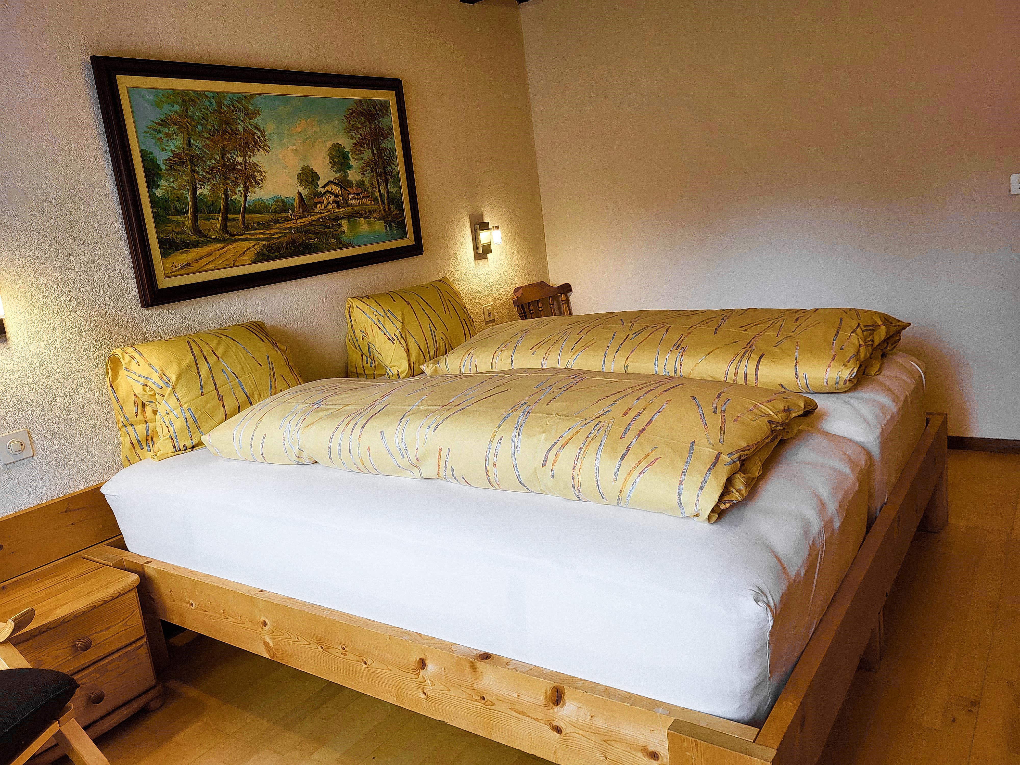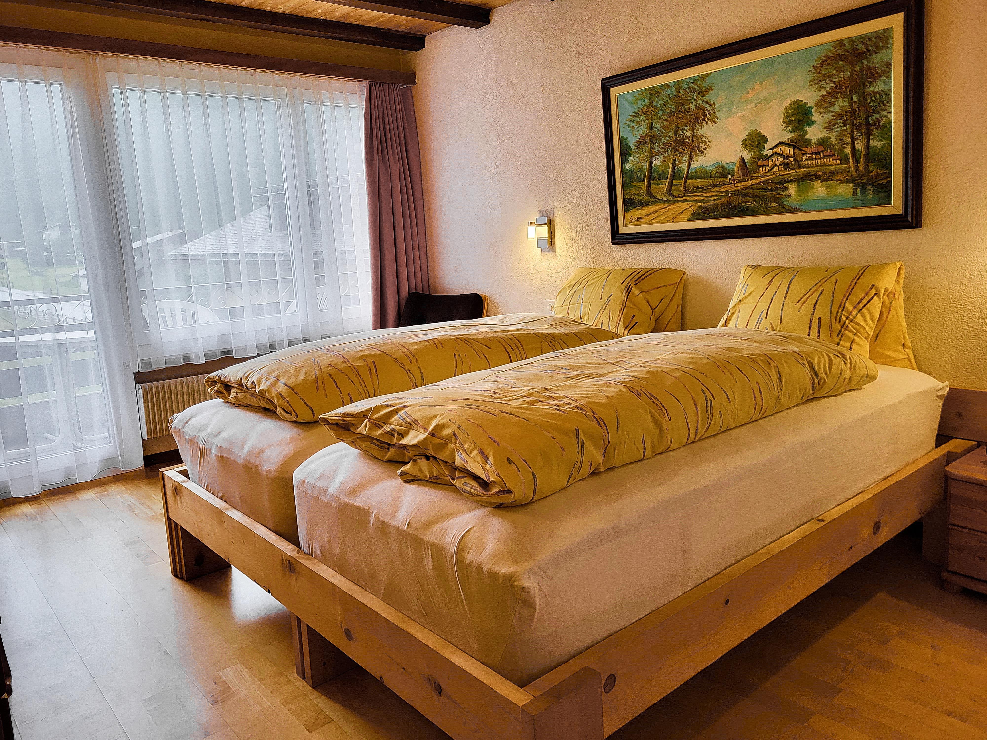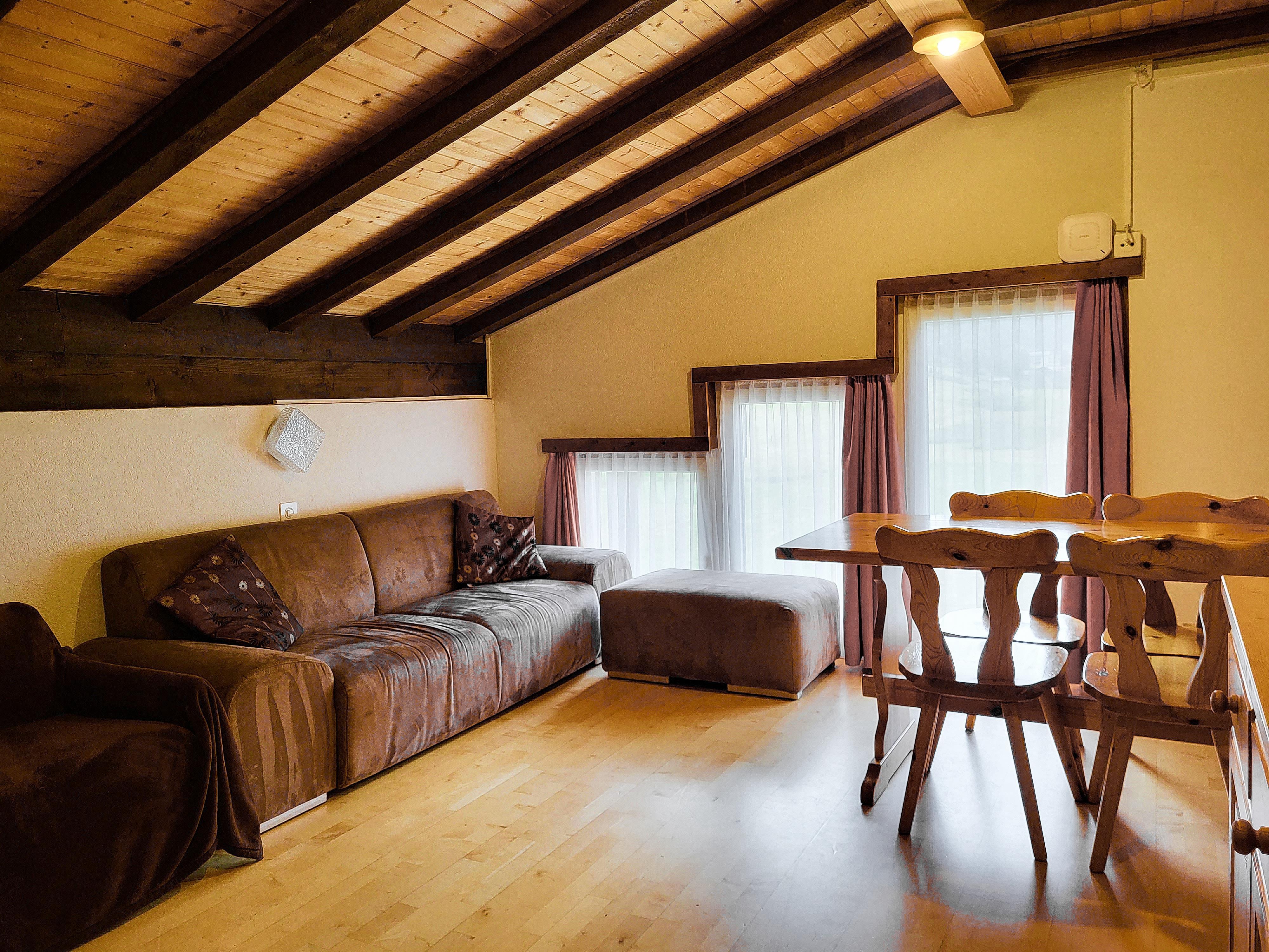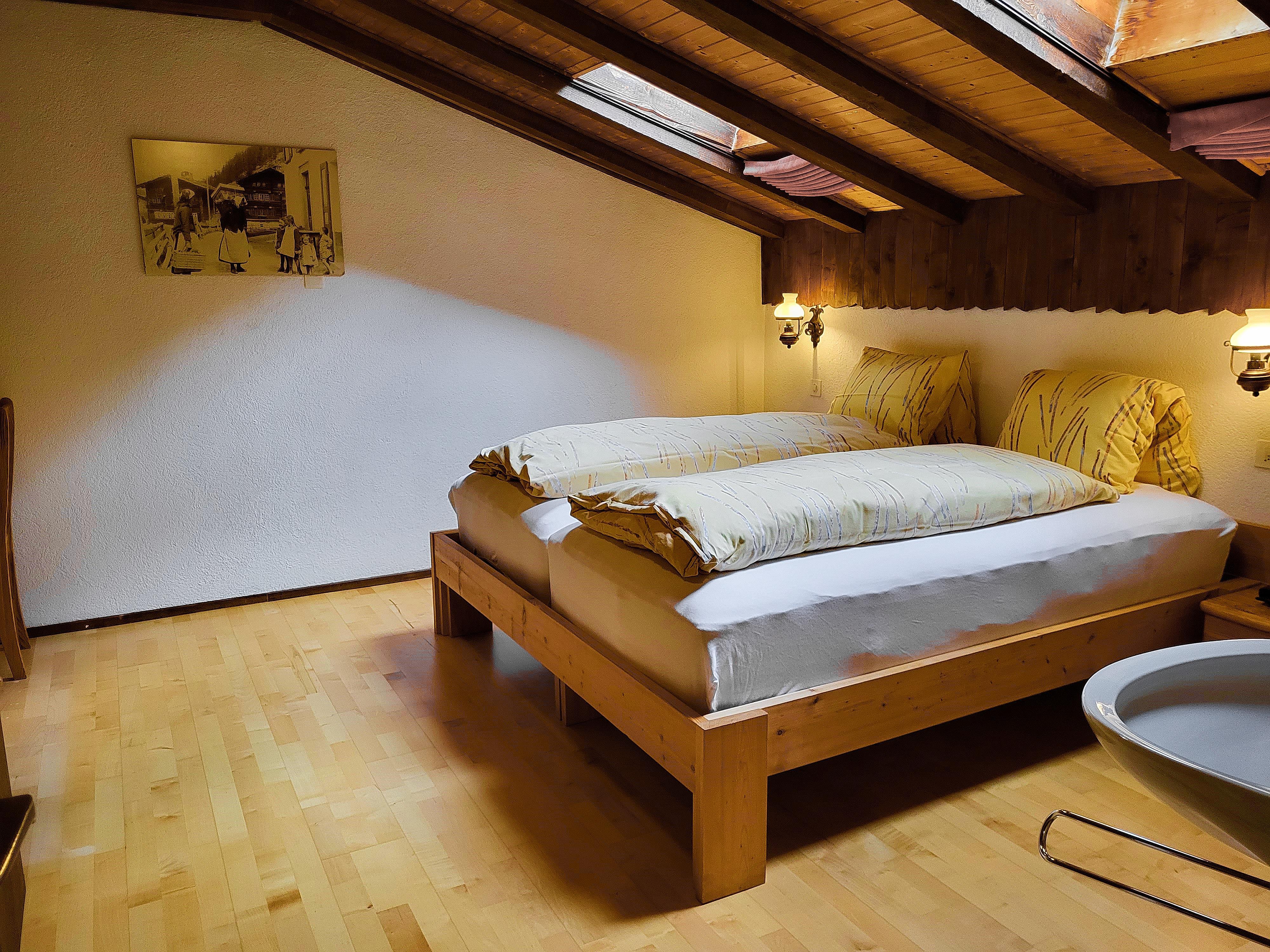 3-Zimmerdachwohnung im 3. Stock für 4 Personen. Die Dachwohnung ist teilrenoviert. Sie verfügt über 1 Doppelzimmer mit Lavabo und Südbalkon und 1 Doppelzimmer mit Zusatzbett und Lavabo, Bad/WC, Wohnraum mit Küchenzeile (Backofen, Elektroherd, Kühlschrank, Wasserkocher) Sat-TV und Wi-Fi-Internetanschluss.