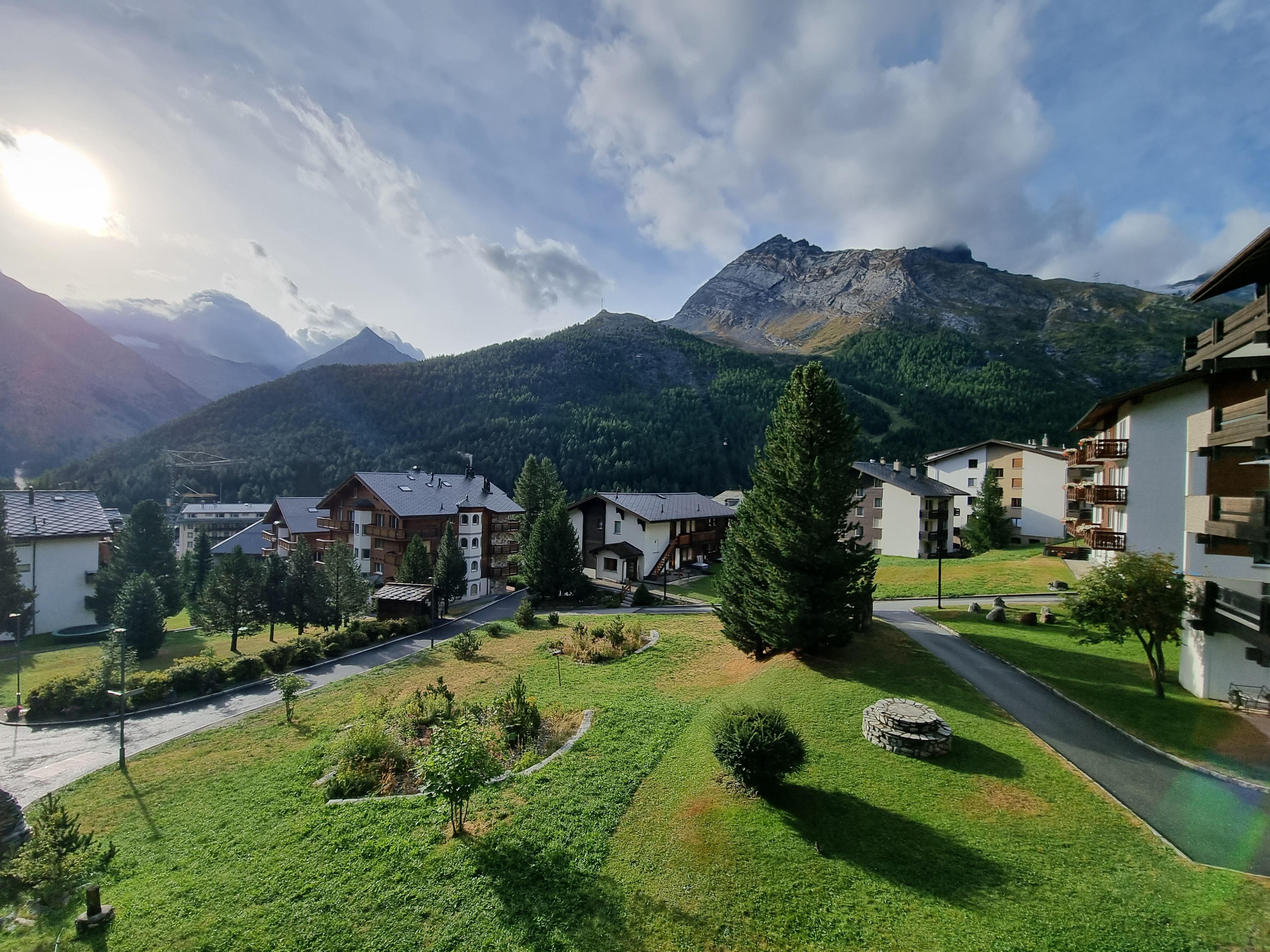 Die Terrasse und der große Balkon bieten einen herrlichen Blick auf den Dom (4545 m), den höchsten 100%igen Schweizer Gipfel der Schweiz, und das Saas-Almageller Tal.