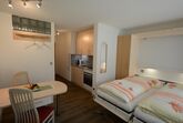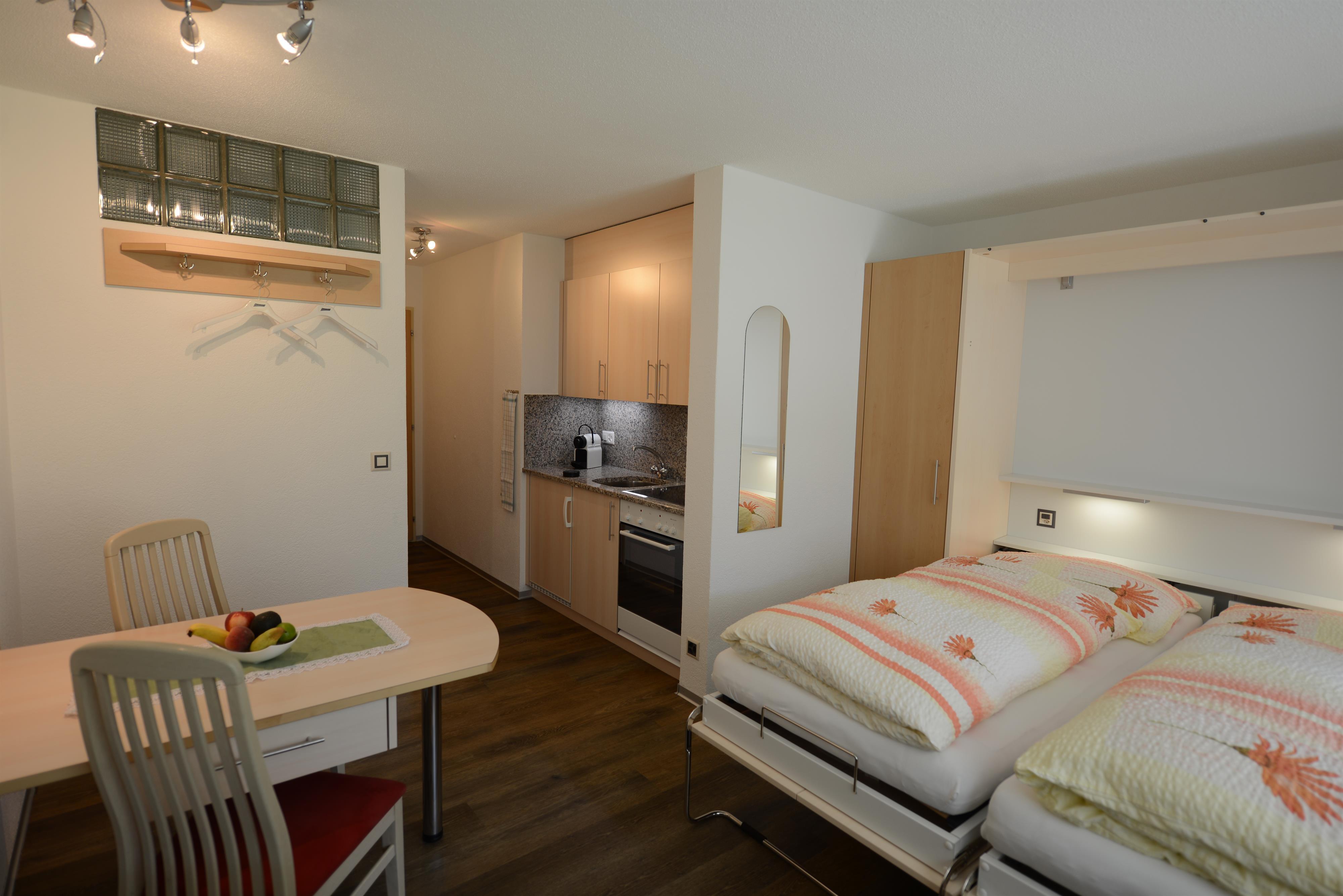 Studio (27 m2), Erdgeschoss, renoviert, Wohnschlafzimmer mit 2 Klappbetten, TV, Radio, Internetanschluss, Dusche/WC, Kochnische, Kühlschrank, Ausgang zur Terrasse.