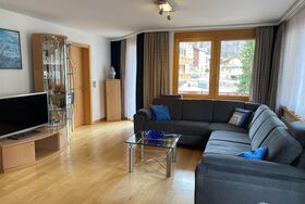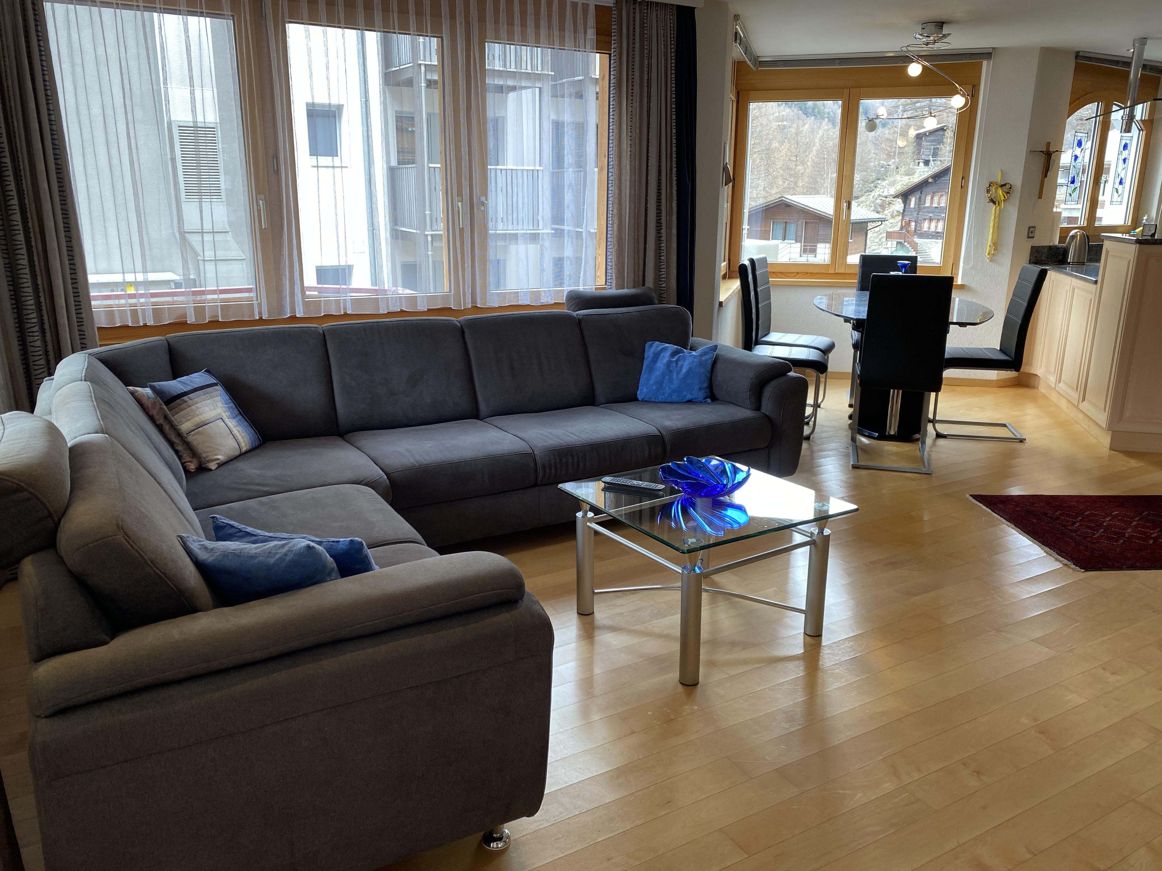 Der Wohn- und Essraum ist ausgestattet mit einer grossen offener Küche, einen Esstisch mit 6 Stühlen, Couche, Salon-Tisch, SAT-Flat-TV, leistungsstarkes W-LAN / Wifi.