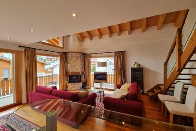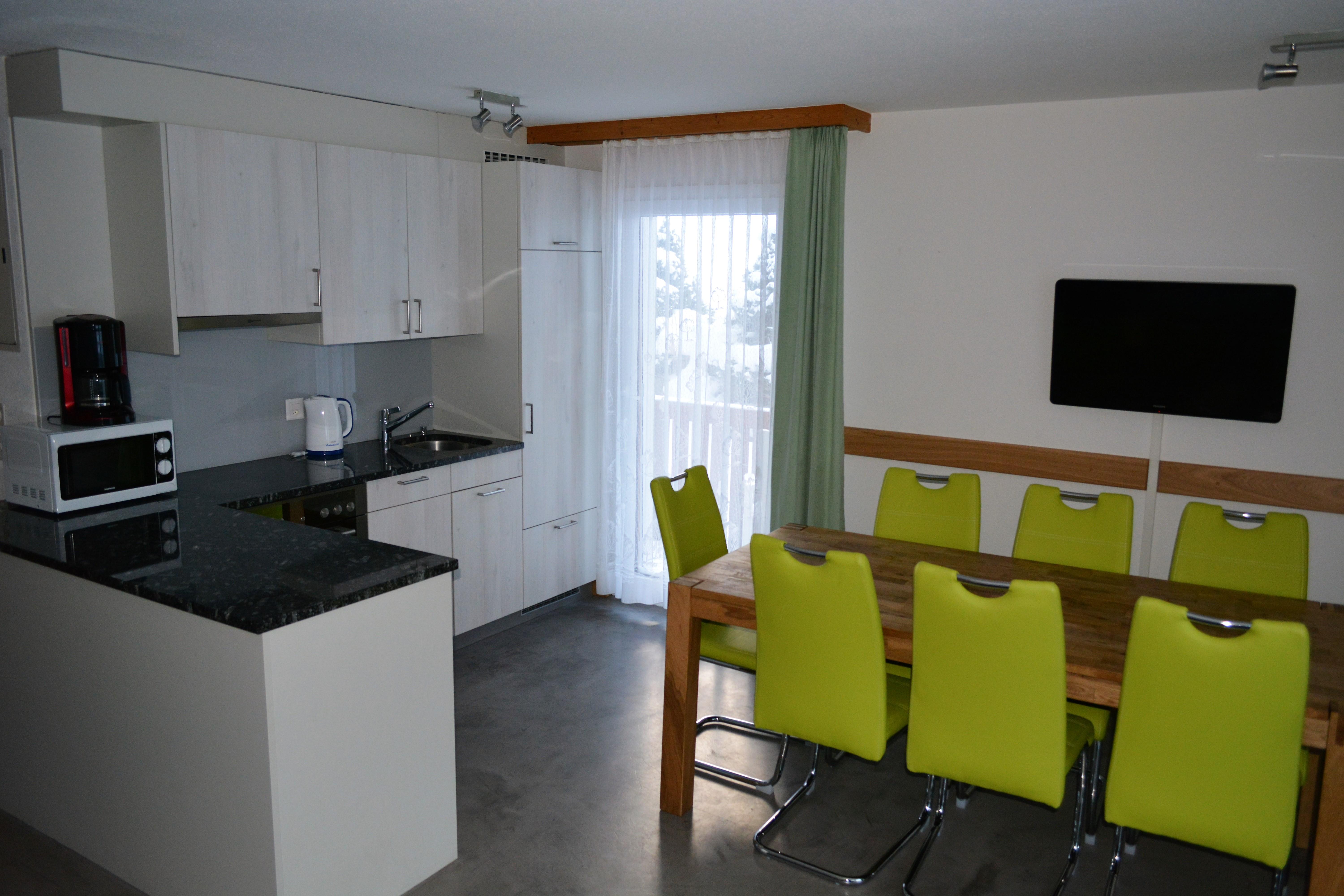 4-Zimmerwohnung neu renoviert Herbst 2011, 1.Stock: 1 Schlafzimmer mit 3 Betten und separater Dusche/WC, 1 Doppelschlafzimmer mit separater Dusche/WC, 1 Doppelzimmer, Bad/WC/Föhn, Esswohnküche mit Kühlschrank, Geschirrspüler, Backofen, Mikrowelle, Toaster, Kaffeemaschine und Wohnzimmer mit Sitzgruppe und TV, Zentralheizung, Südbalkon und Skikeller. Sonnig und ruhig gelegen in unmittelbarer Nähe der Alpin Express Bahn.