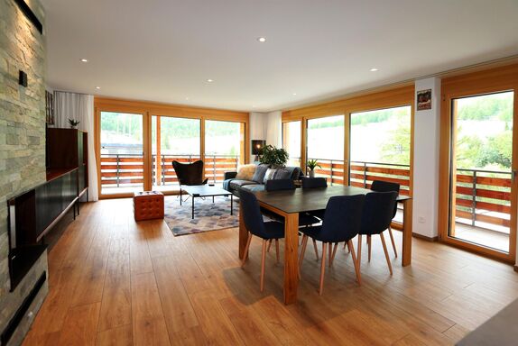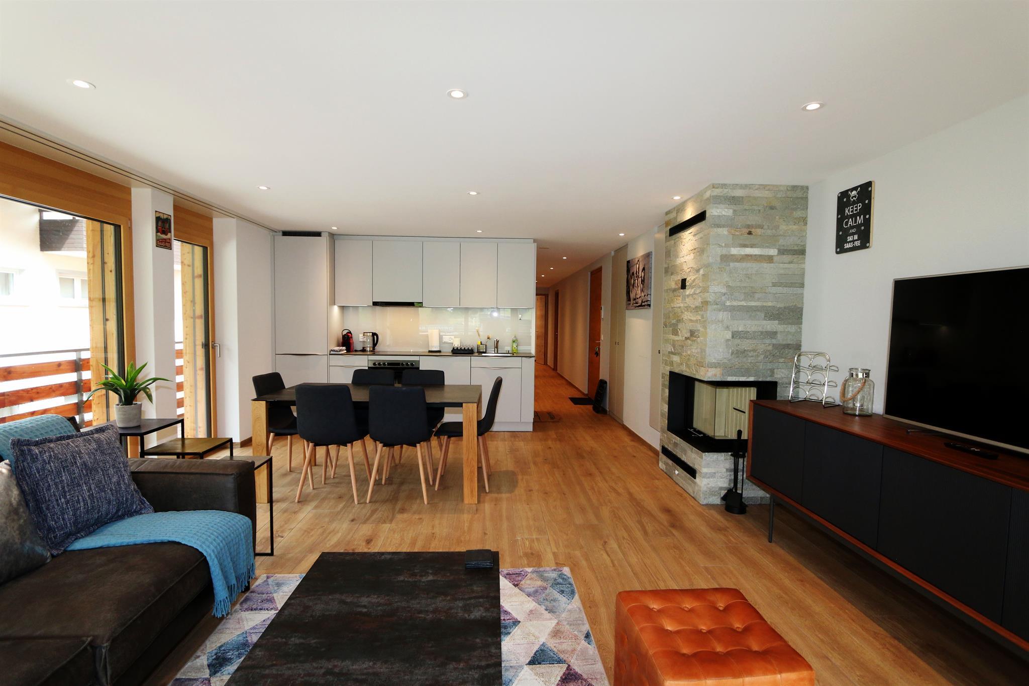 Die Wohnung verfügt über eine offene Küche mit Essbereich, Wohnzimmer mit Kamin und Flachbildfernseher. Die Küche ist komplett ausgestattet mit Geschirrspüler, Backofen, Herd, Kaffeemaschine, Toaster, Wasserkocher, Käsefondue-Set und Raclette-Ofen. Von der Wohnung hat man einen herrlichem Panoramablick auf die Berge. Es hat einen grossen privaten Balkon. Die Wohnung verfügt über drahtloser Internetzugang.