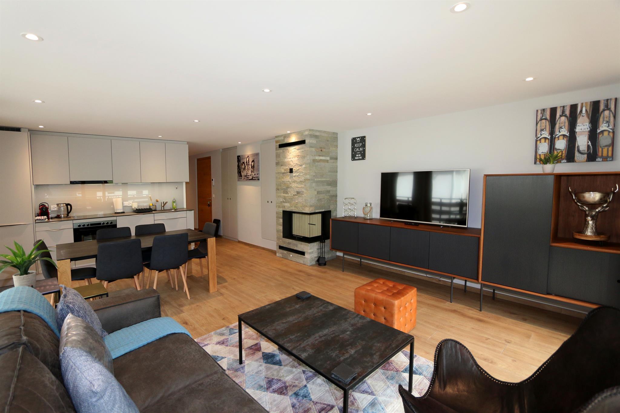 Die Wohnung verfügt über eine offene Küche mit Essbereich, Wohnzimmer mit Kamin (kein Holzservice) und Flatscreen-TV. Die Küche ist komplett ausgestattet mit Geschirrspüler, Kombi-Mikrowelle, Backofen, Bora-Induktionsherd, Kaffeemaschine, Toaster, Wasserkocher, Käsefondue-Set und Racletteofen. Panoramablick vom privaten Balkon und WLAN steht zur Verfügung.