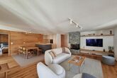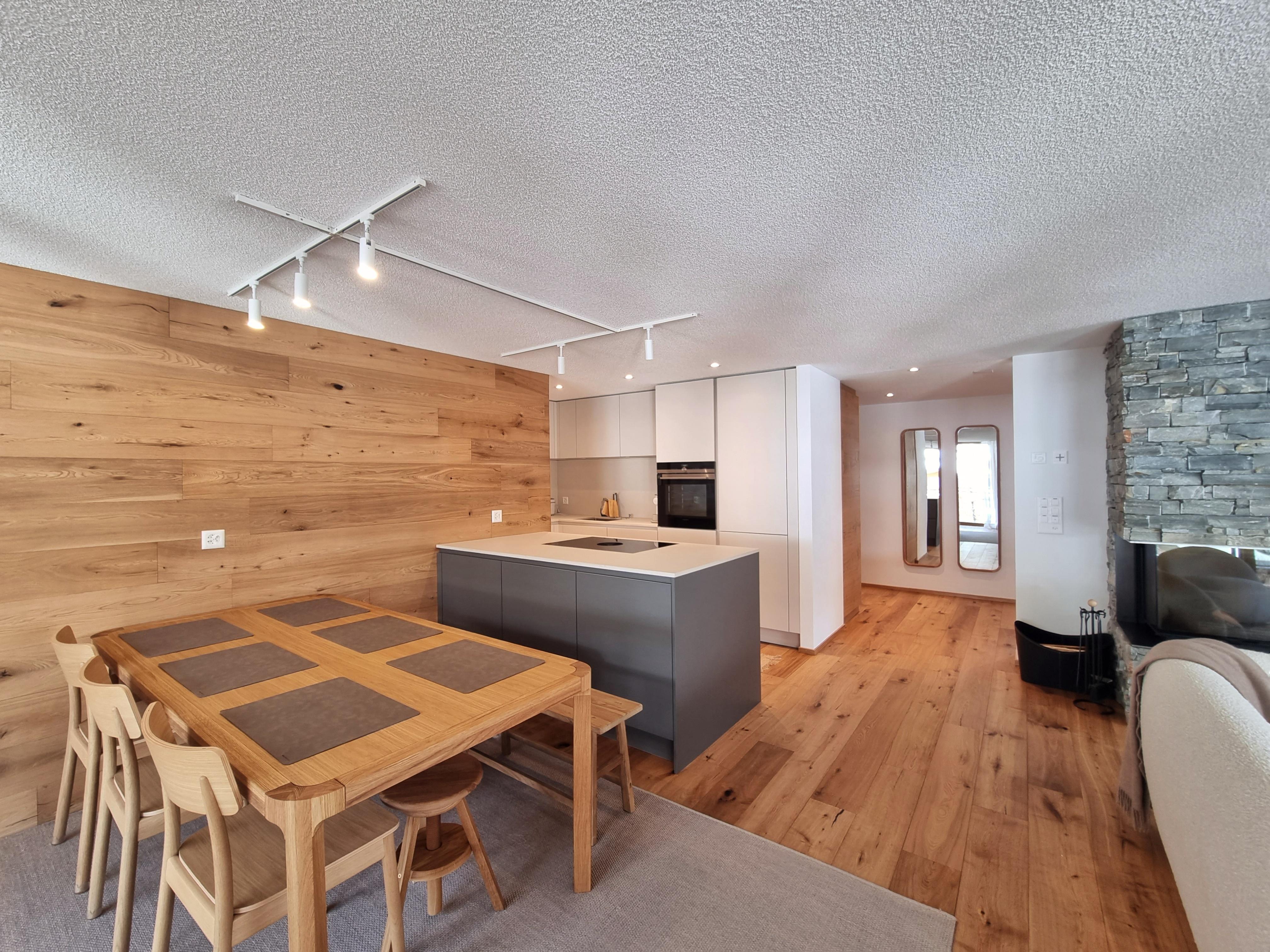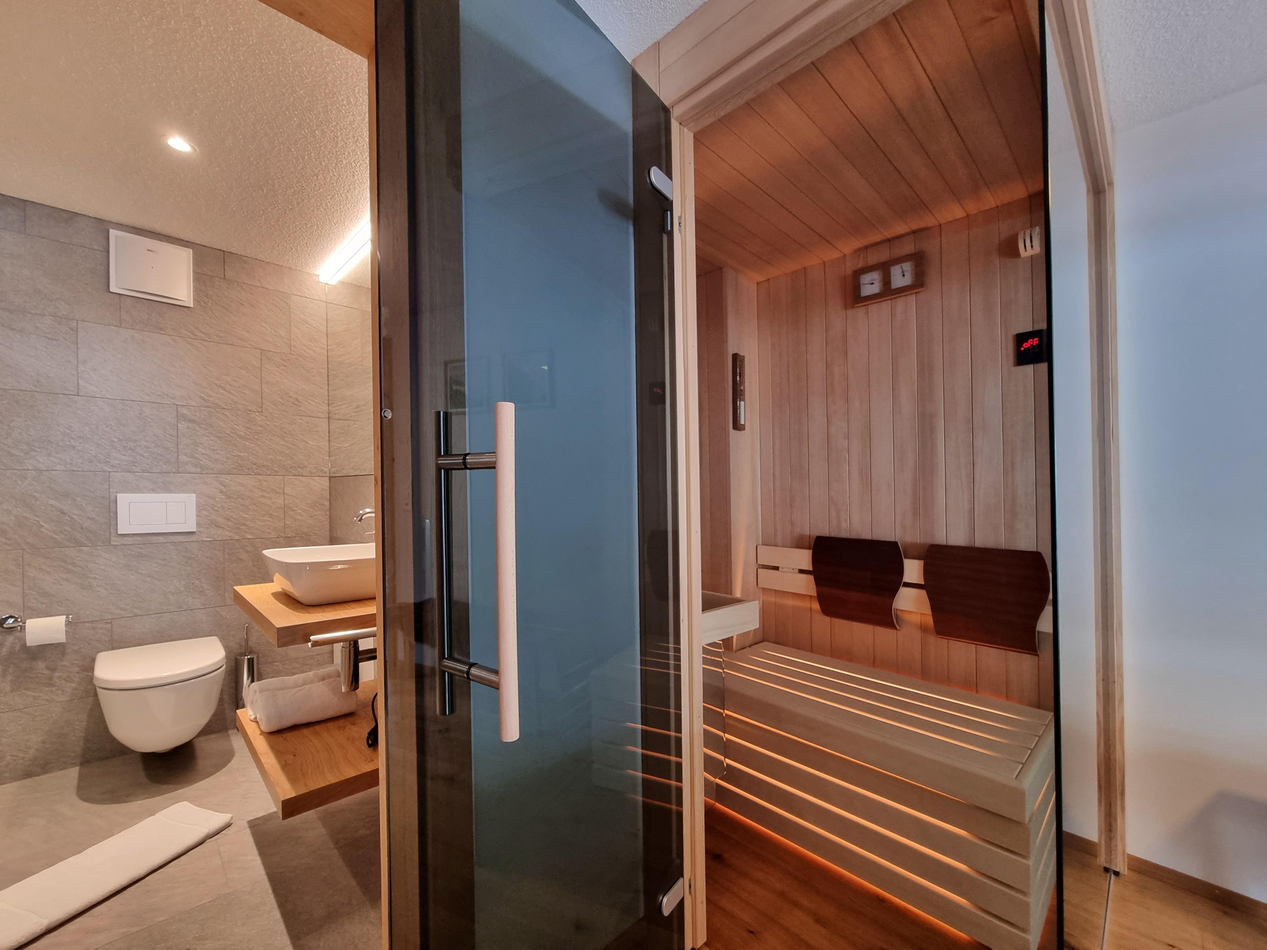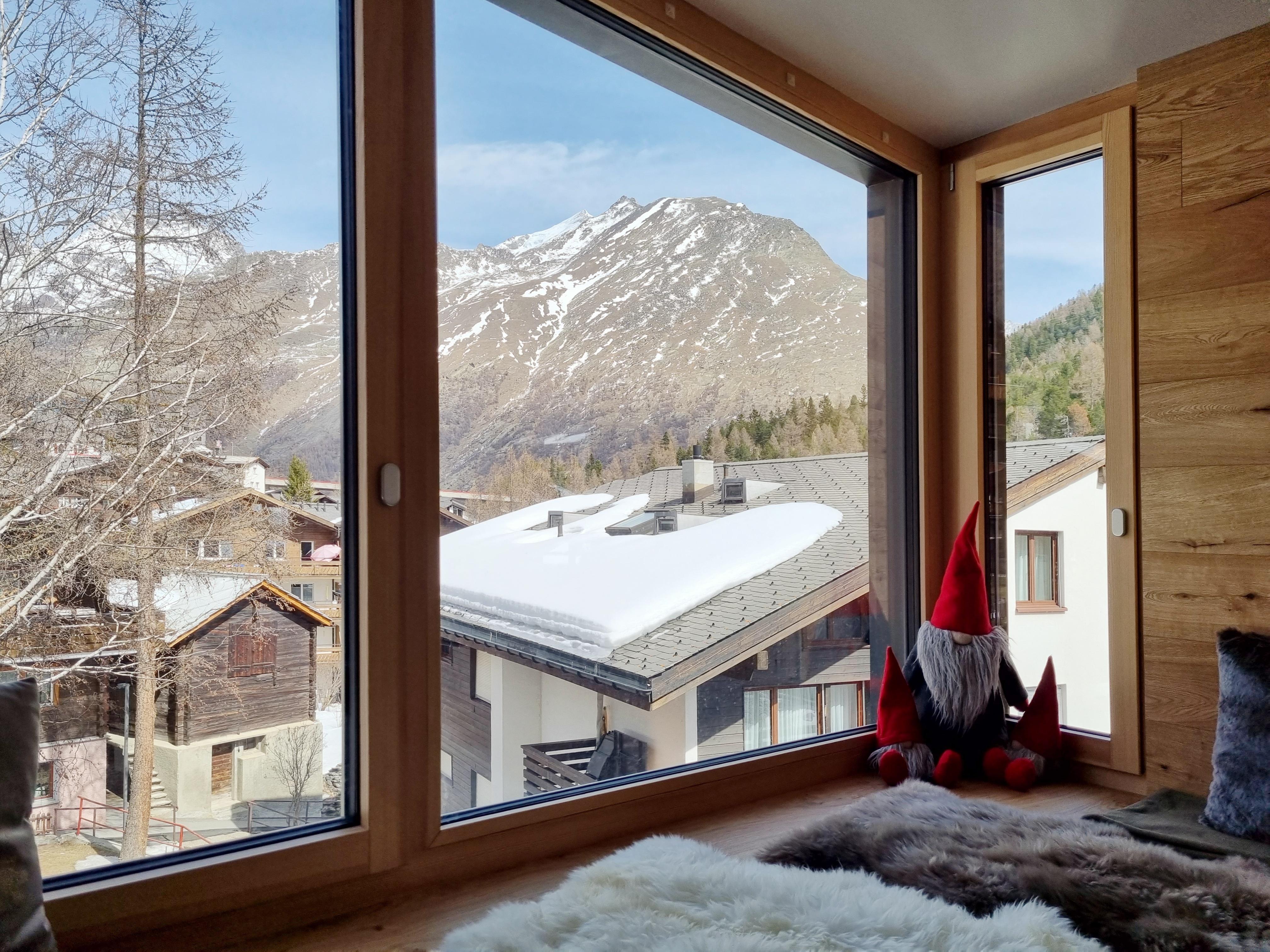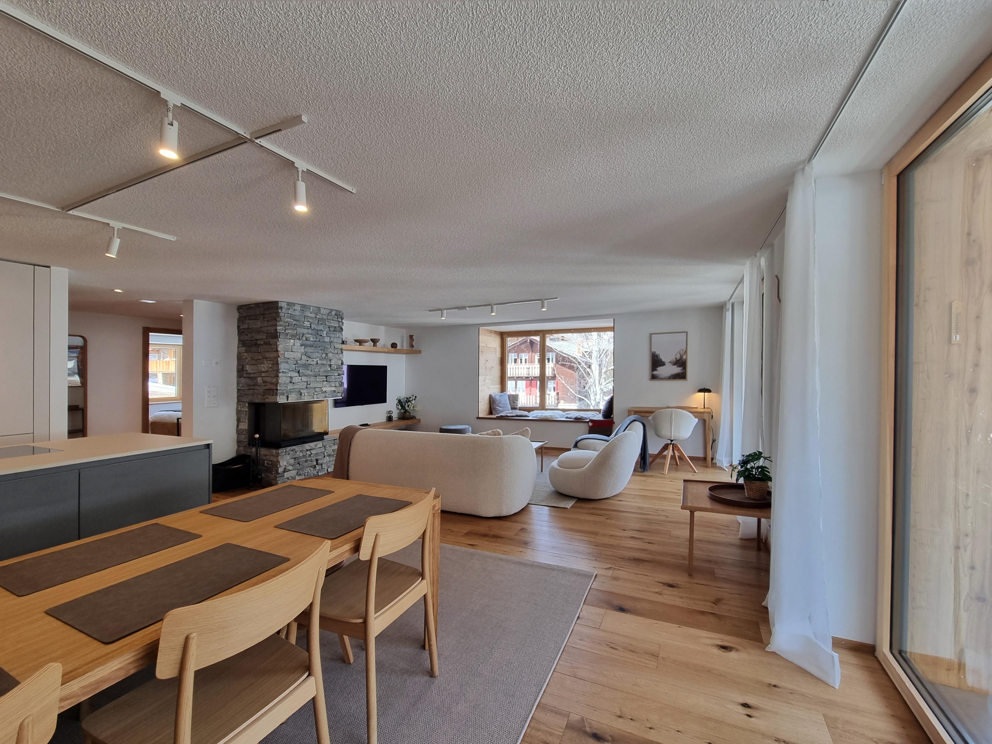 Die Wohnung befindet sich im 2.OG und hat 3 Schlafzimmer und 2 Badezimmer. 2 Schlafzimmer haben je ein Doppelbett und das 3. Schlafzimmer verfügt über 2 Kajütenbetten. Somit bietet die Wohnung Platz für 8 Personen, ideal für Familien mit Kindern. 1 Schlafzimmer verfügt über ein en-Suite Badezimmer mit Dusche/WC/Waschbecken. Auch hat es eine kleine Sauna in diesem Zimmer. Die anderen 2 Schlafzimmer teilen sich 1 Badezimmer mit Badewanne/WC/Waschbecken. Das Wohnzimmer ist im wunderschönen, luxuriösen Chalet-Chic style eingerichtet mit viel Holz. Der Kamin rundet diese Chalet Atmosphäre genauso perfekt ab, wie die Leseecke an den grossen Fenstern. Im Wohnzimmer befindet sich auch die offene, top moderne Küche. In der Wohnung befindet sich auch ein praktischer Waschturm.