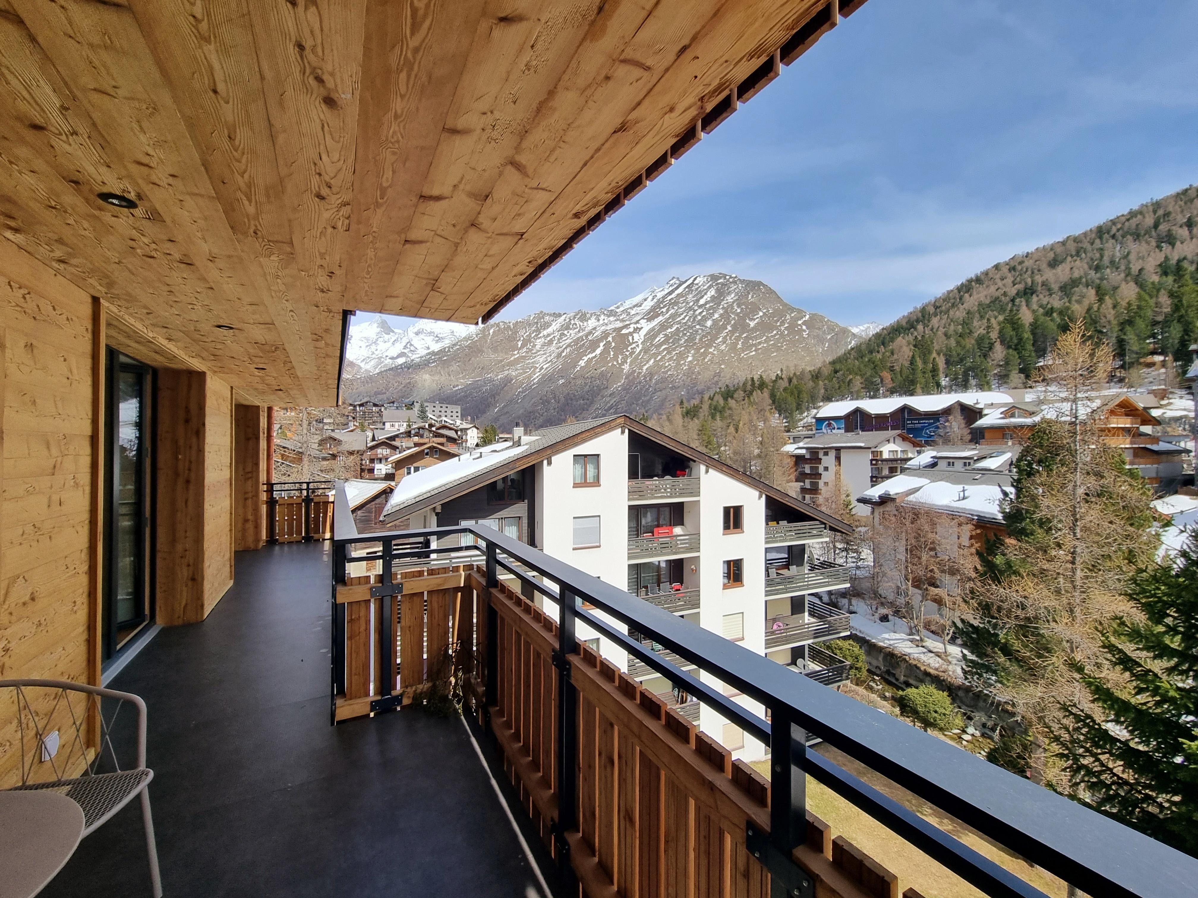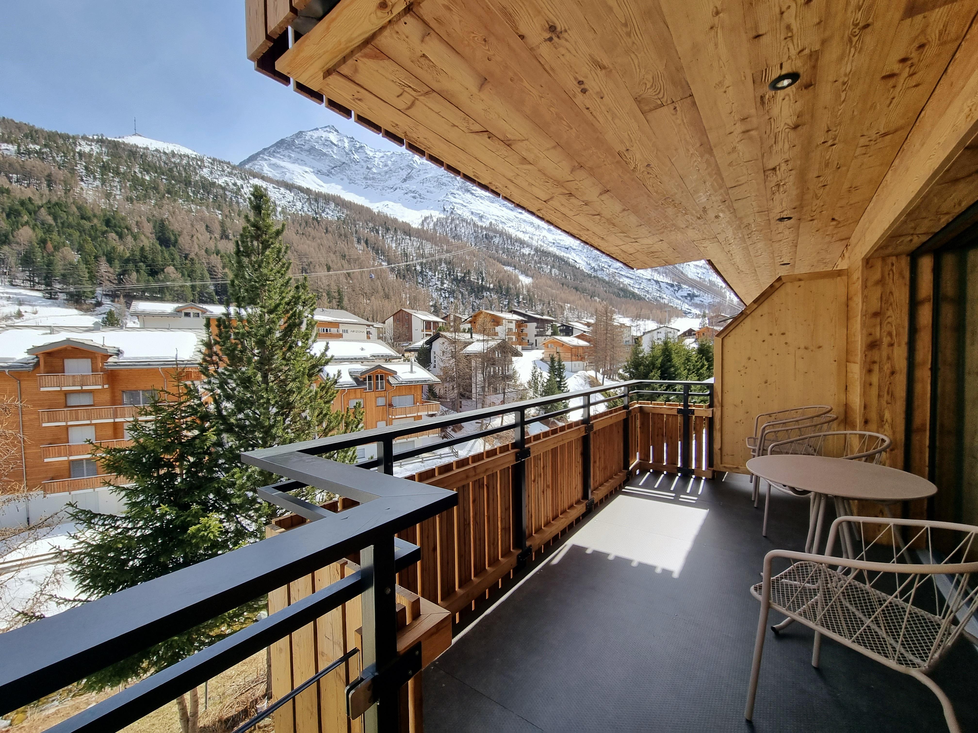Vom Wohnzimmer und auch Master Schlafzimmer hat man einen Ausgang zum östlich ausgerichteten Balkon. Zum Apartment gehört ein privater Skischrank