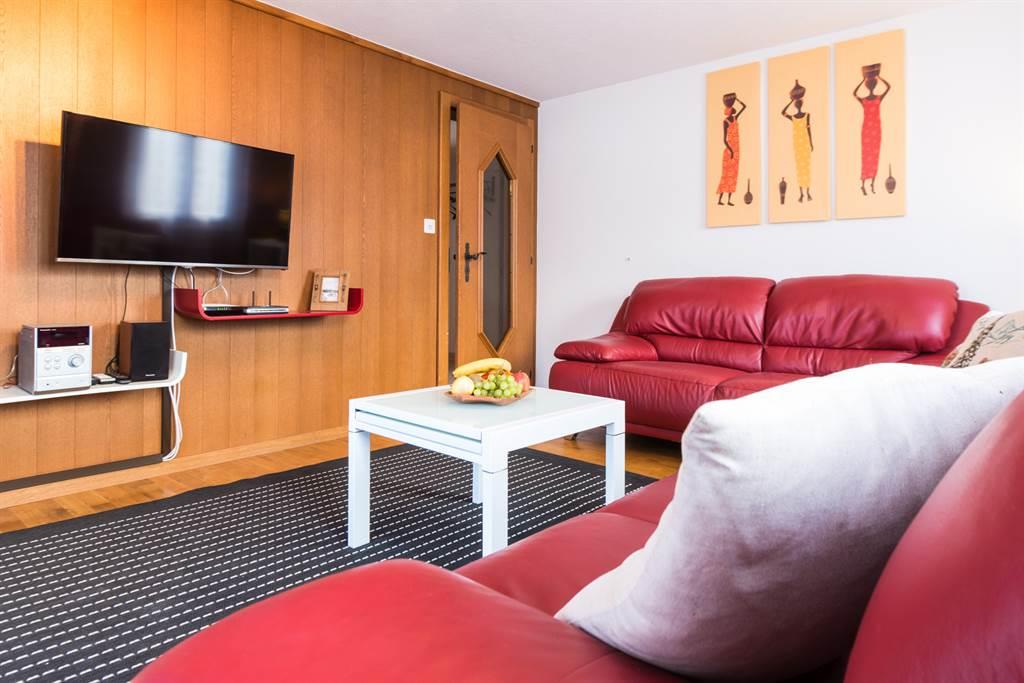 4 1/2-Zimmerwohnung (90 m2), 2.Stock, Wohn/Essküche mit Kühlschrank, Wohnzimmer, TV, 3 Doppelschlafzimmer, Bad/WC, Oelzentralheizung mit Ost- und Süd-Balkon.