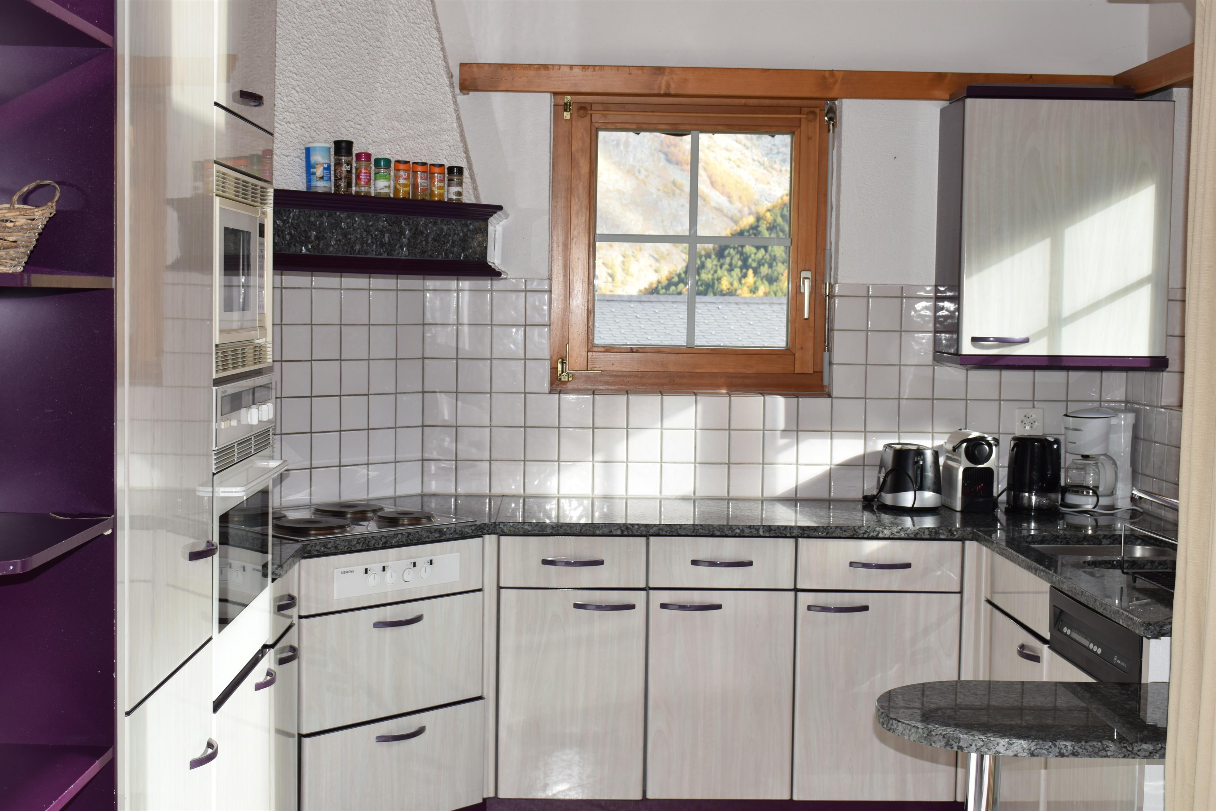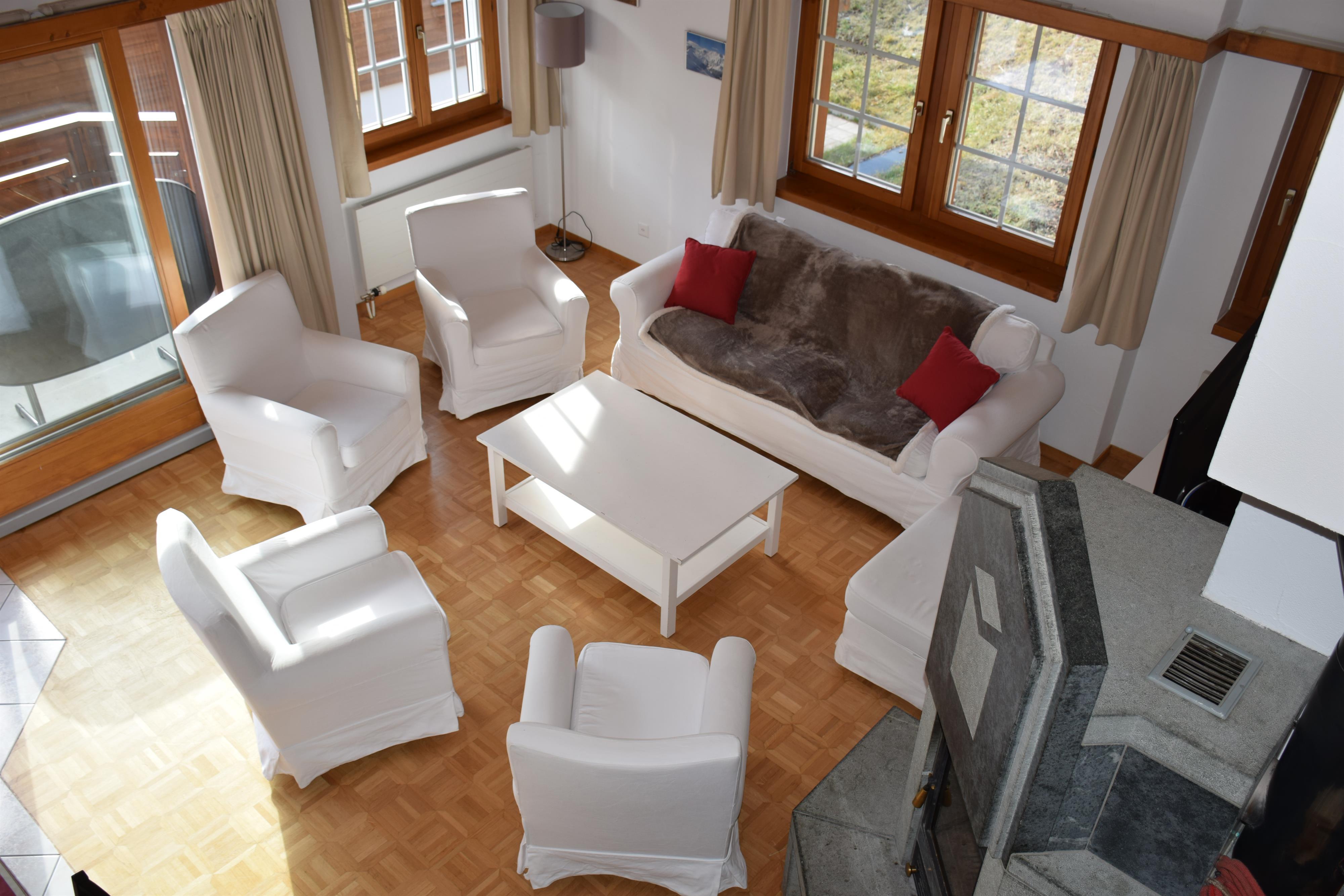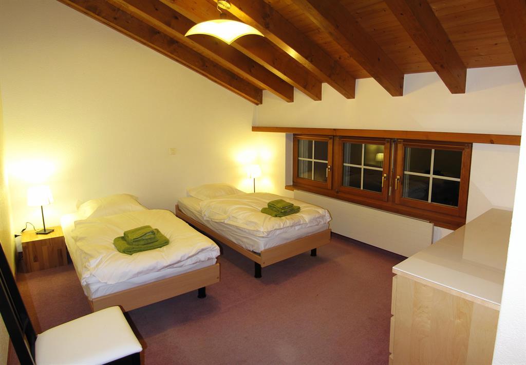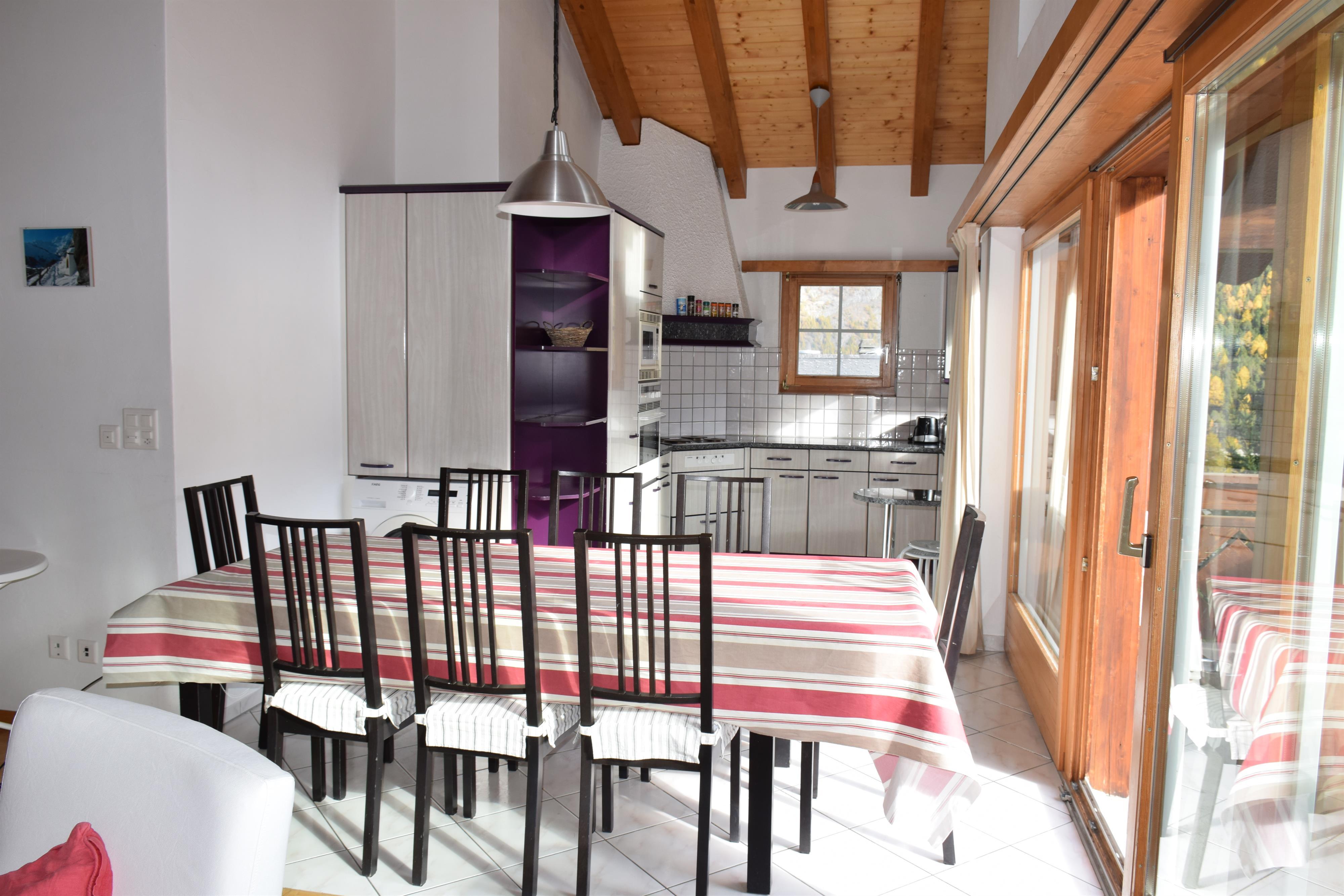 Diese Maisonette-Wohnung verfügt über drei Schlafzimmer (zwei Doppel- und ein Dreibettzimmer), ein Einzelbett auf der Mansarde, Dusche-WC, Bad-WC, ein großes Wohnzimmer mit Kamin und einen Balkon mit herrlichem Panoramablick. Die offene Küche ist komplett ausgestattet und verfügt über einen Esstisch sowie einen direkten Zugang zum Balkon. Gratis Wifi.