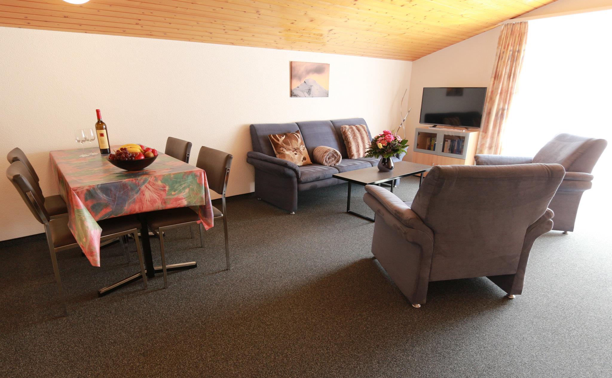 Neu renovierte 2-Zimmerwohnung (60 m2), 4. Stock, 1 Doppelschlafzimmer, sehr geräumiges Wohnzimmer mit Doppelschrankbett sehr bequem, Polstergruppe, Essecke, grosser Flachbild Satelliten-TV, DAB-Radiowecker mit Bluetooth, Gratis WLAN. modernes Badezimmer mit Bad/Dusche/WC und Haartrockner. Neue offene Küche mit Geschirrspüler, Umluftofen, Keramik Kochherd, Mikrowelle, Kühlschrank mit Gefrierfach, Kaffee-Filtermaschine, Wasserkocher, Handmixer, Toaster usw. Möblierter Süd-Balkon mit wunderschöner Aussicht auf den Bergen und dem Gletscherwelt von Saas-Fee.