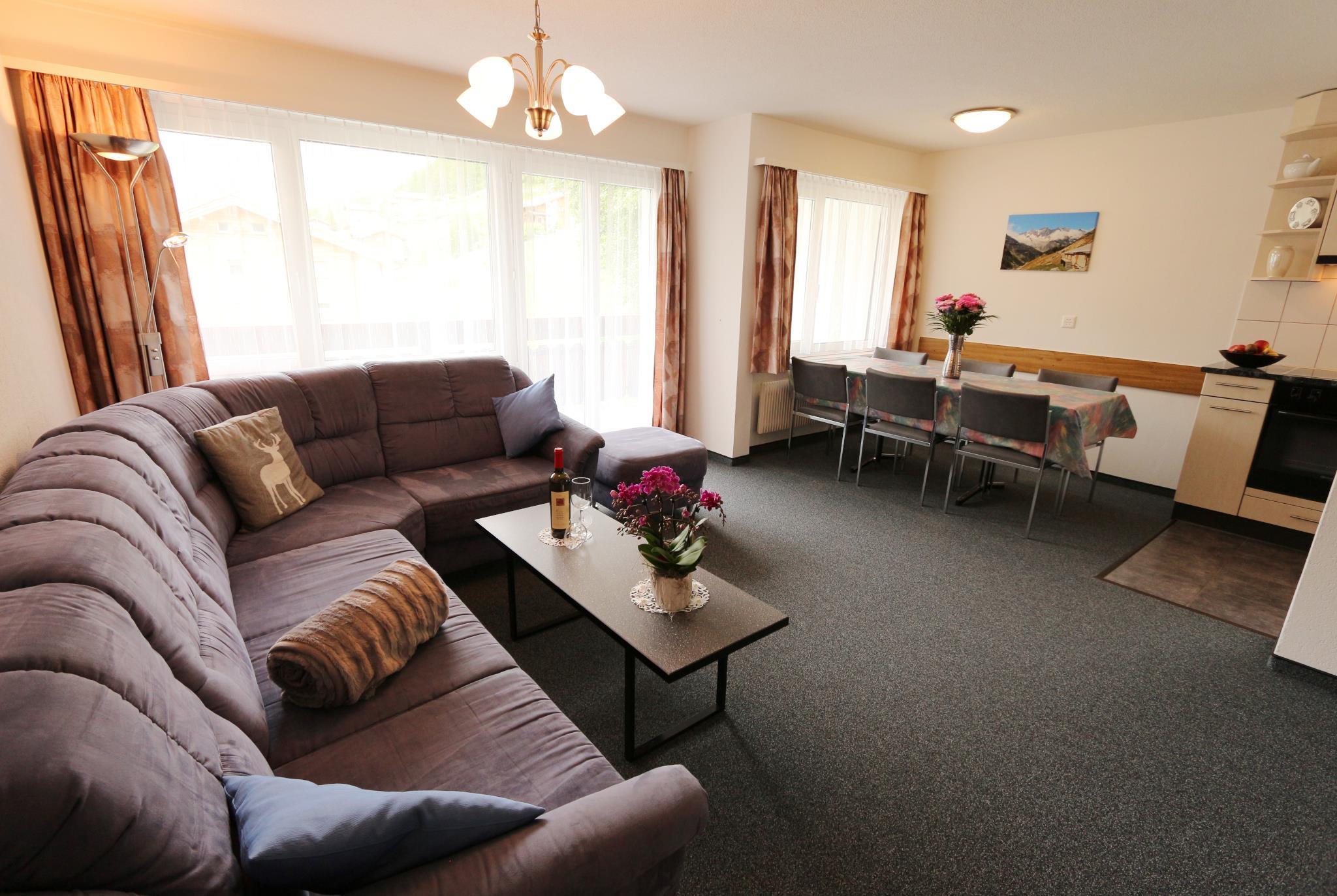 Sehr geräumige und neu renovierten 4-Zimmerwohnung (85 m2), 2. Stock, 3. Doppelschlafzimmer, 2 Schlafzimmer mit Waschbecken, grosses Wohnzimmer, Polstergruppe, Essecke, grosser Flachbild Satelliten-TV, DAB-Radiowecker mit Bluetooth, Gratis WLAN. modernes Badezimmer mit Bad/Dusche/WC und Haartrockner. Offene moderne Küche mit Geschirrspüler, Umluftofen, Keramik Kochherd, Mikrowelle, Kühlschrank mit Gefrierfach, Kaffee-Filtermaschine, Wasserkocher, Handmixer, Toaster usw. Grosser möblierter Süd- Balkon mit freier Aussicht auf die Bergwelt und Gletscher.