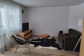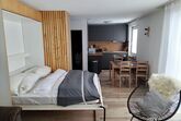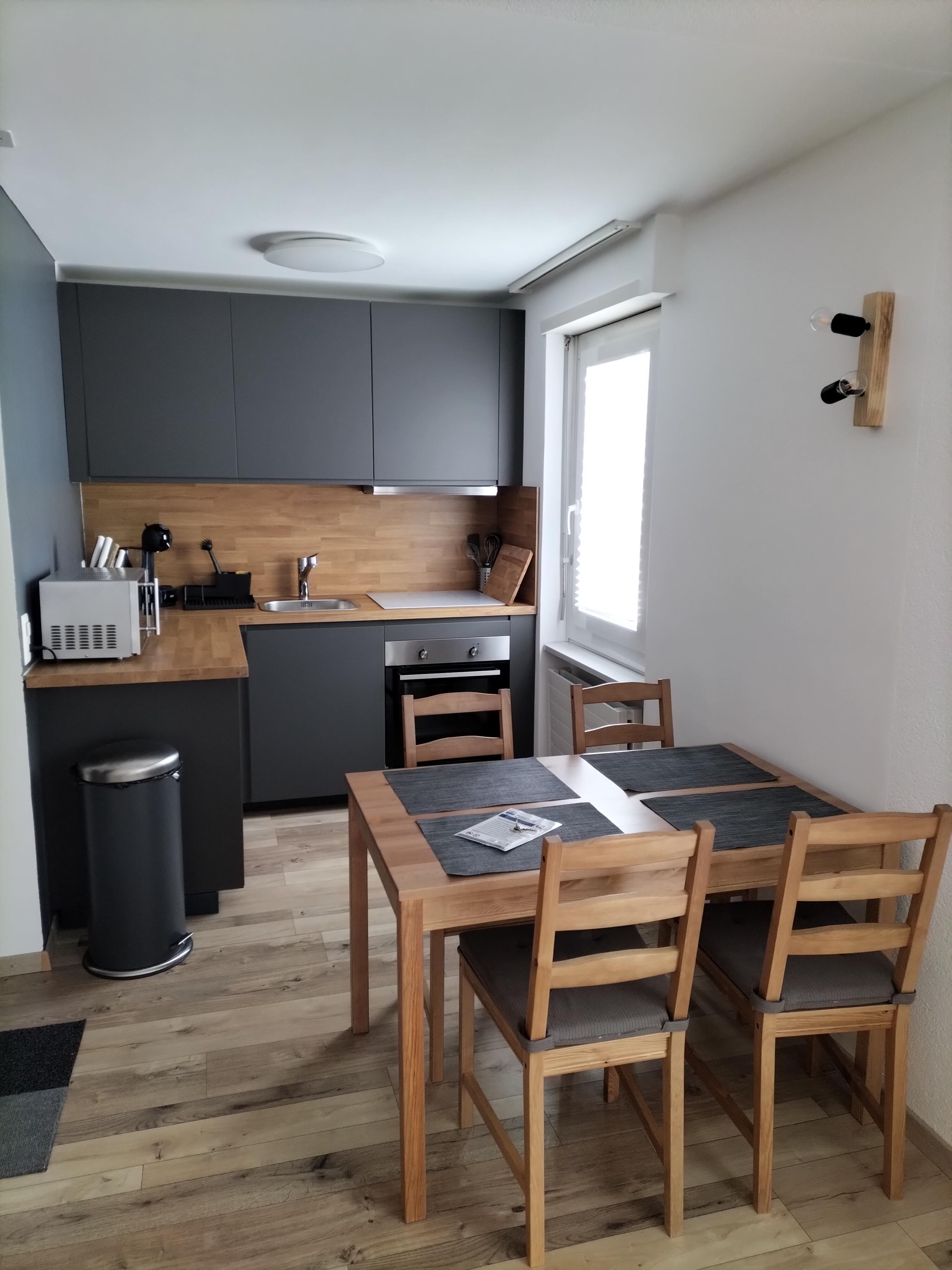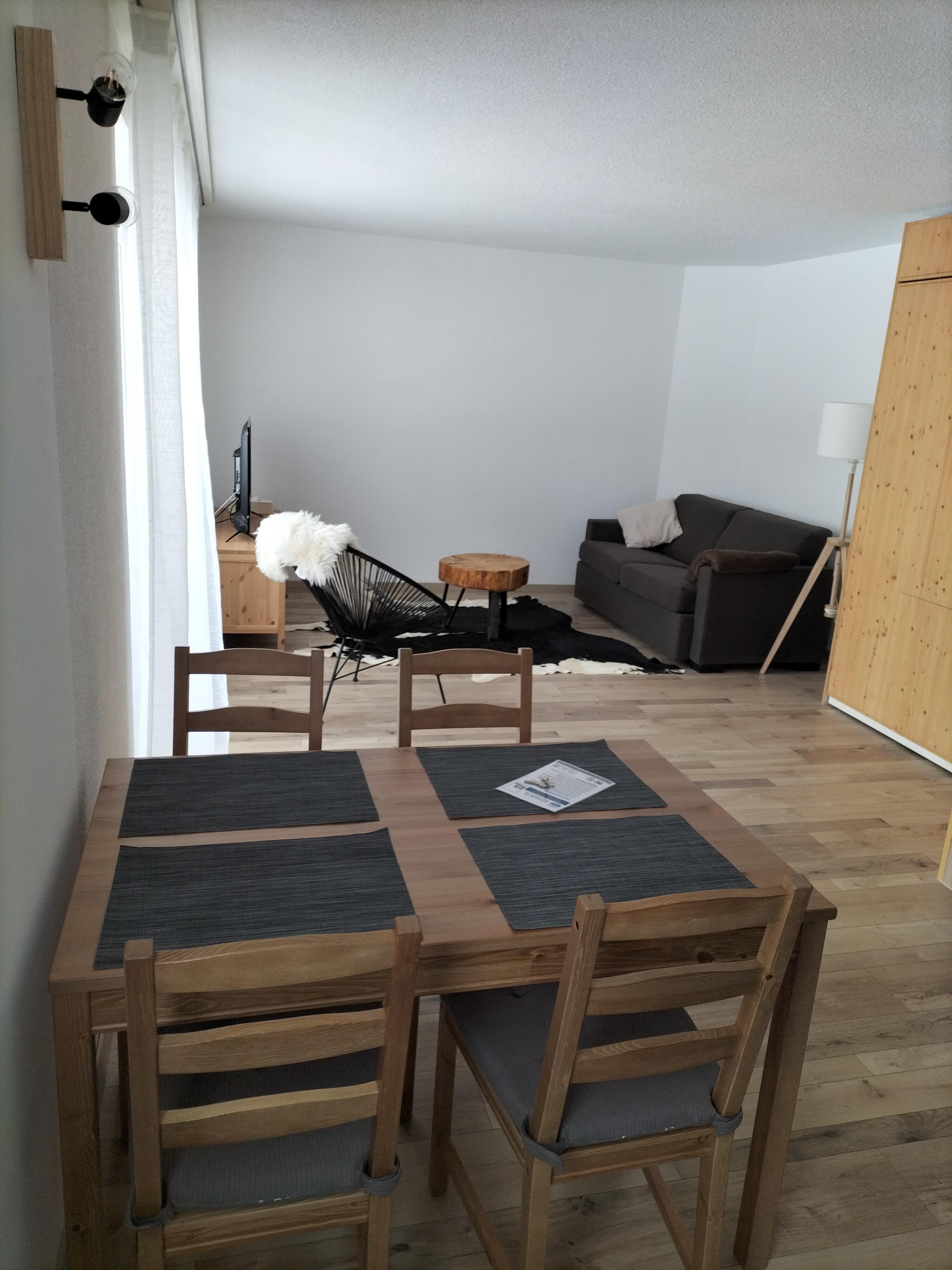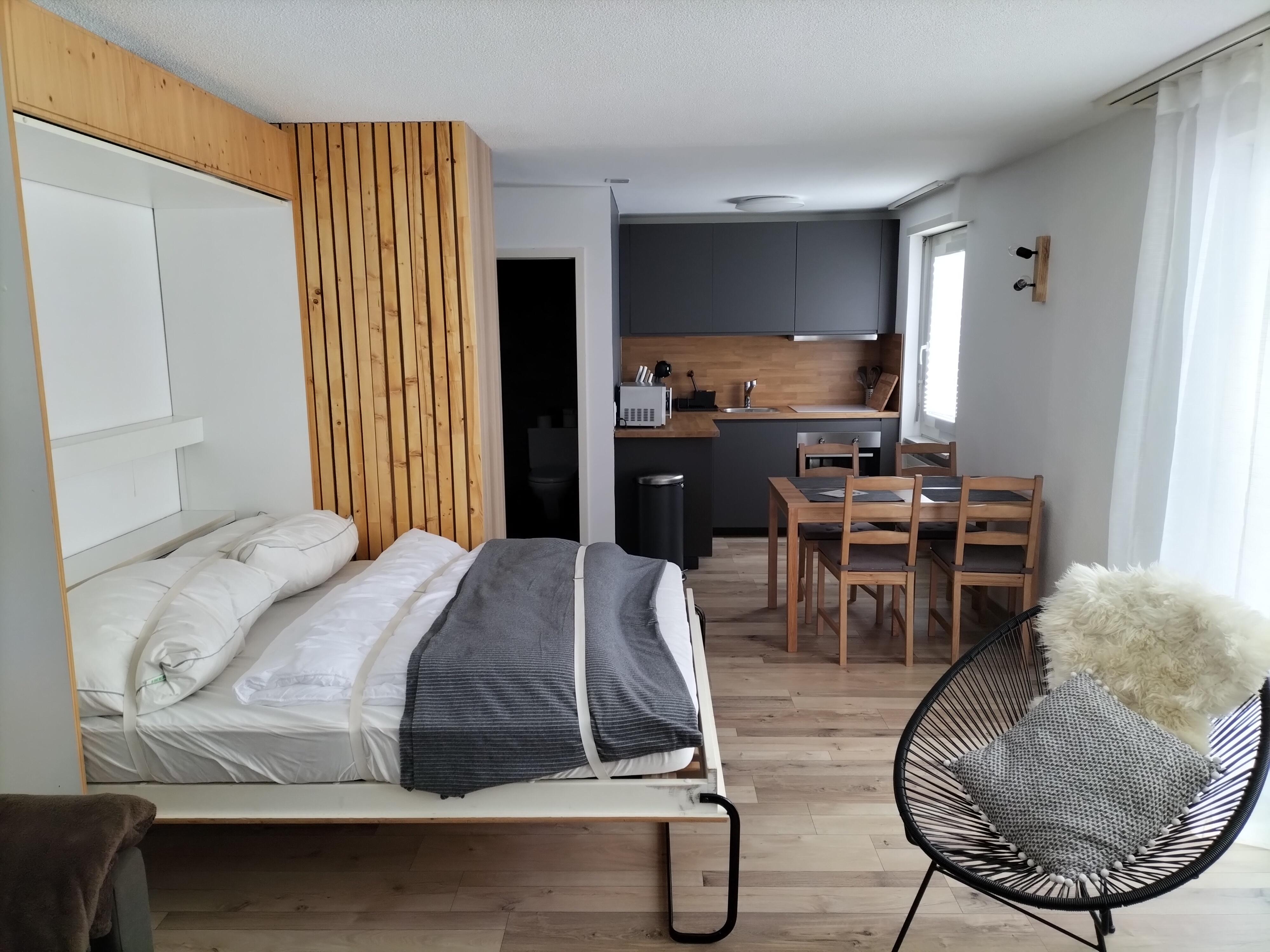 1-Zimmerwohnung: Wohn-/Esszimmer mit Doppel-Schrankbett und Sofabett, offene Küche, Dusche/WC, Essecke, Nordbalkon, Radio, TV, Wireless Internet gratis. Aussenparkplatz inklusive. Nichtraucherwohnung. Keine Haustiere erlaubt!