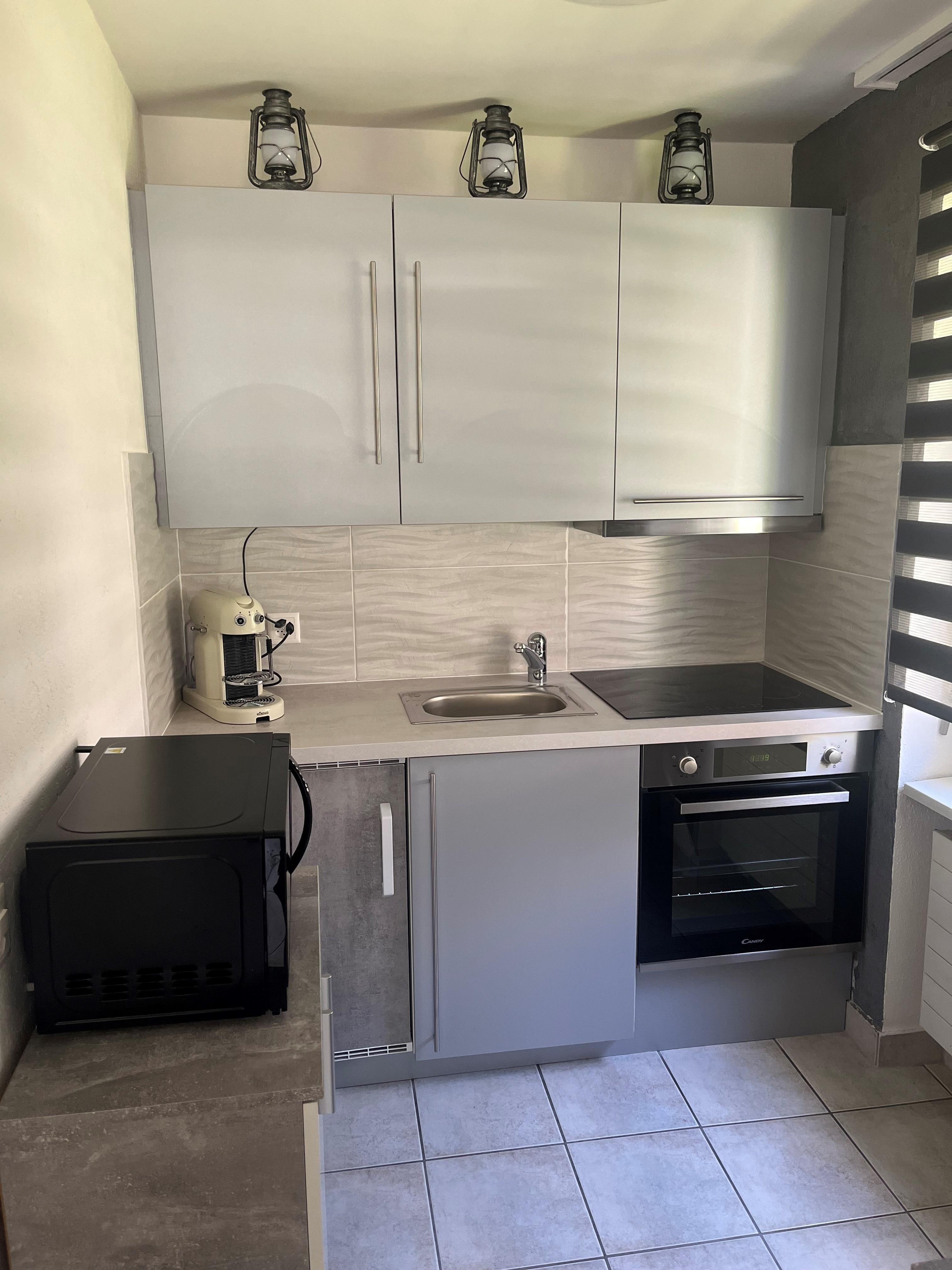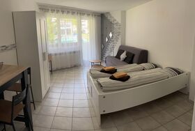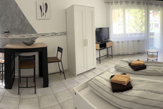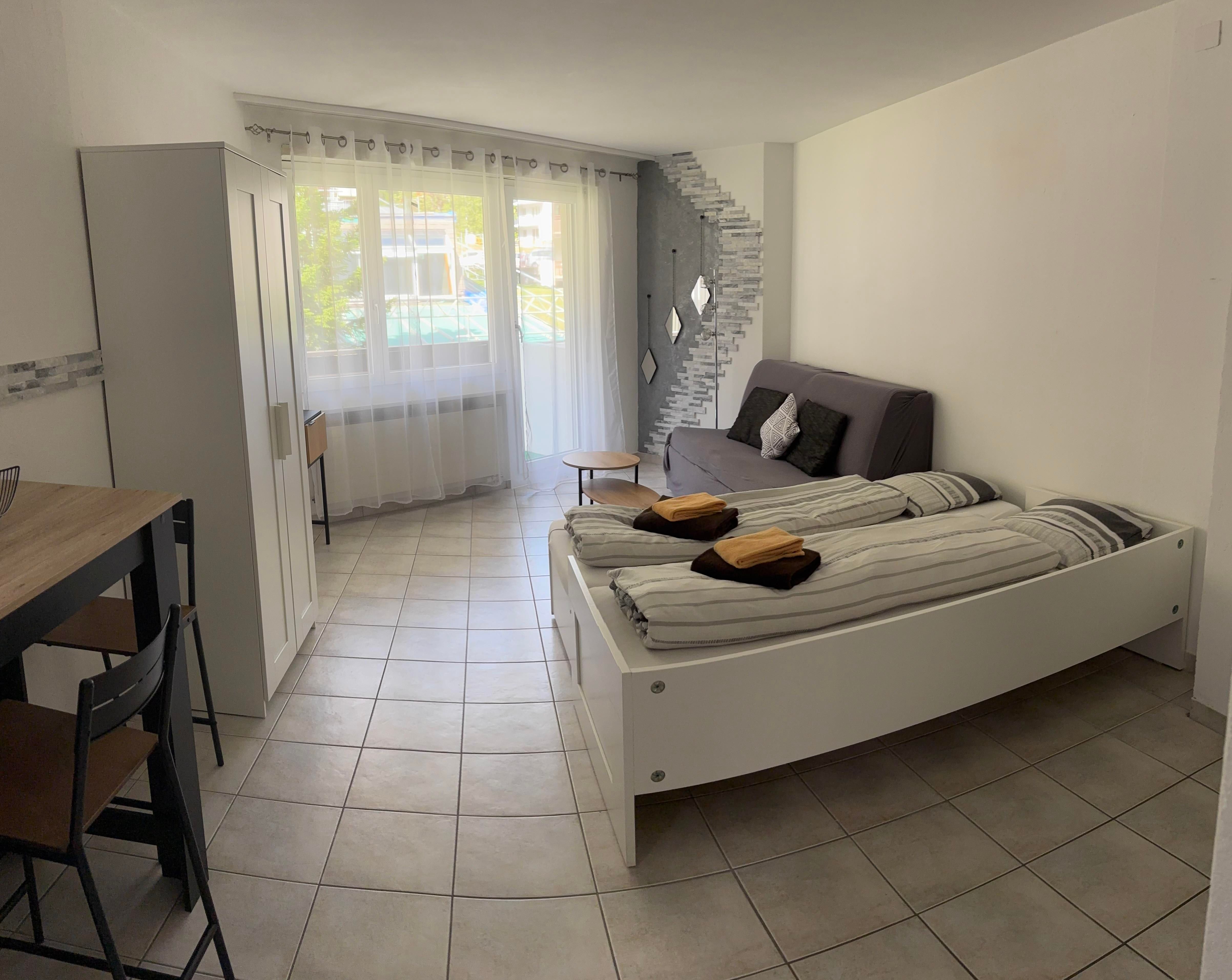 1-Zimmerwohnung: Wohn-/Ess-/Schlafzimmer mit 2 Betten, offene Küche mit Mikrowelle, Dusche/WC, Nord-Balkon, Radio, TV, Wireless Internet gratis. Nichtraucherwohnung. Haustiere nicht erlaubt. Garage im Haus inklusive.
