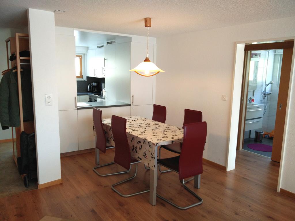 3-Zimmerwohnung, renoviert 2015: Grosses Wohnzimmer mit Essbereich, TV, Radio, gratis W-Lan, moderne offene Küche mit Geschirrspüler und Microwelle, 1 Schlafzimmer mit Doppelbett, 1 Schlafzimmer mit 1 Einzelbett und 1 Etagenbett, Dusche/WC, zusätzliches separates WC, Süd-Balkon mit Blick auf die Berge. Garage im Haus inklusive. Nichtraucher-Wohnung. Haustiere sind nicht erlaubt.