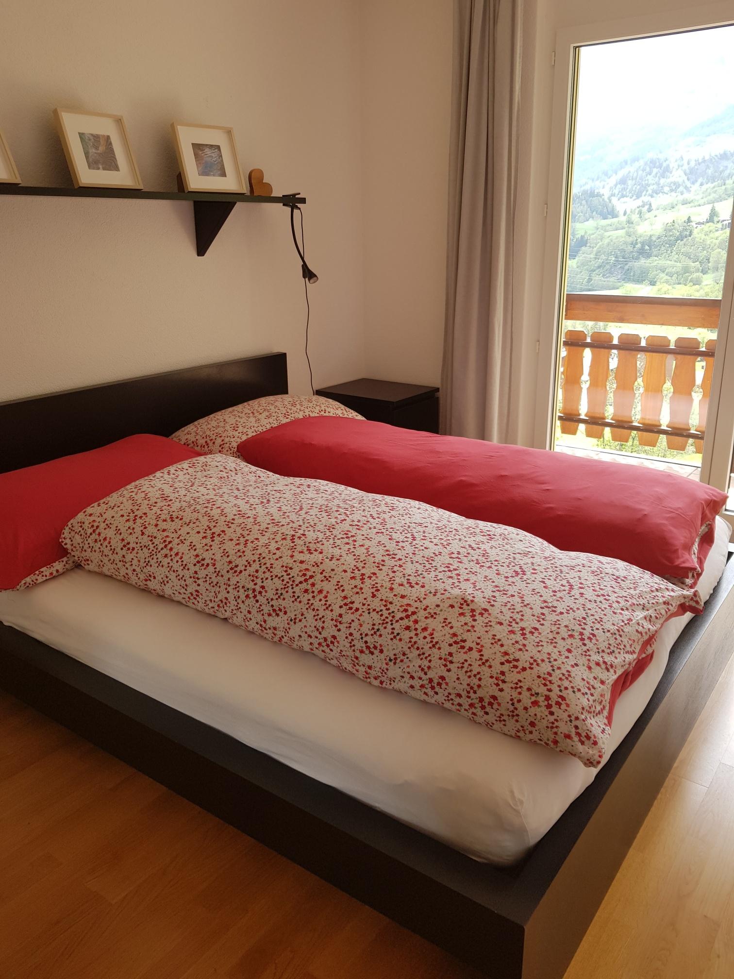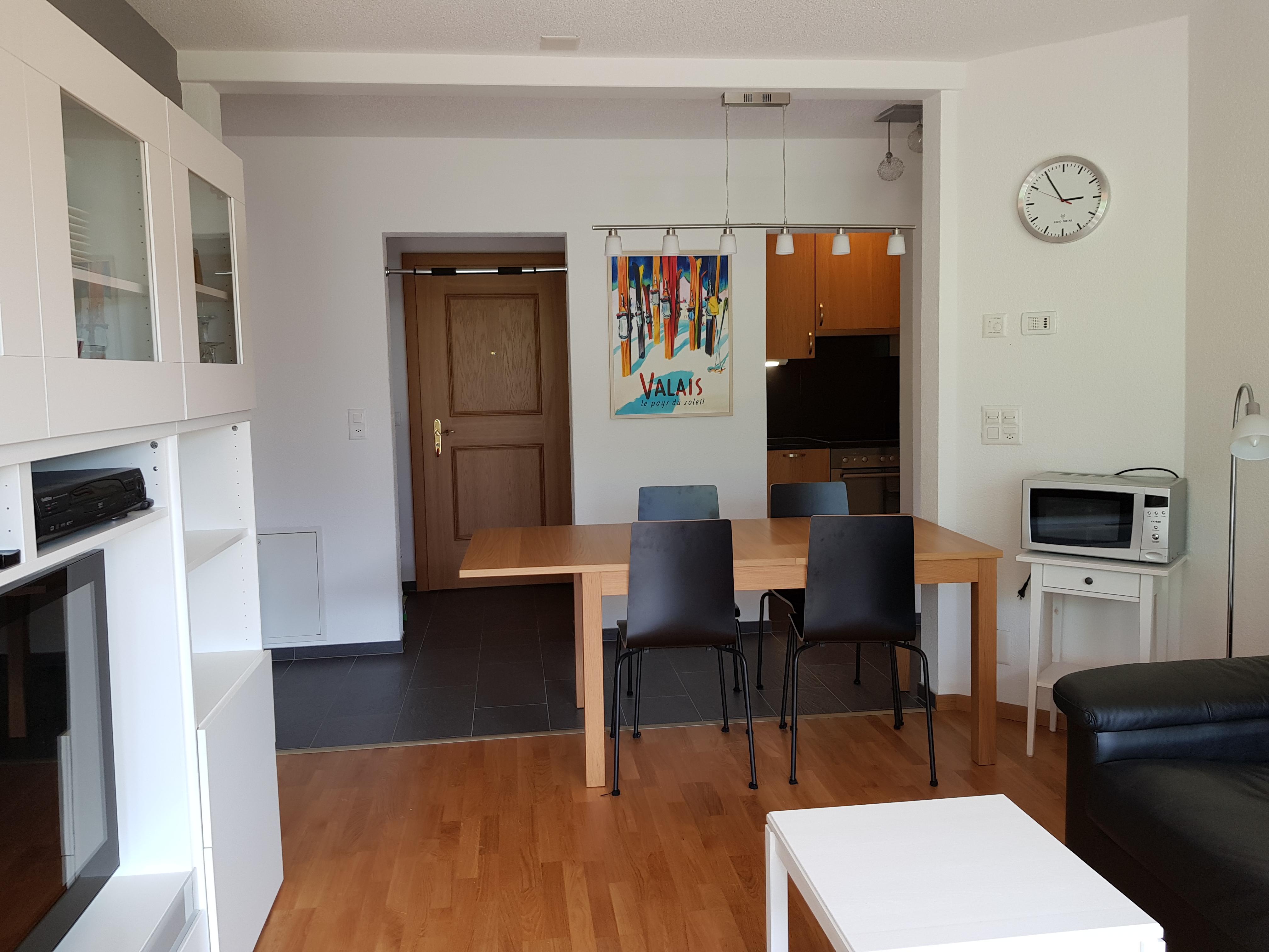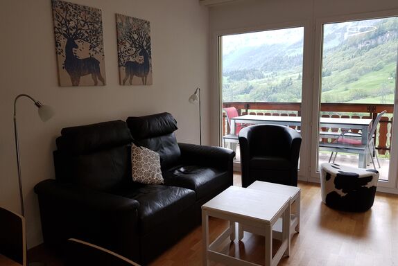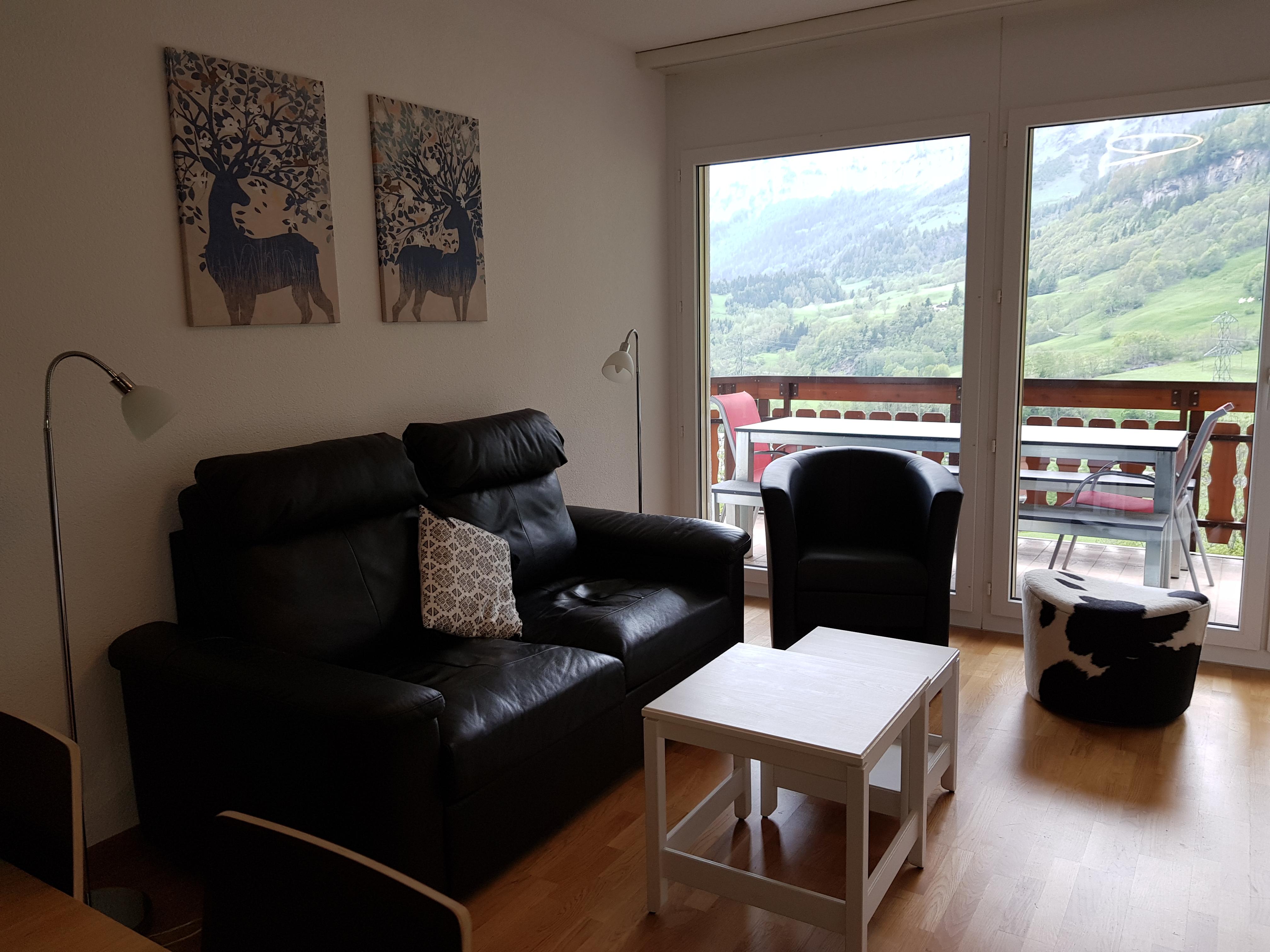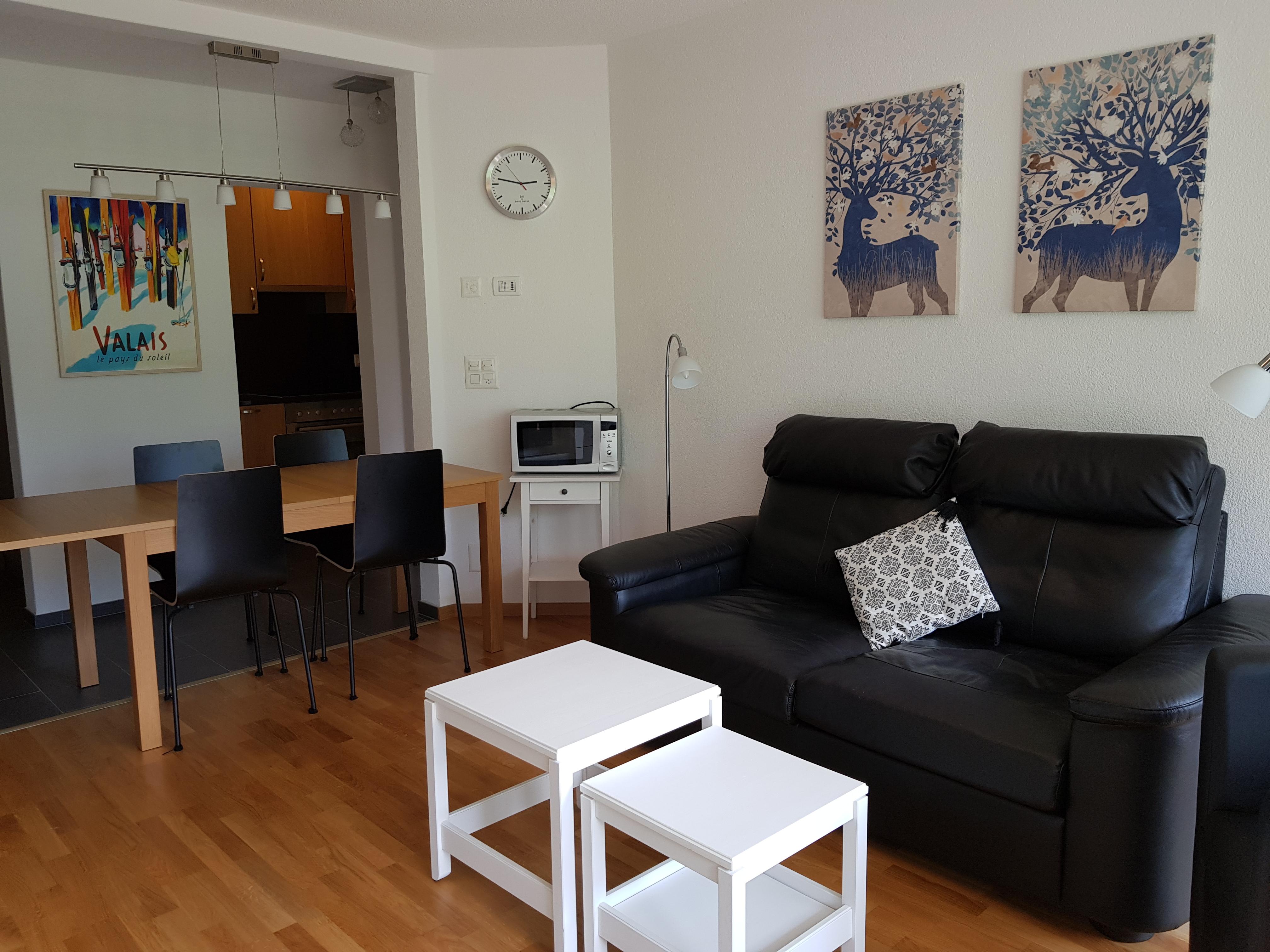Moderne 3-Zimmerwohnung (60 m2) im 2.Stock, offene Küche mit Geschirrspüler, Nespresso-Kaffeemaschine, Mikrowelle, Wohnzimmer mit TV, Radio/DVD, Gratis-WLAN, 1 Doppelschlafzimmer, 1 Schlafzimmer mit 2 Einzelbetten, Dusche/WC, grosser Süd-West-Balkon mit Panoramasicht, ruhige Lage, Lift, Ski- & Veloraum. In nächster Nähe: Kinderspielplatz, Torrentbahnen (5 Gehminuten), Thermalbäder, Bushaltestelle, Dorfzentrum. Garage zu mieten im Haus. Nichtraucherwohnung. Haustiere sind nicht erlaubt.