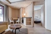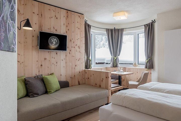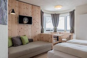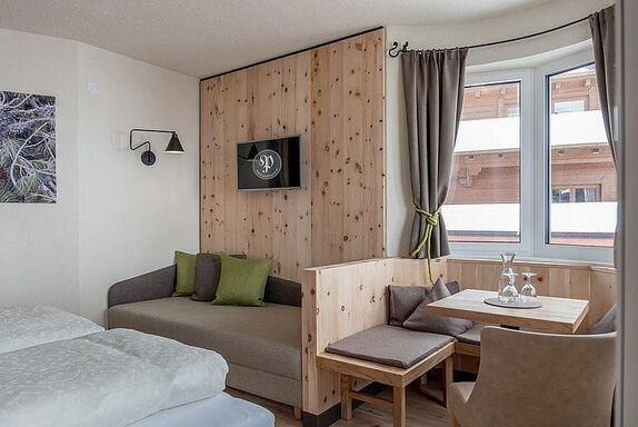 Neu errichtetes Erkerzimmer mit exclusiven Möbeln aus Zirbenholz und dekorativen Wollstoffen aus dem Ötztal. Gemütliches Doppelzimmer mit Sitzecke im Erker und bequemes Schlafsofa für eine 3. Person, Eichenholzböden, Safe, HD-Flat-TV, Kühlschrank, Balkon. Badezimmer mit Badewanne, Überkopfbrause, Fenster ins Freie, Föhn, Kosmetikspiegel und Pflegeprodukte. Separates WC. Größe ca. 28 m²